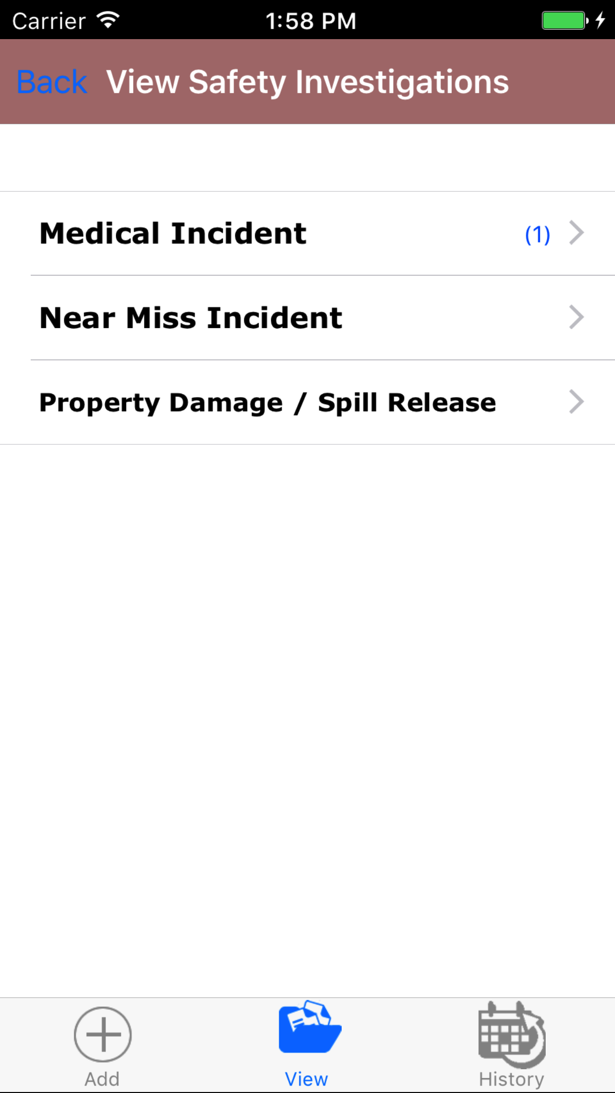 - Tap on the Safety Investigation you would like to view. This loads the first tab, the Safety Investigation details tab of the History view.