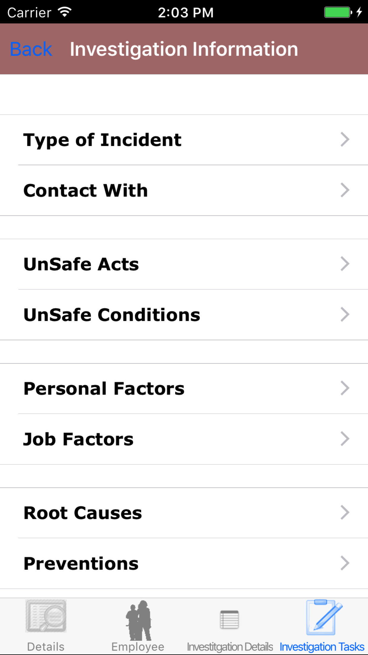 with the list of the 8 checklist categories of the safety investigation. Tap on each category to view the investigation tasks.