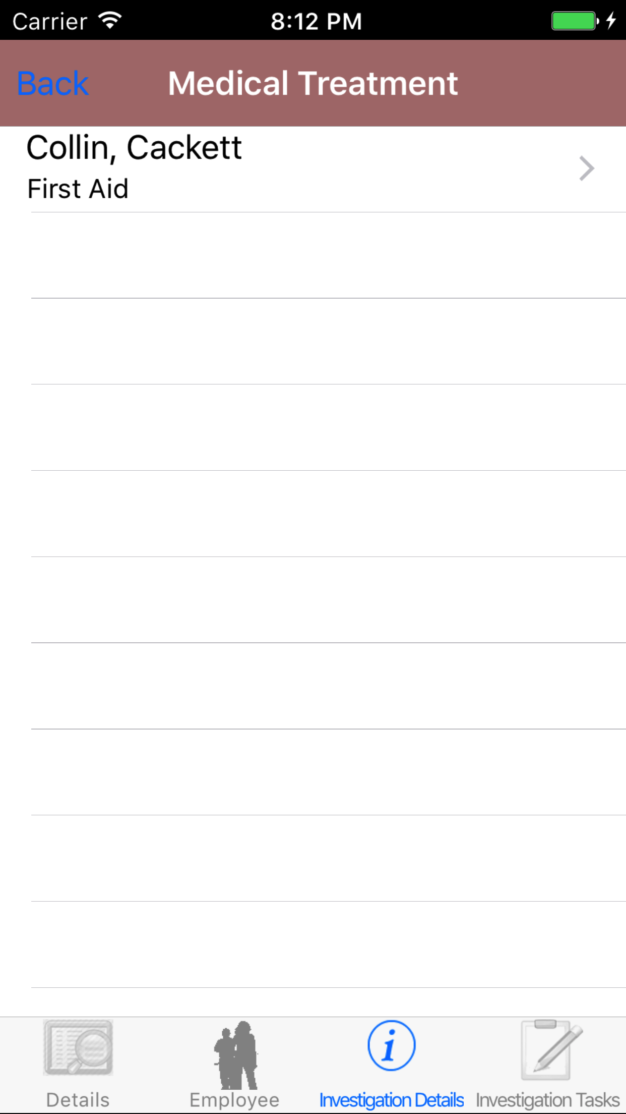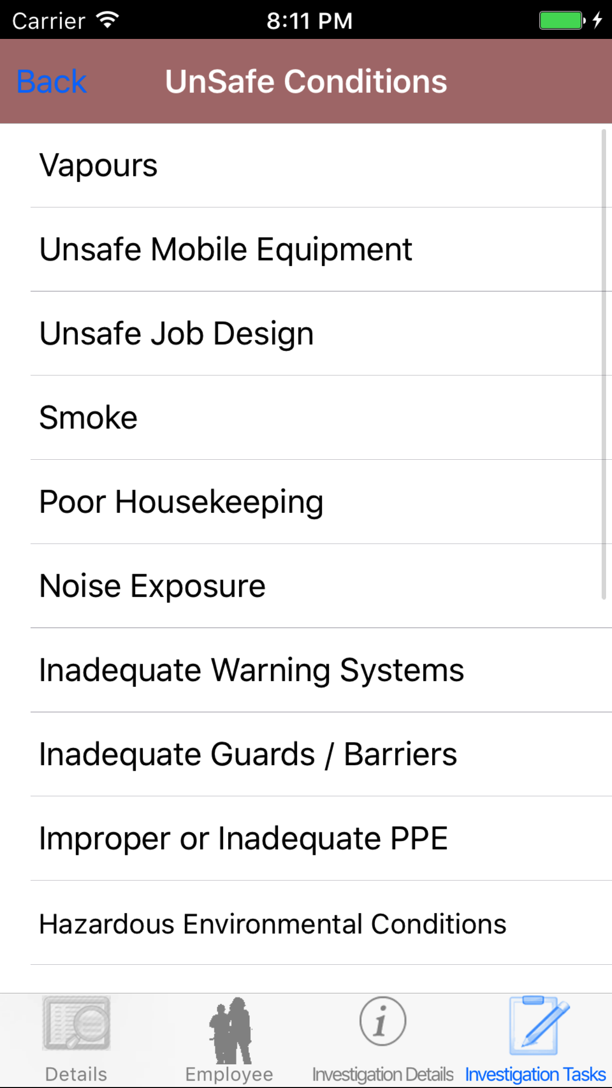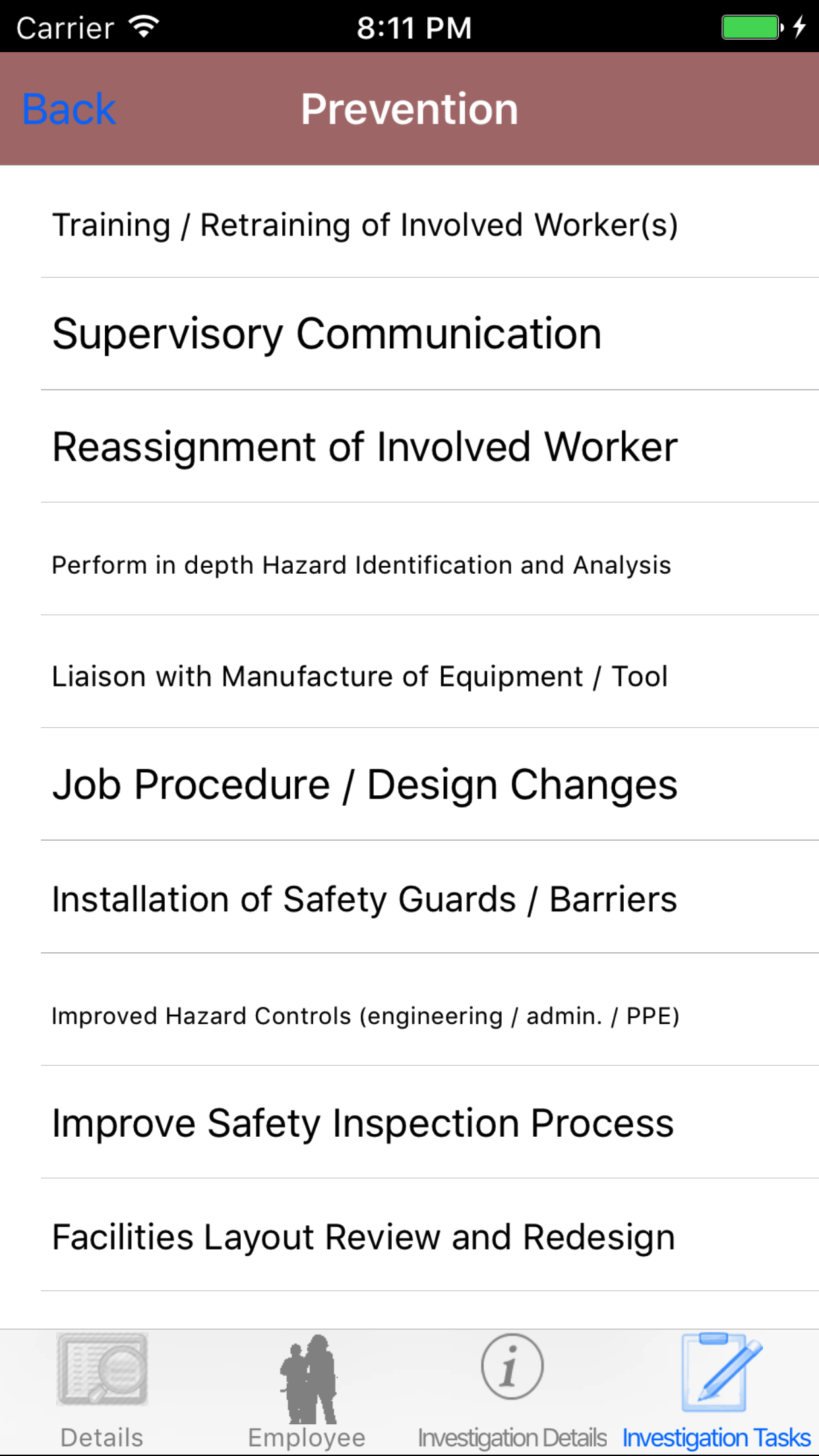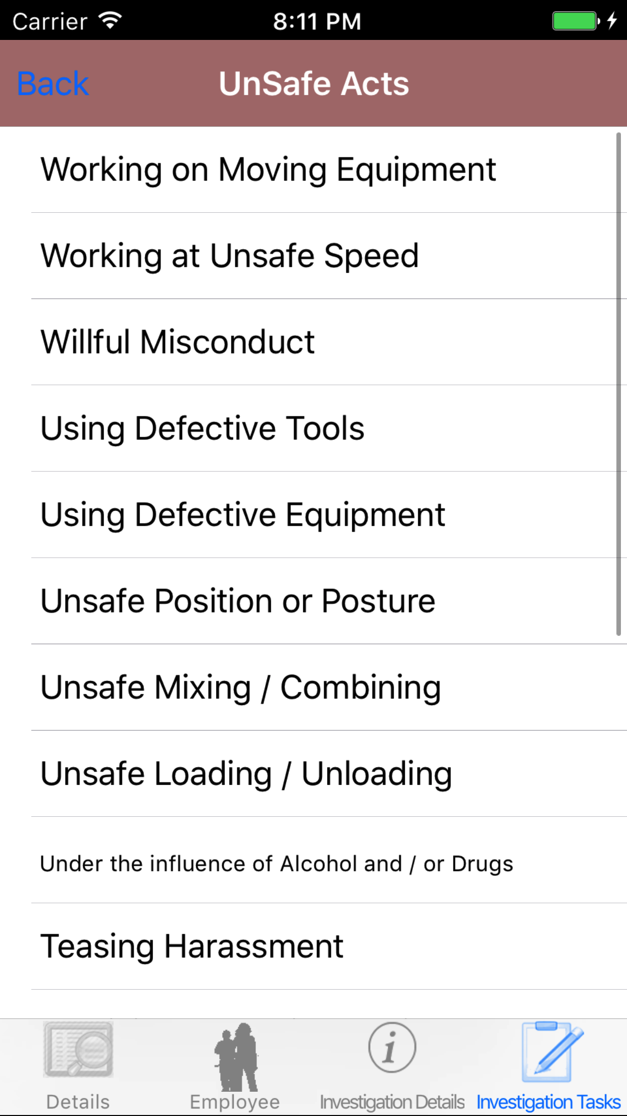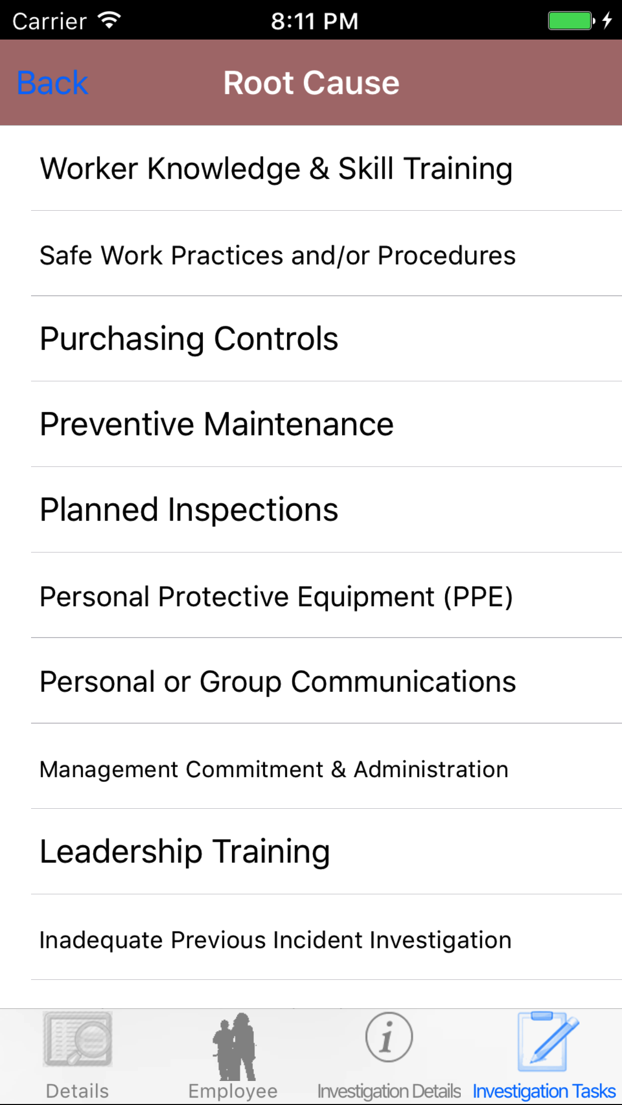 - Tap the desired employee to select it or tap Back in the top left corner to leave the Employee field unchanged and return to the Edit Safety Investigation screen.