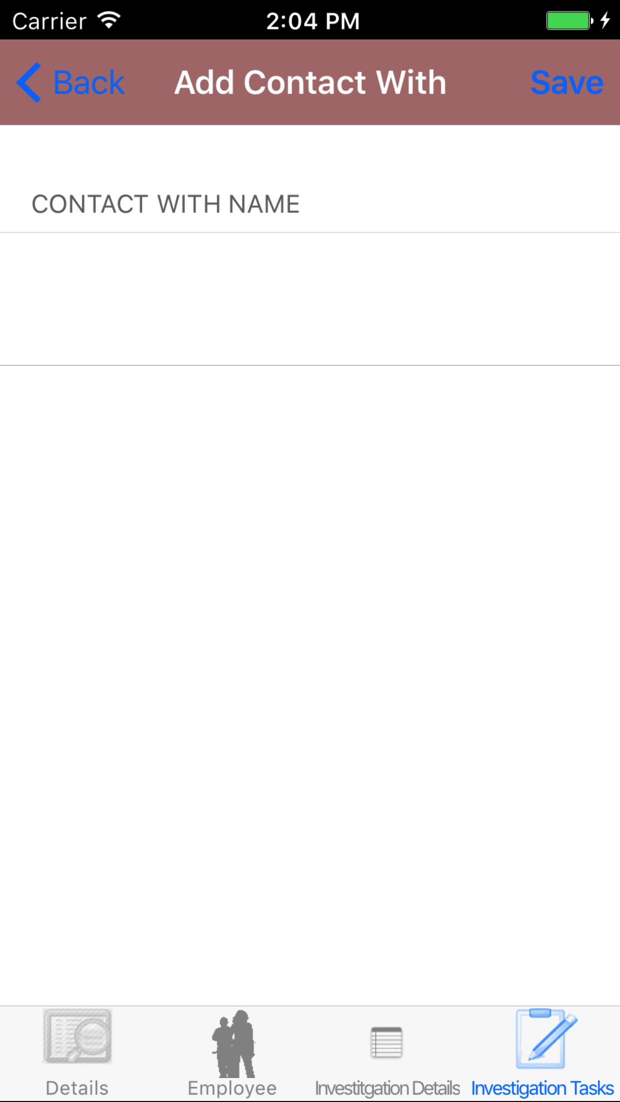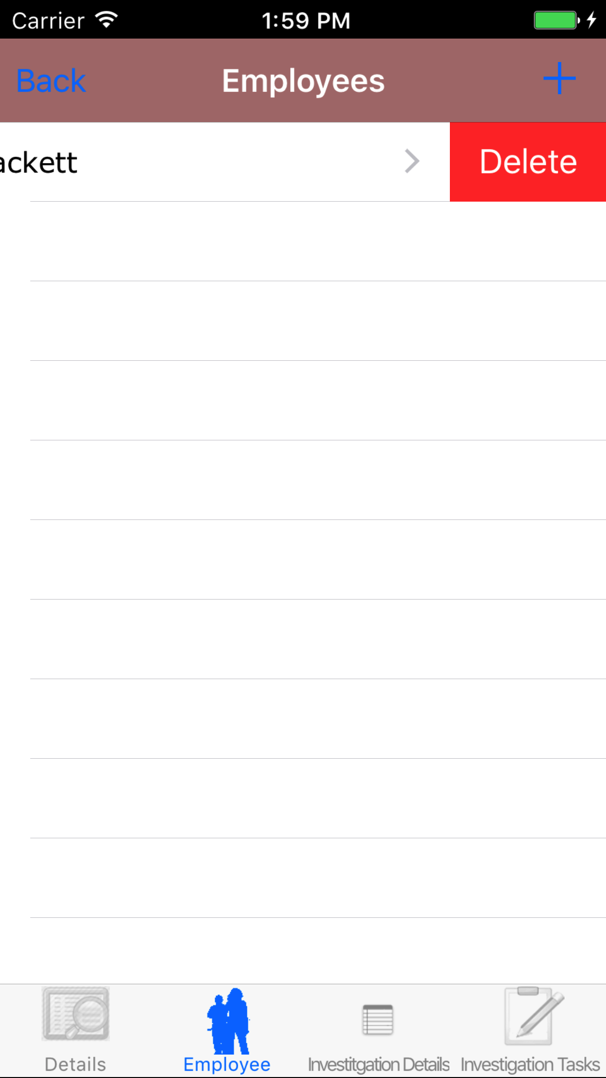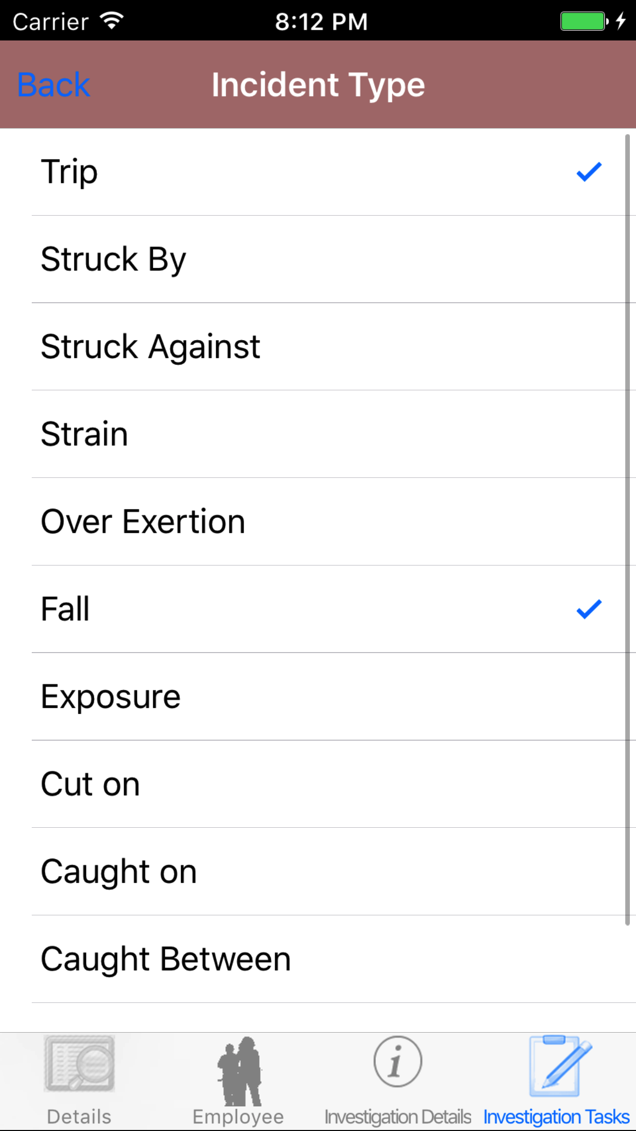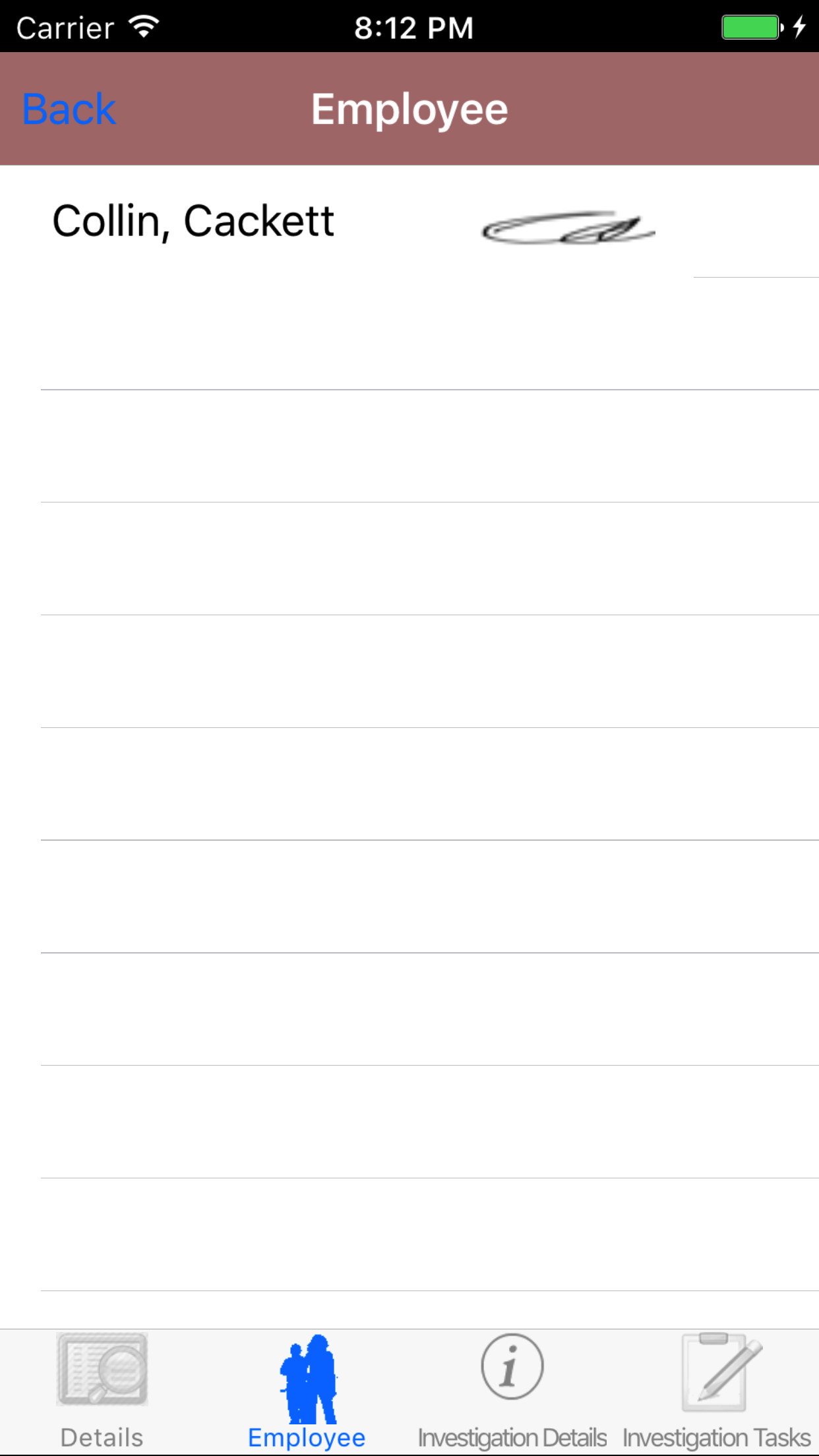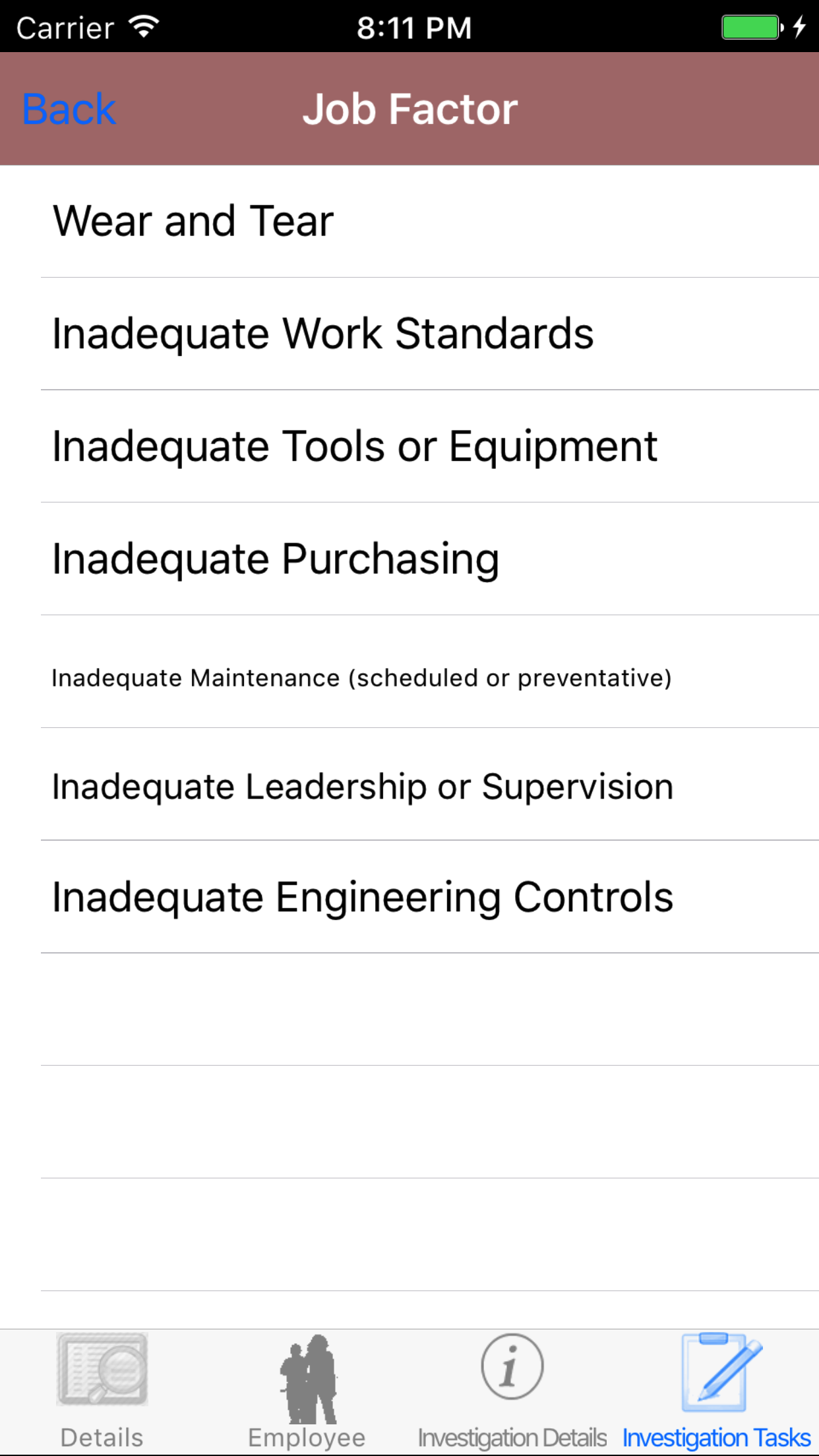- Tap the desired employee to select it or tap Back in the top left corner to leave the Employee field unchanged and return to the Edit Safety Investigation screen.
