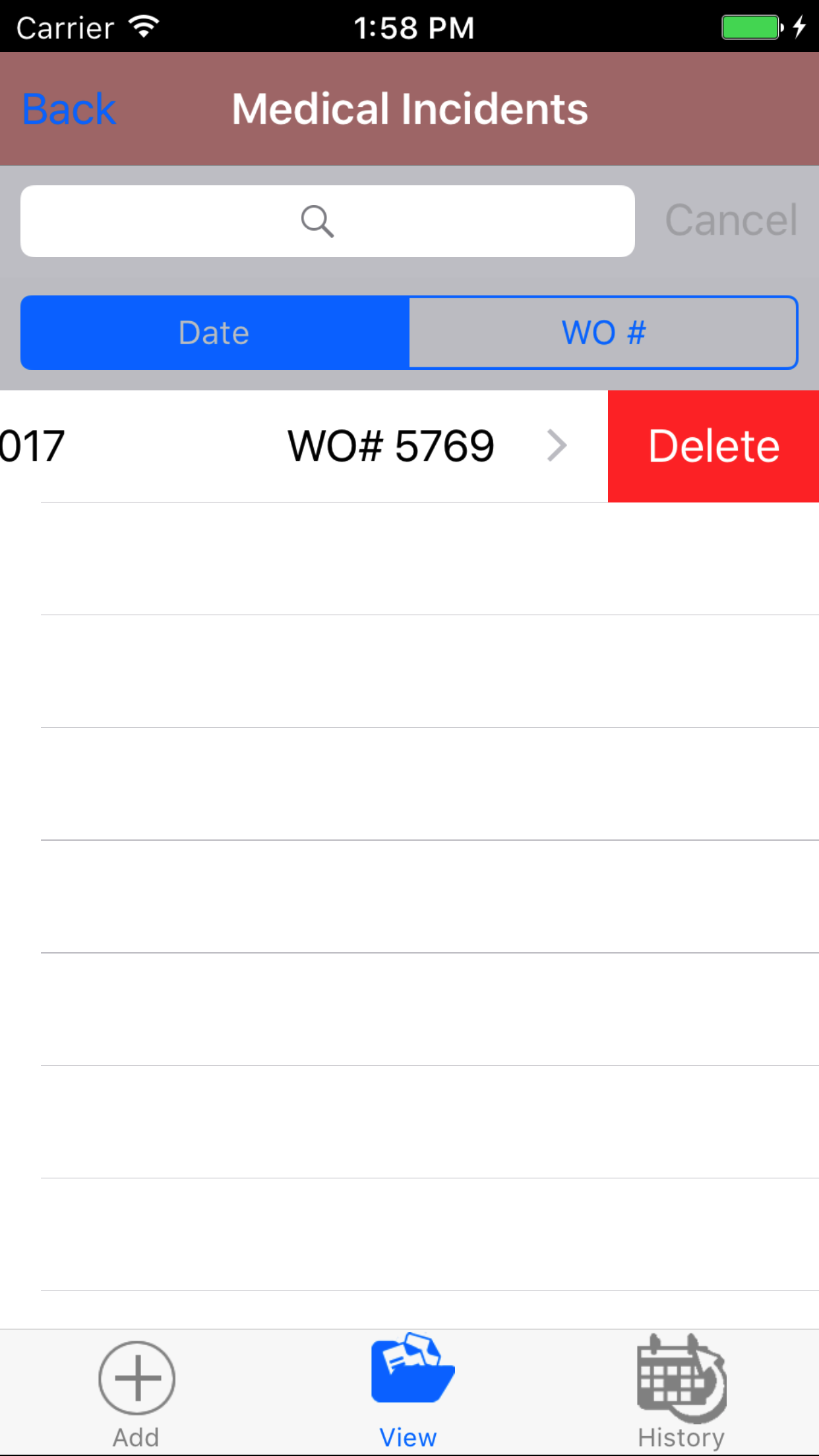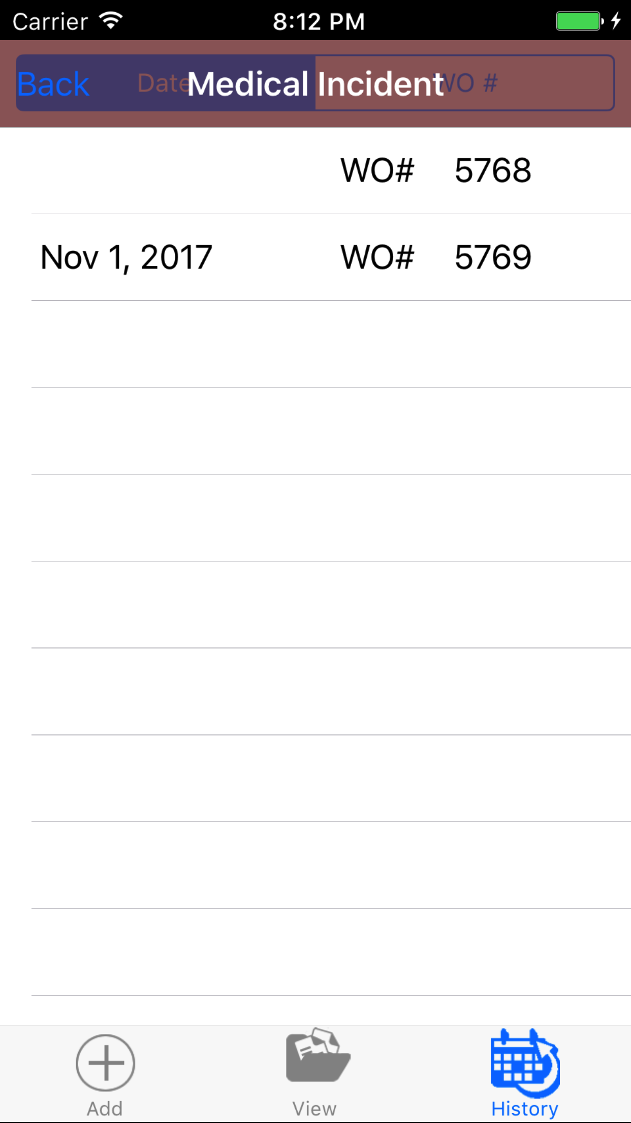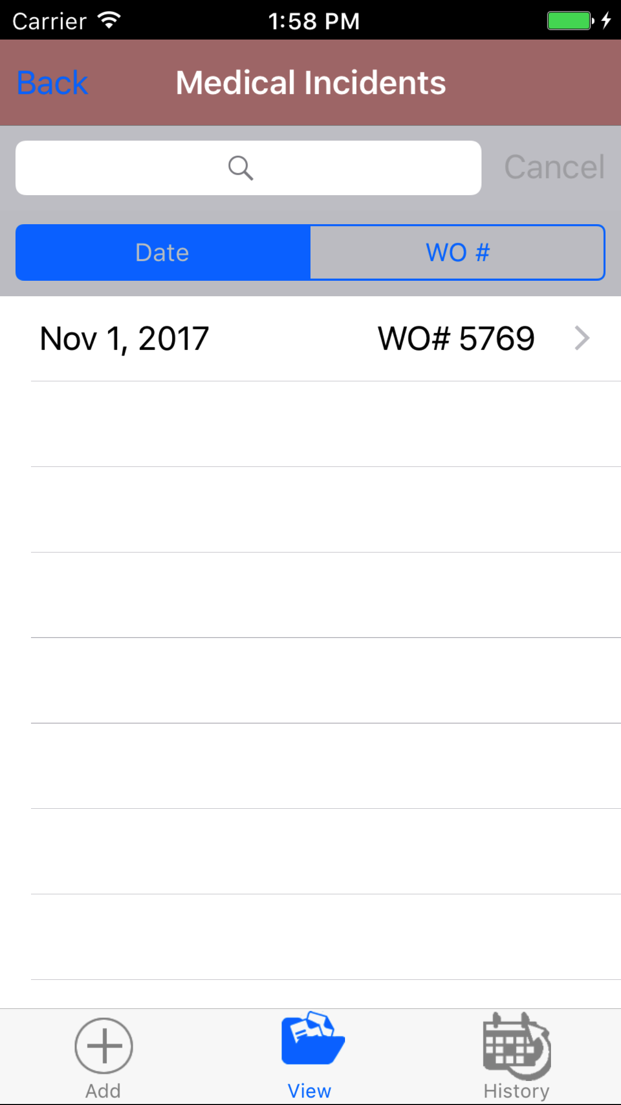 - Tap the desired work order to select it or tap Back in the top left corner to leave the Work Order # field unchanged and return to the Add Safety Investigation screen.