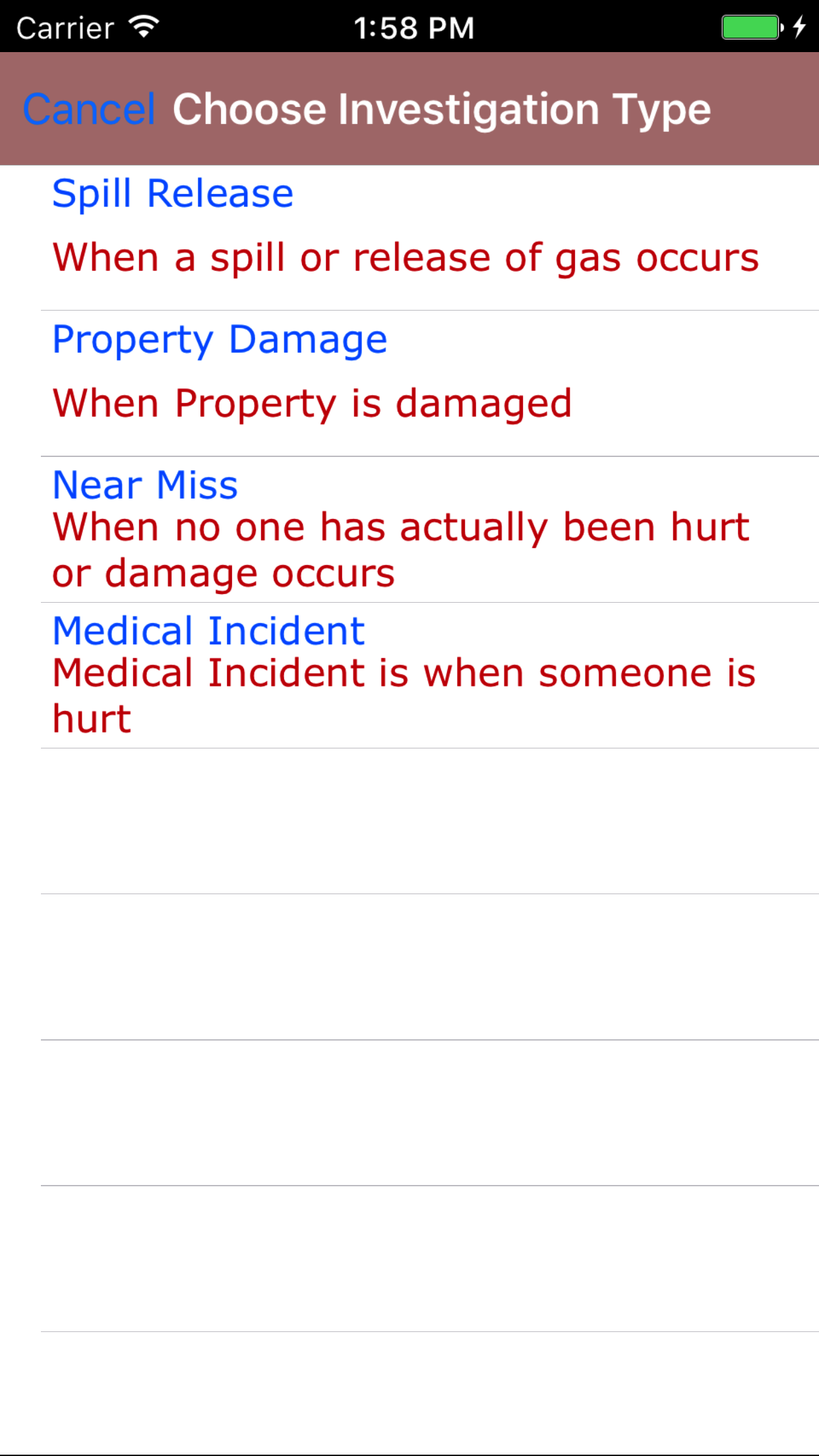 - Tap the Investigation Type field to open the Choose Investigation Type screen.