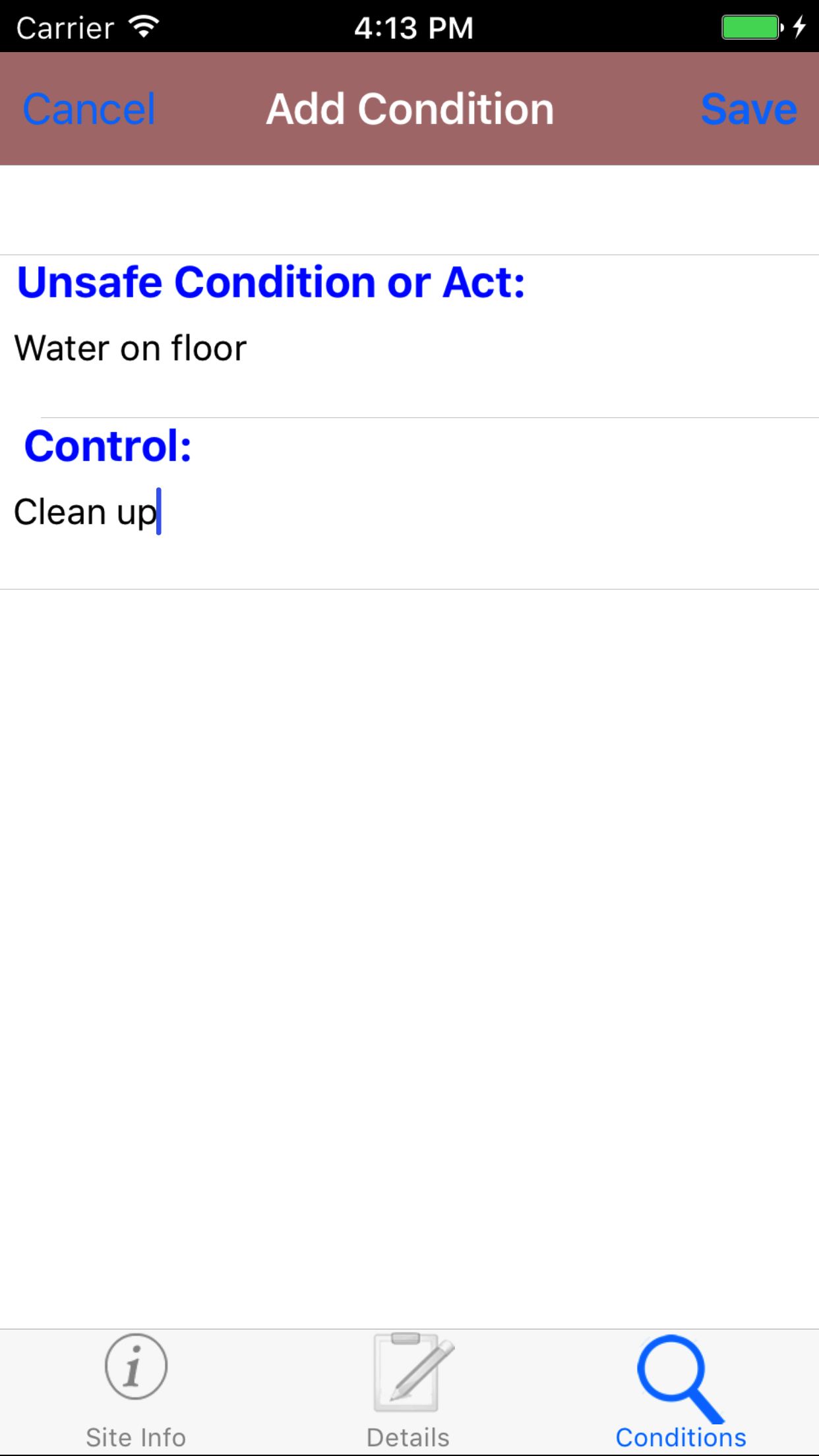 Conditions Found are the the unsafe acts or unsafe conditions that may occur on a job site. For each condition found on the site inspection, users should include