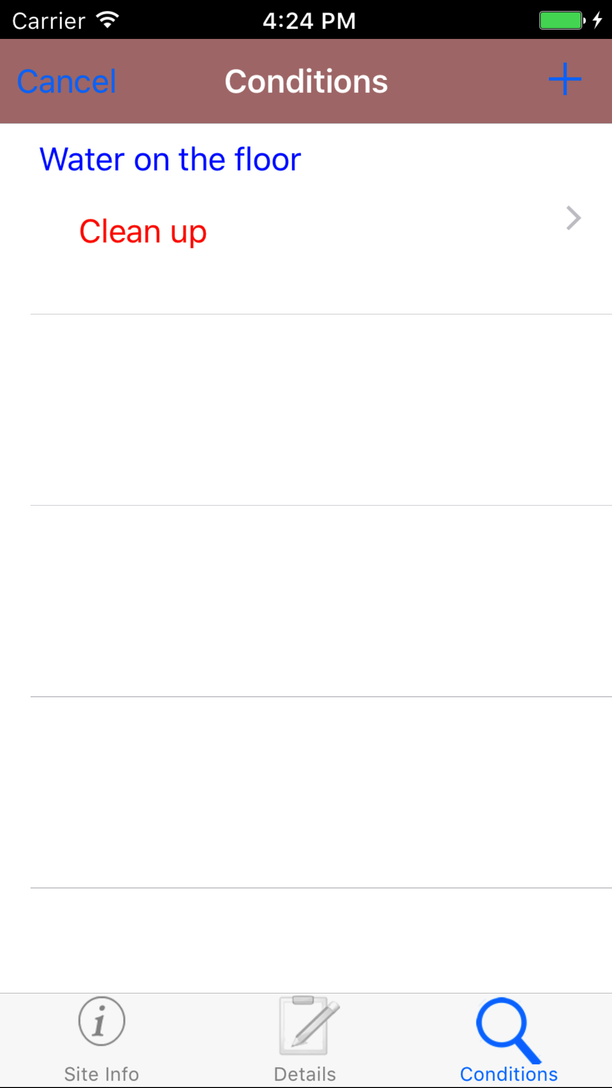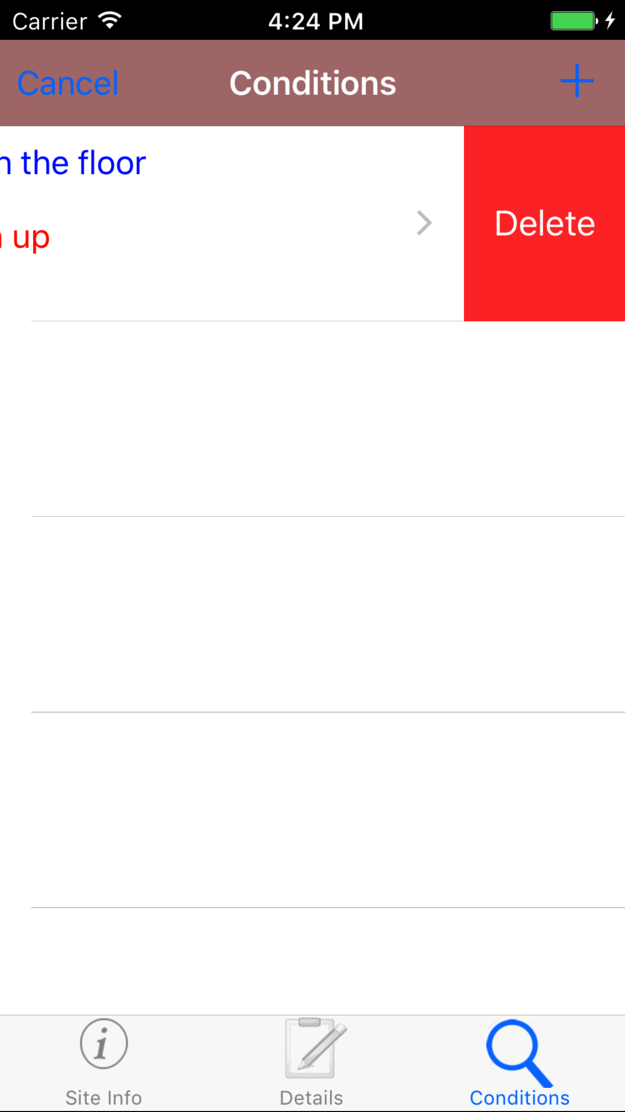 - Tap the + icon in the top right corner to open the Add Condition Found screen.