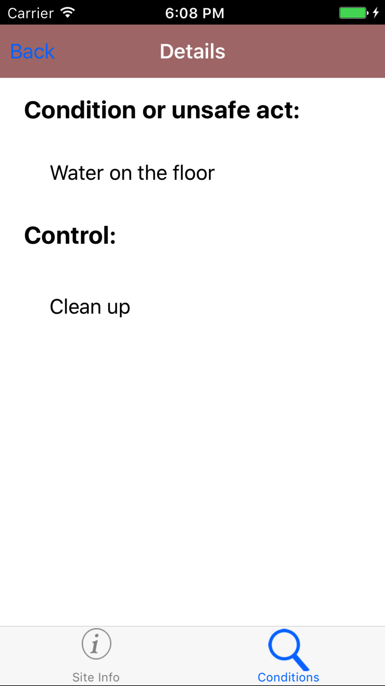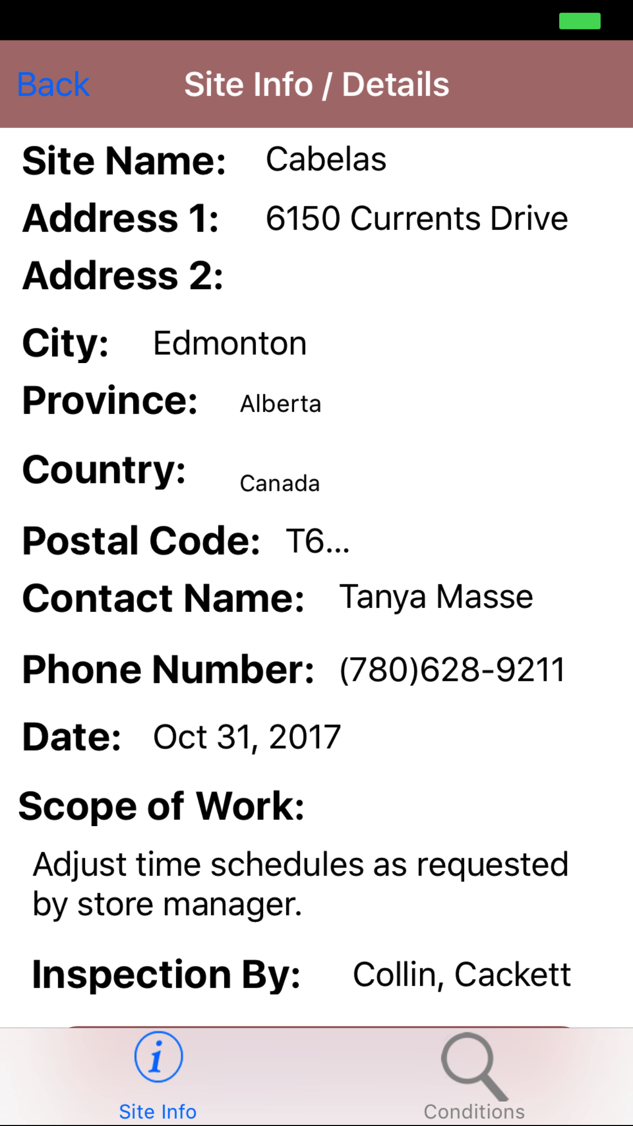 - Tap the second tab, the conditions found tab of the History view. This loads with the conditions found of the Site Inspection.