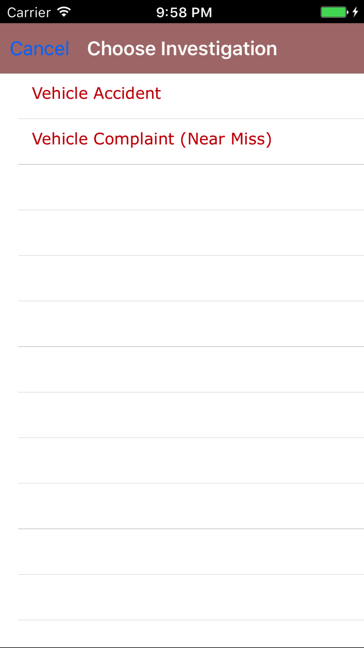 - Return to the Add Vehicle Investigation screen by either tapping Save in the top right corner to select the highlighted work order or tapping Cancel in the top left corner to leave the Investigation Type field unchanged.