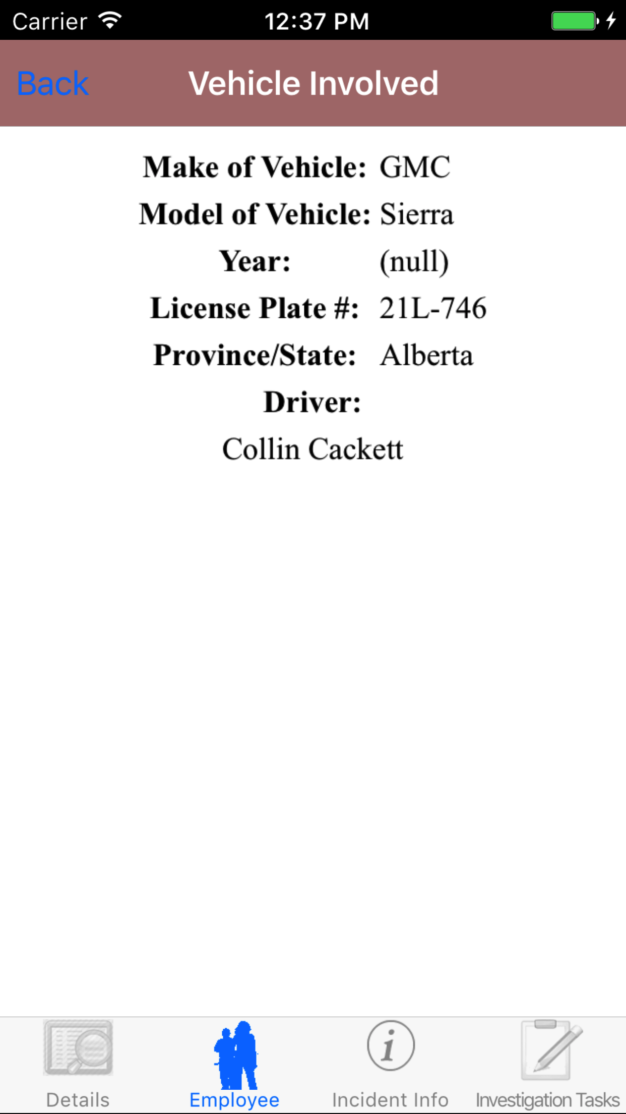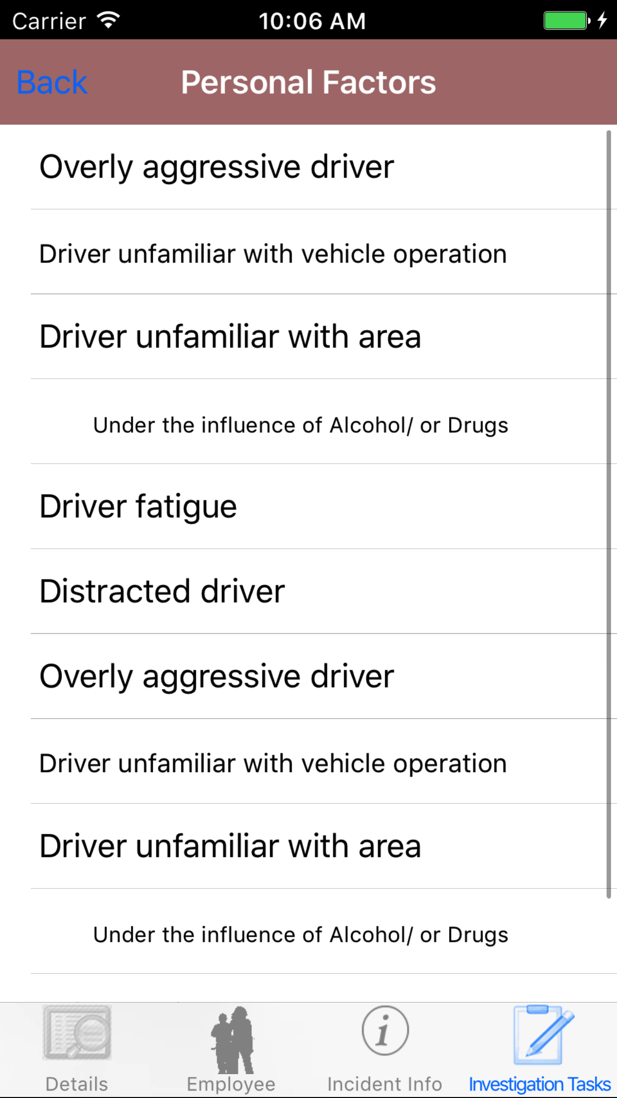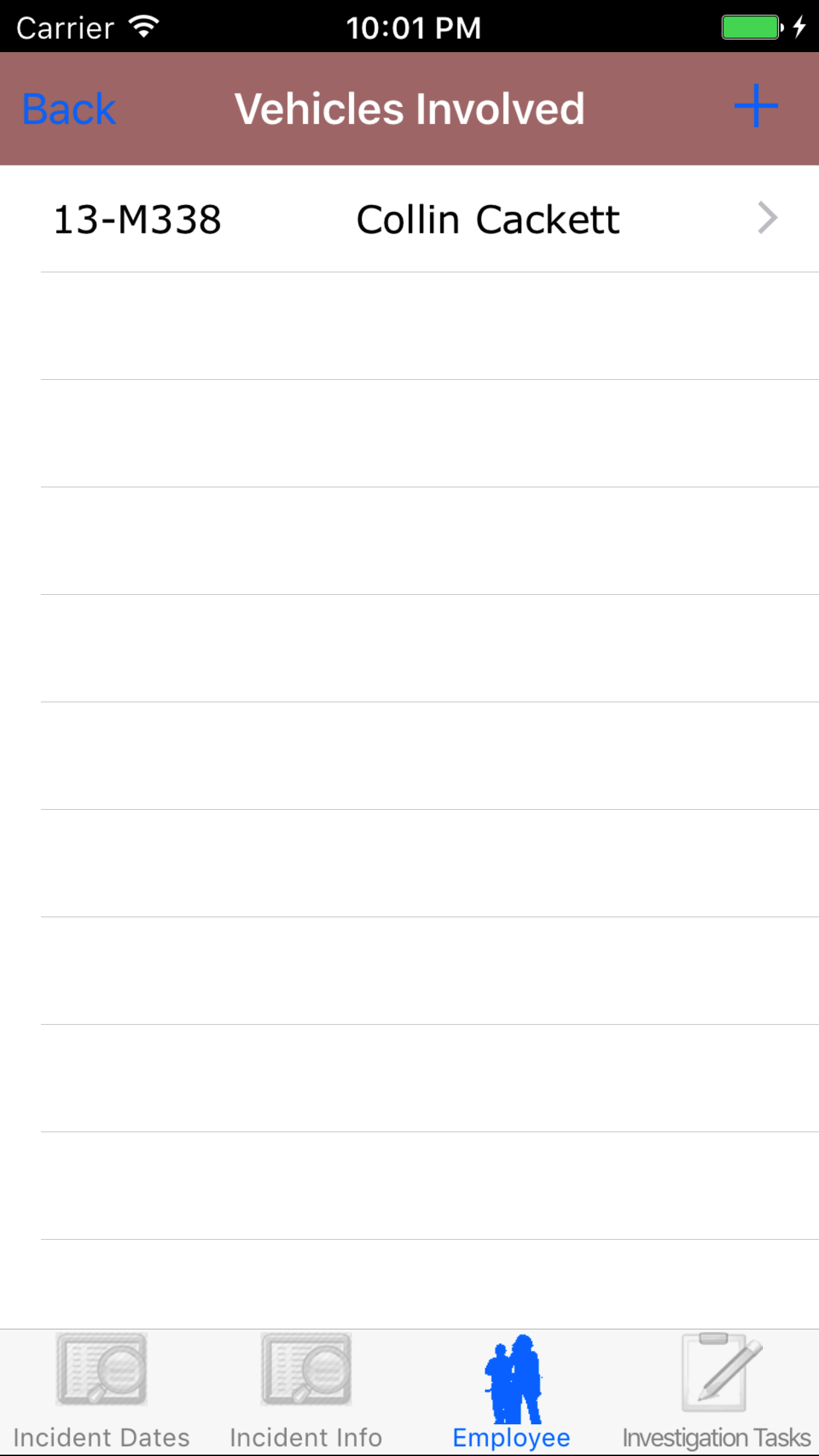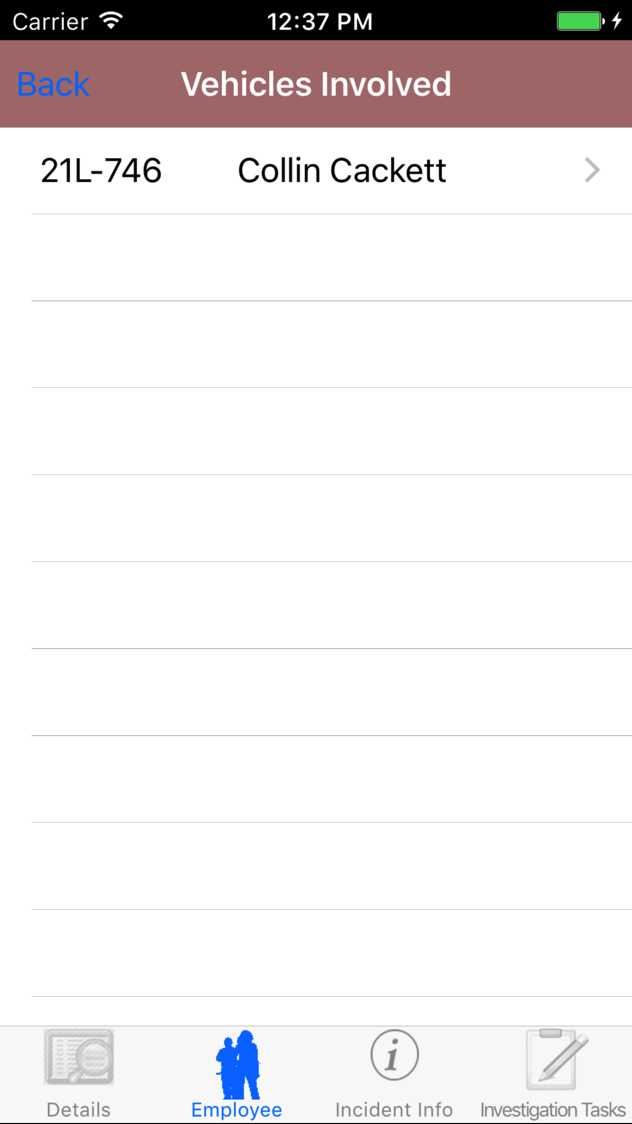 - Tap the desired employee to select it or tap Back in the top left corner to leave the Employee field unchanged and return to the Edit Vehicle Investigation screen.