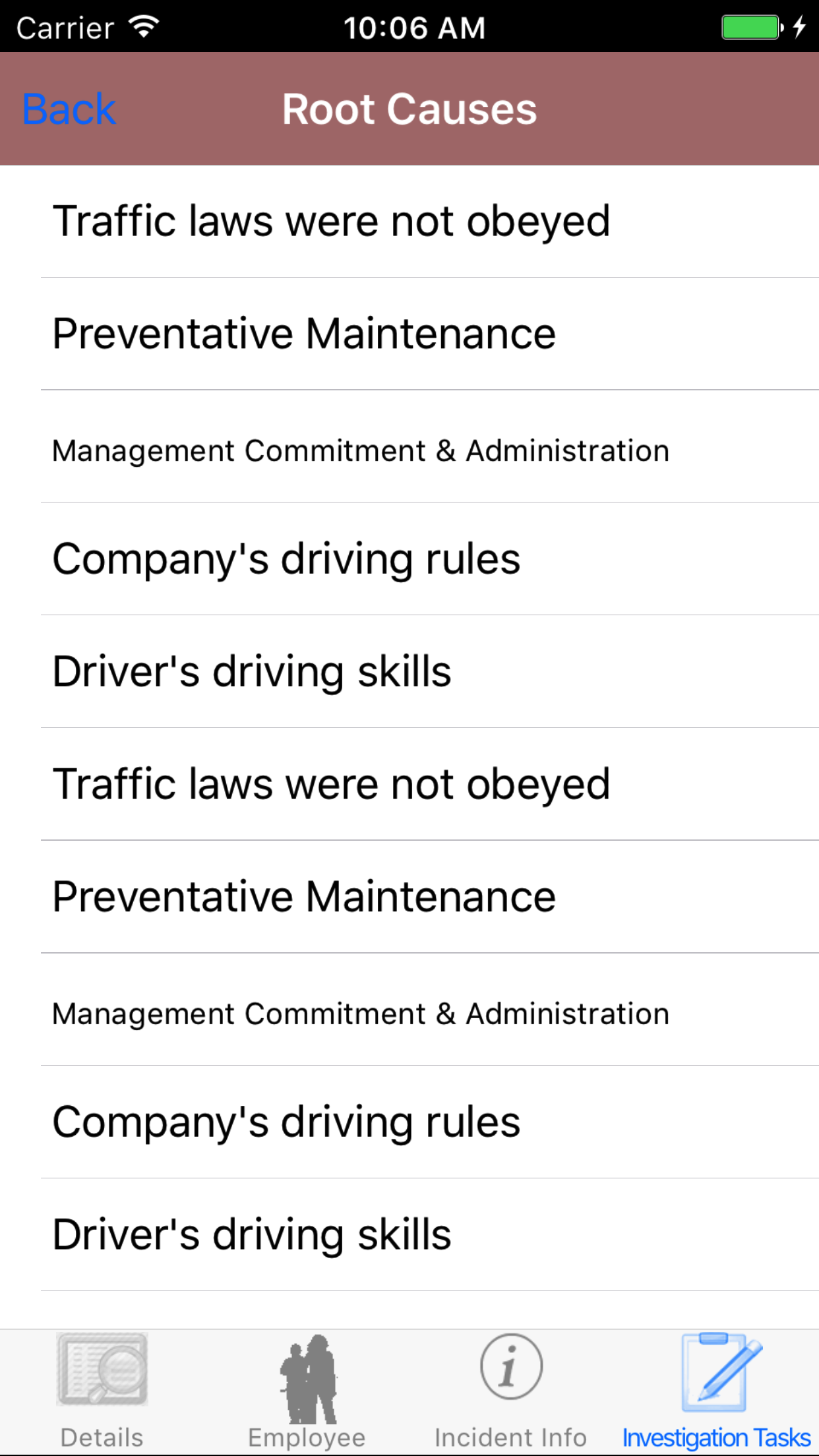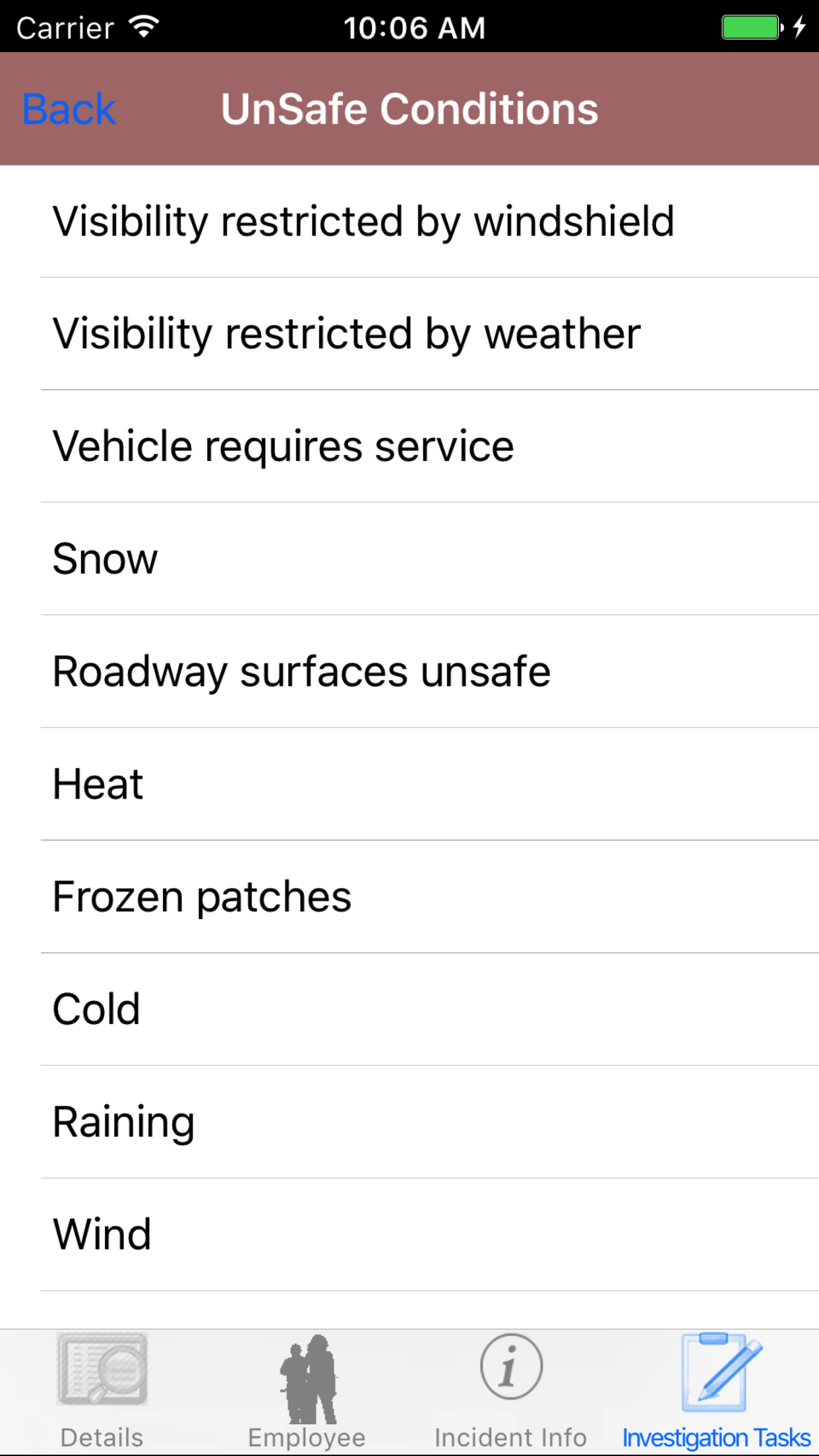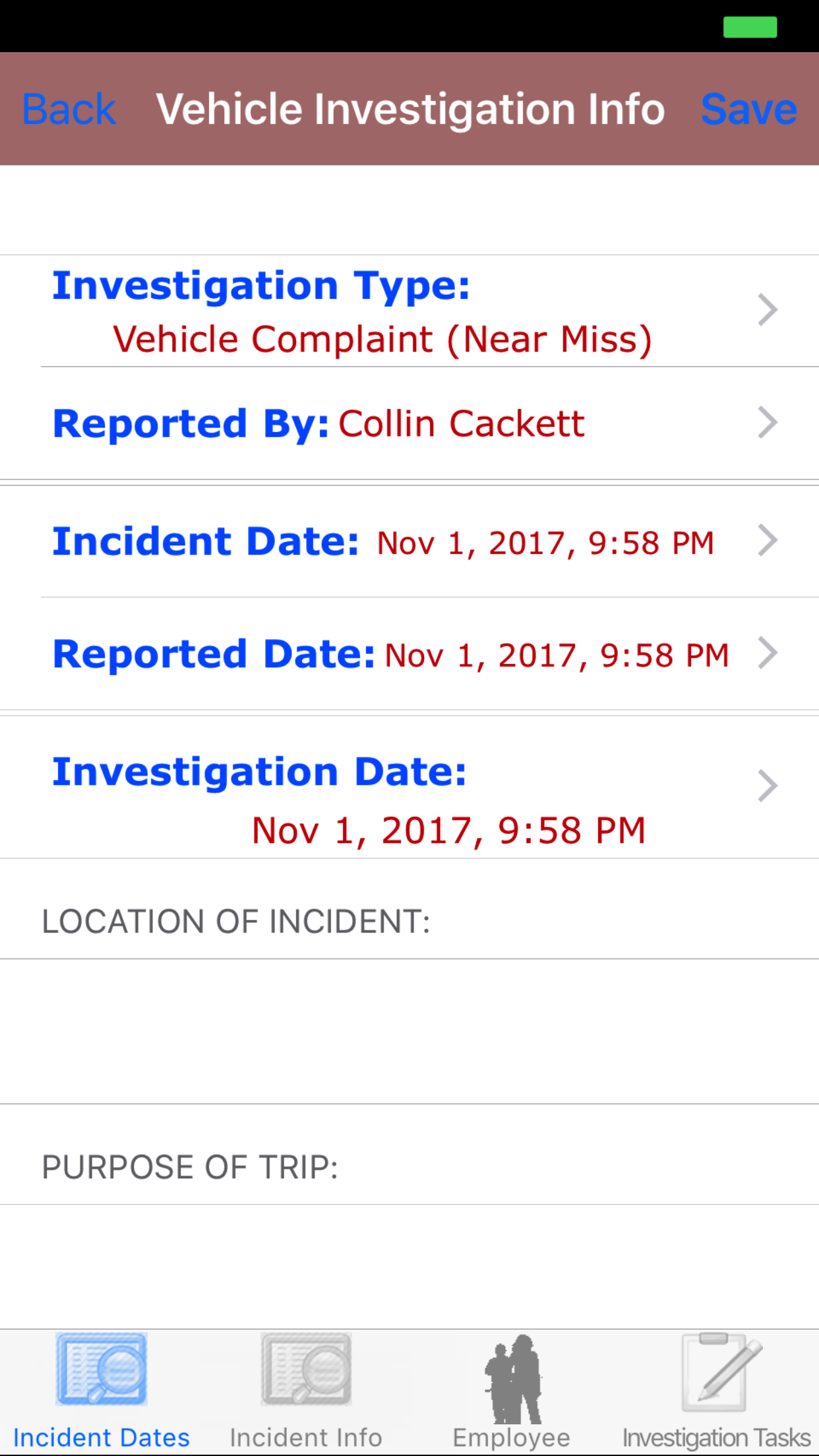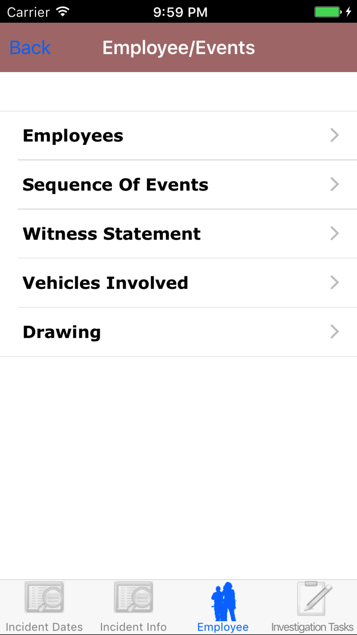 - Tap the desired employee to select it or tap Back in the top left corner to leave the Employee field unchanged and return to the Edit Vehicle Investigation screen.