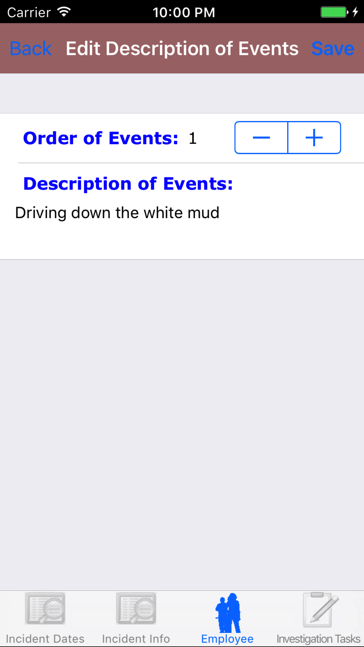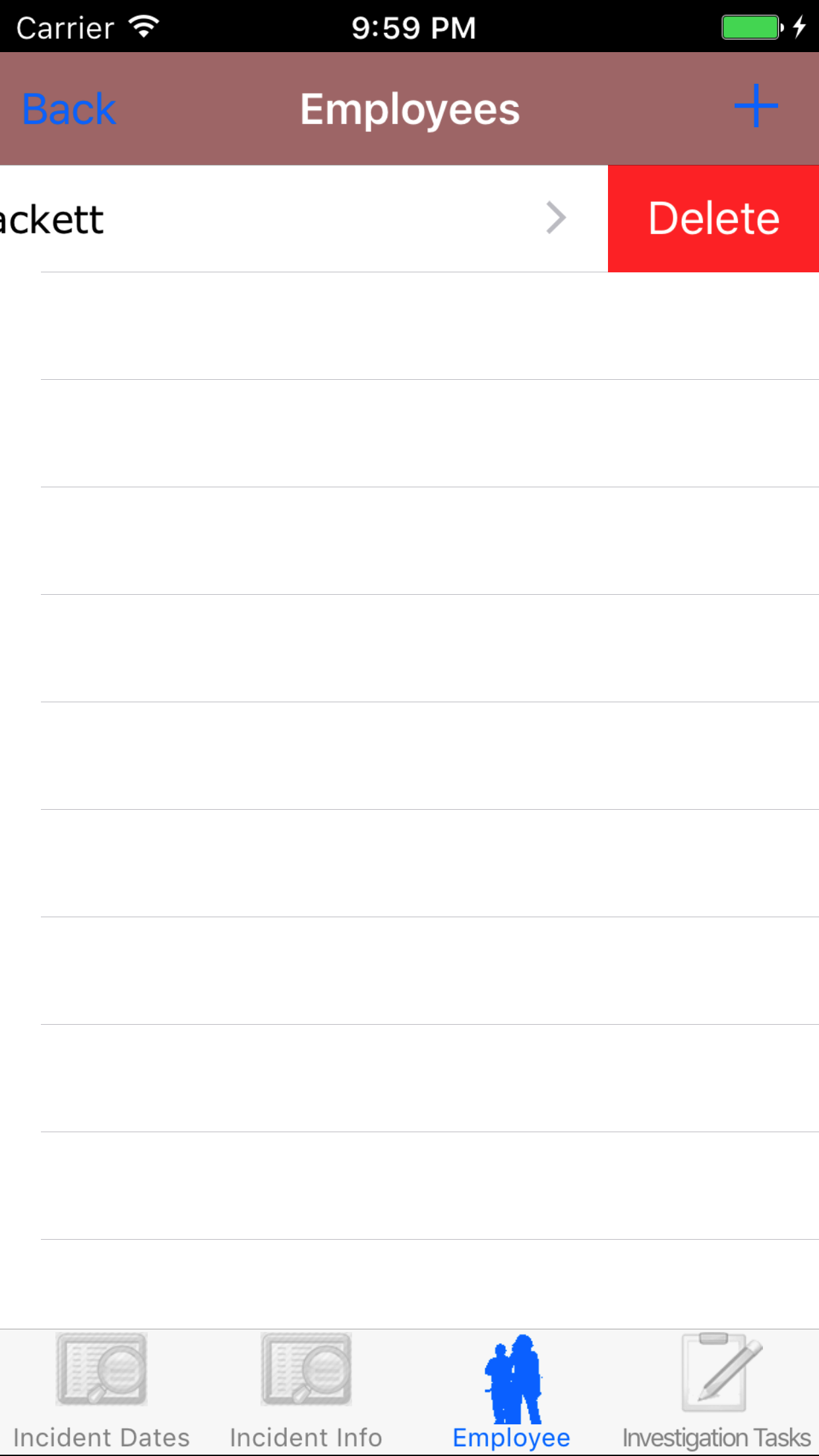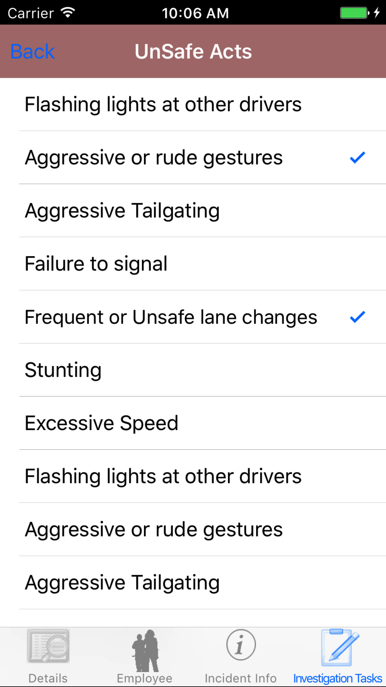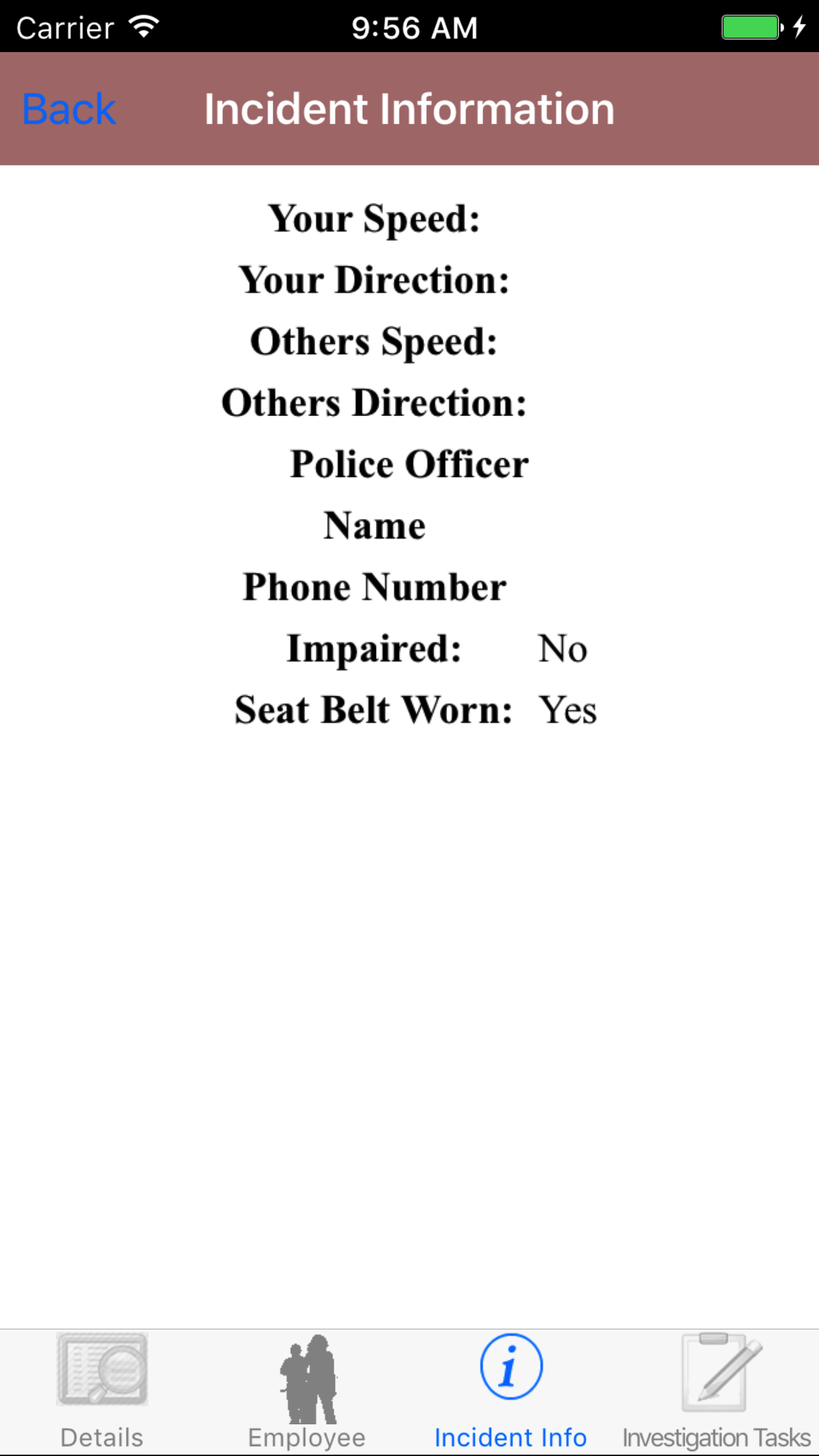 - Tap the desired employee to select it or tap Back in the top left corner to leave the Employee field unchanged and return to the Edit Vehicle Investigation screen.