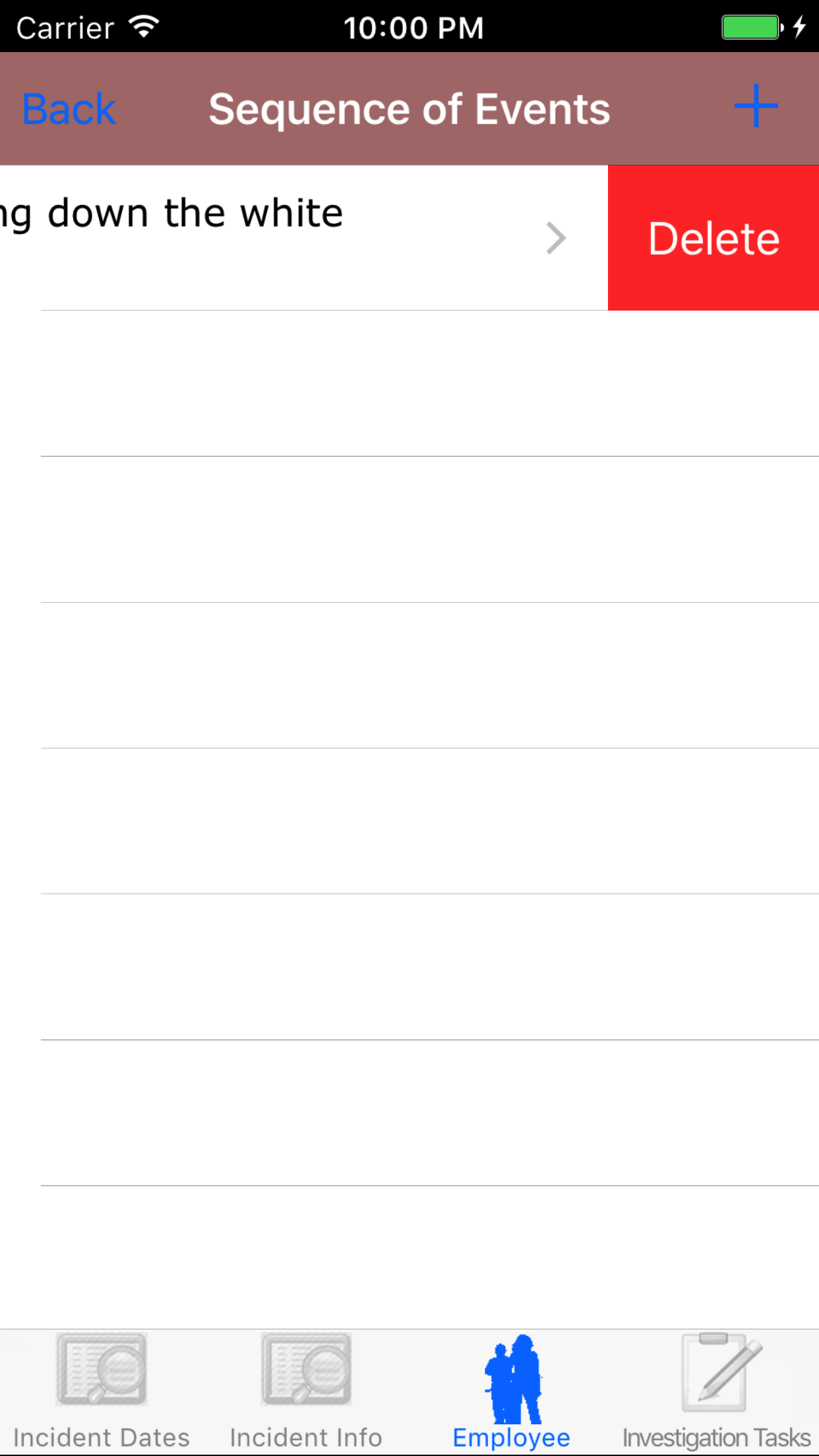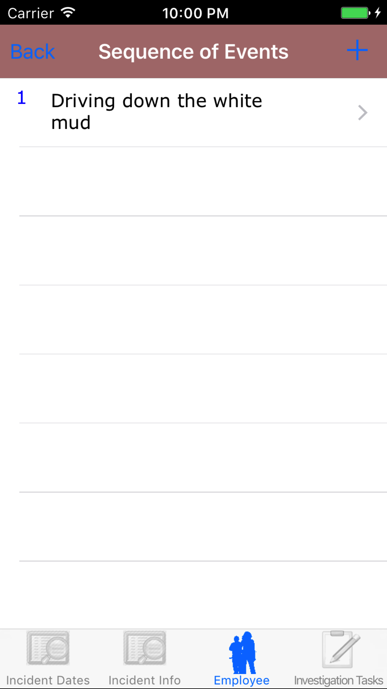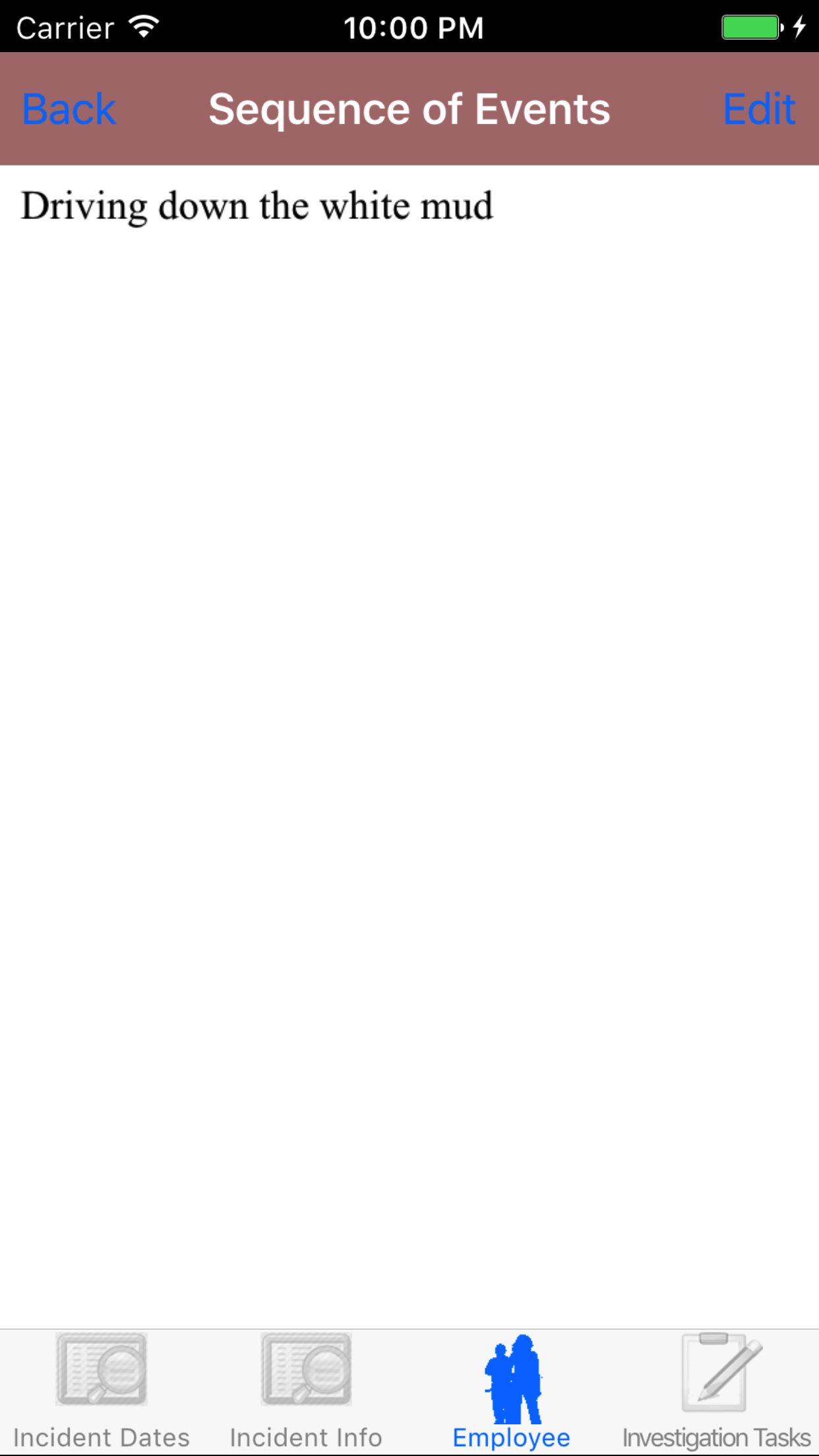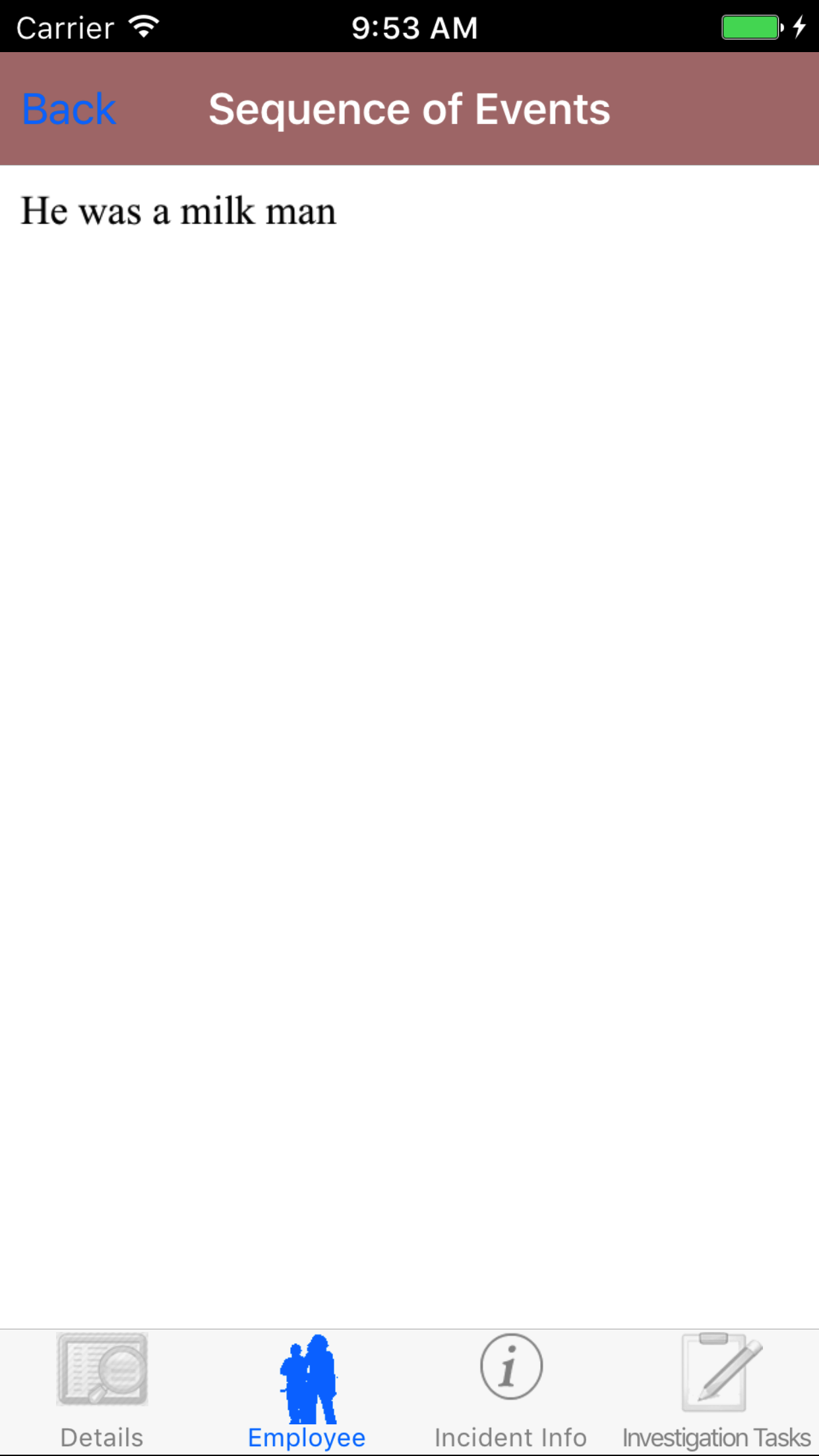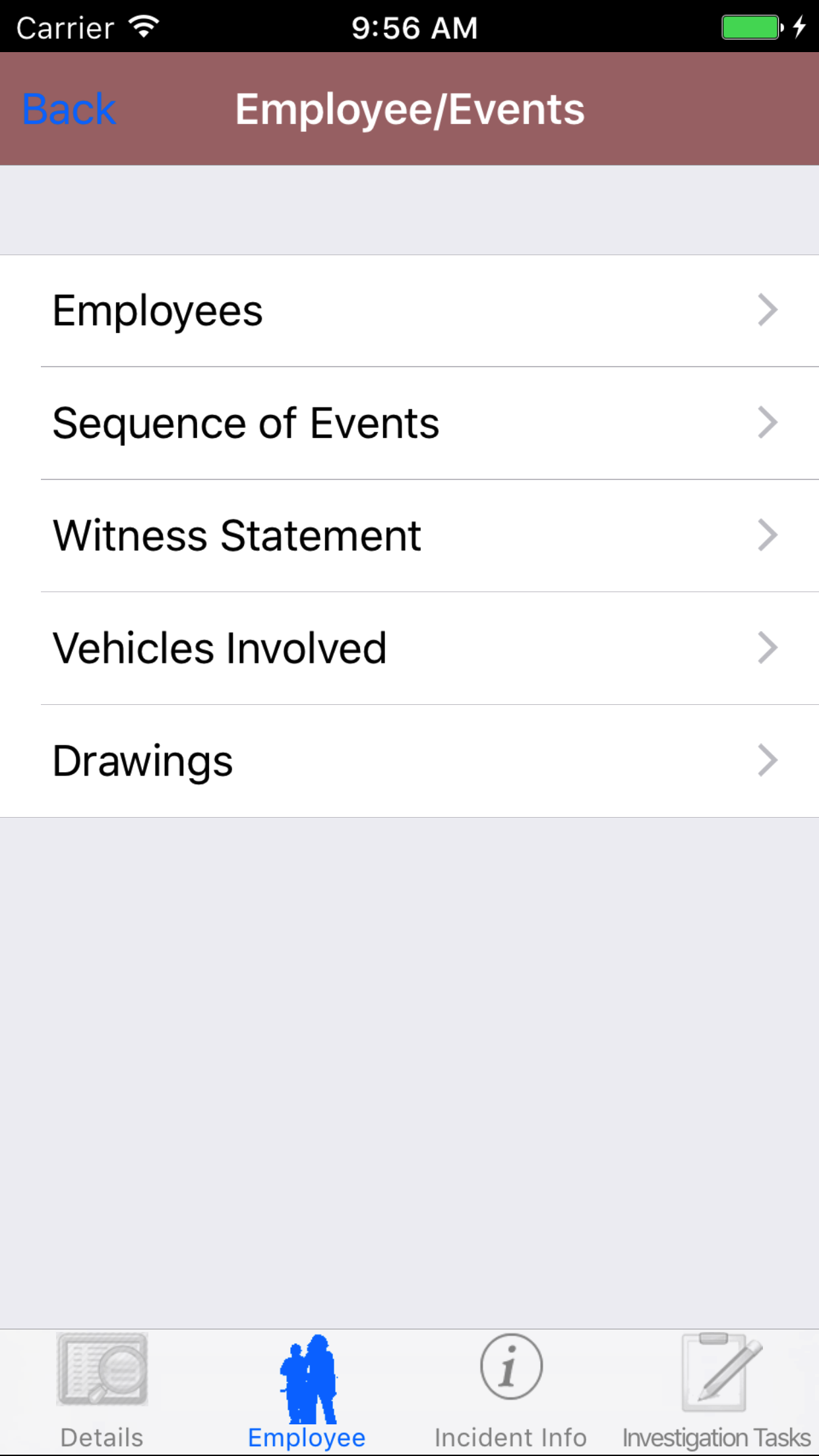 - Tap the second tab, the Employee's tab of the History view. There are 5 sections including employees, sequence of events, witness statements, vehicle involved and drawings.