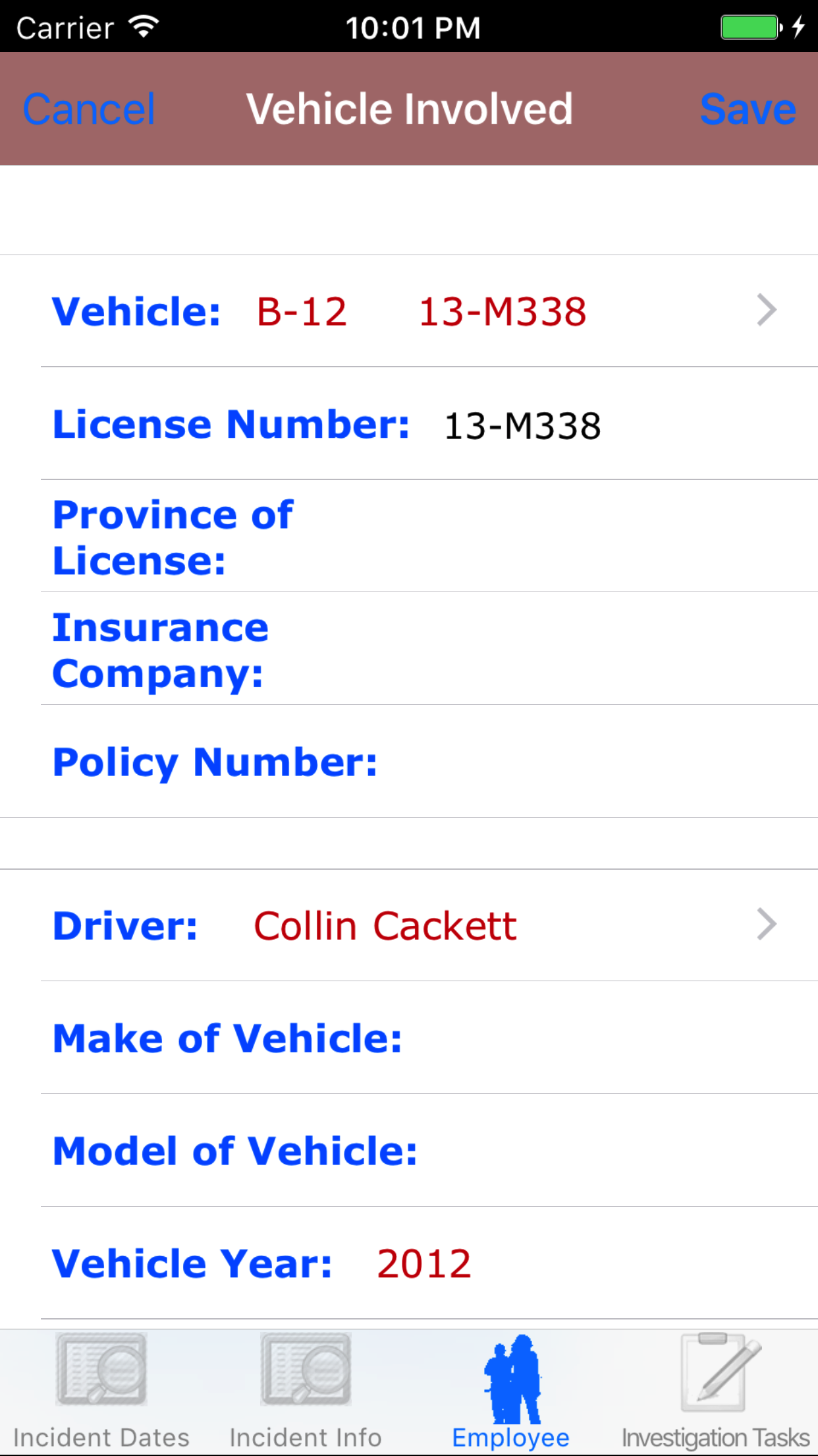 - Tap Save in the top right corner of the screen to save the vehicle involved.