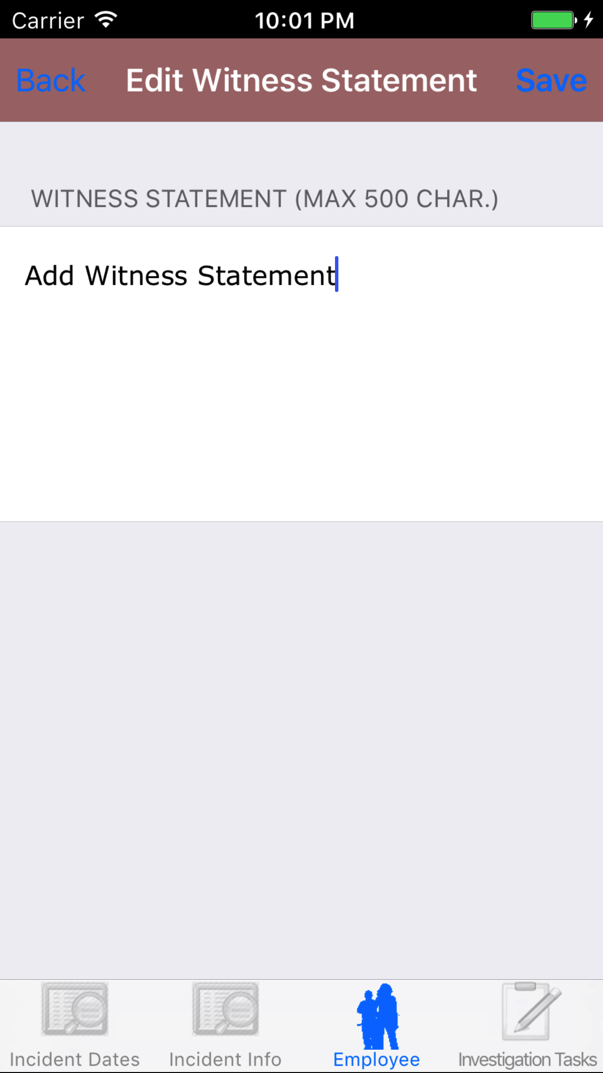 - Witness Statement: The Witness Statement field gives the user the ability to describe the what happened. The character limit of this field is 500.