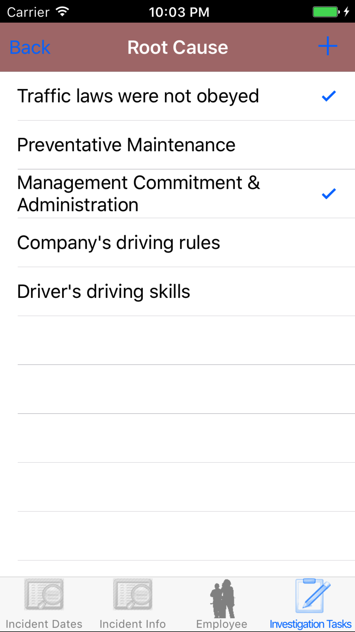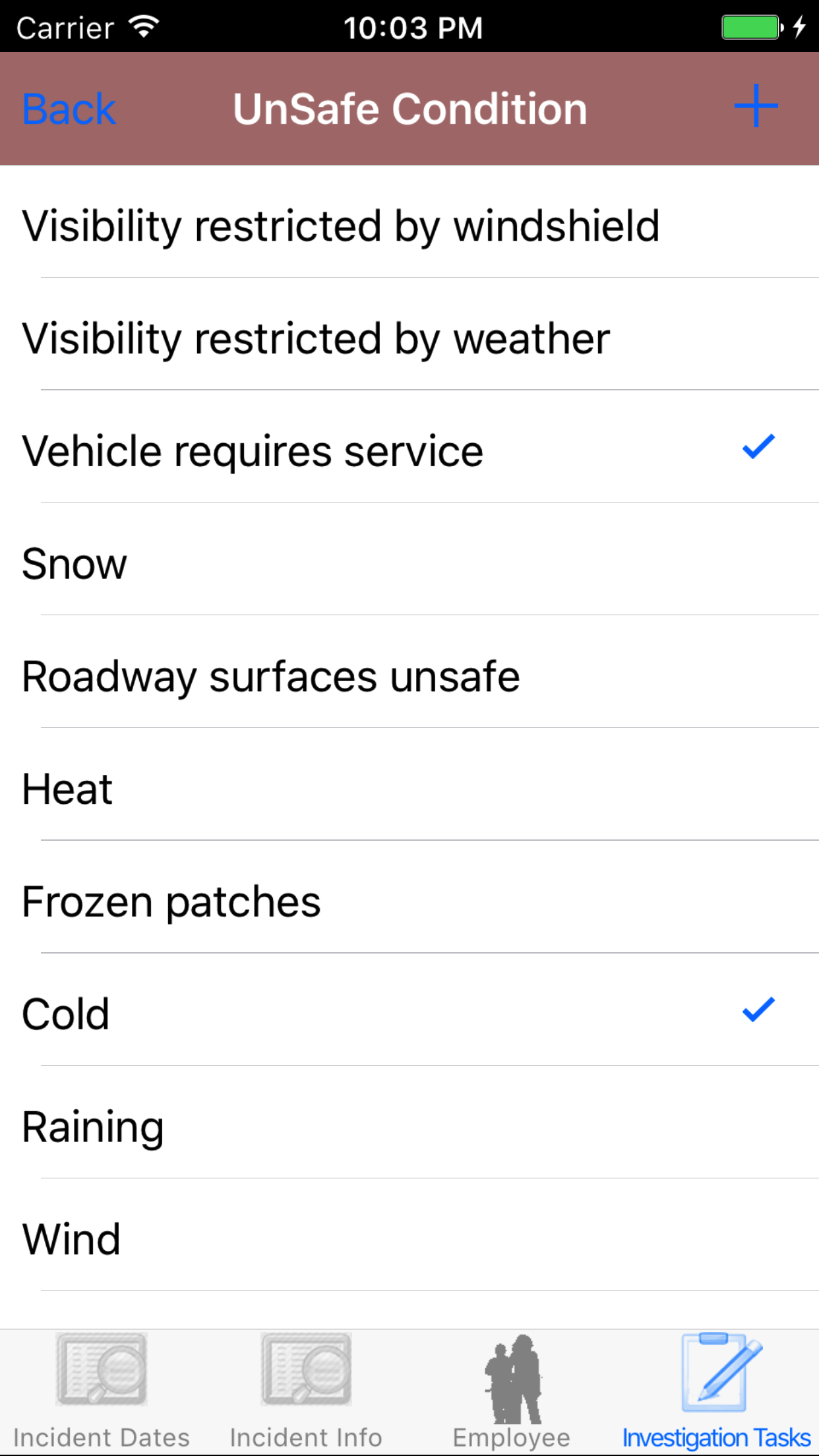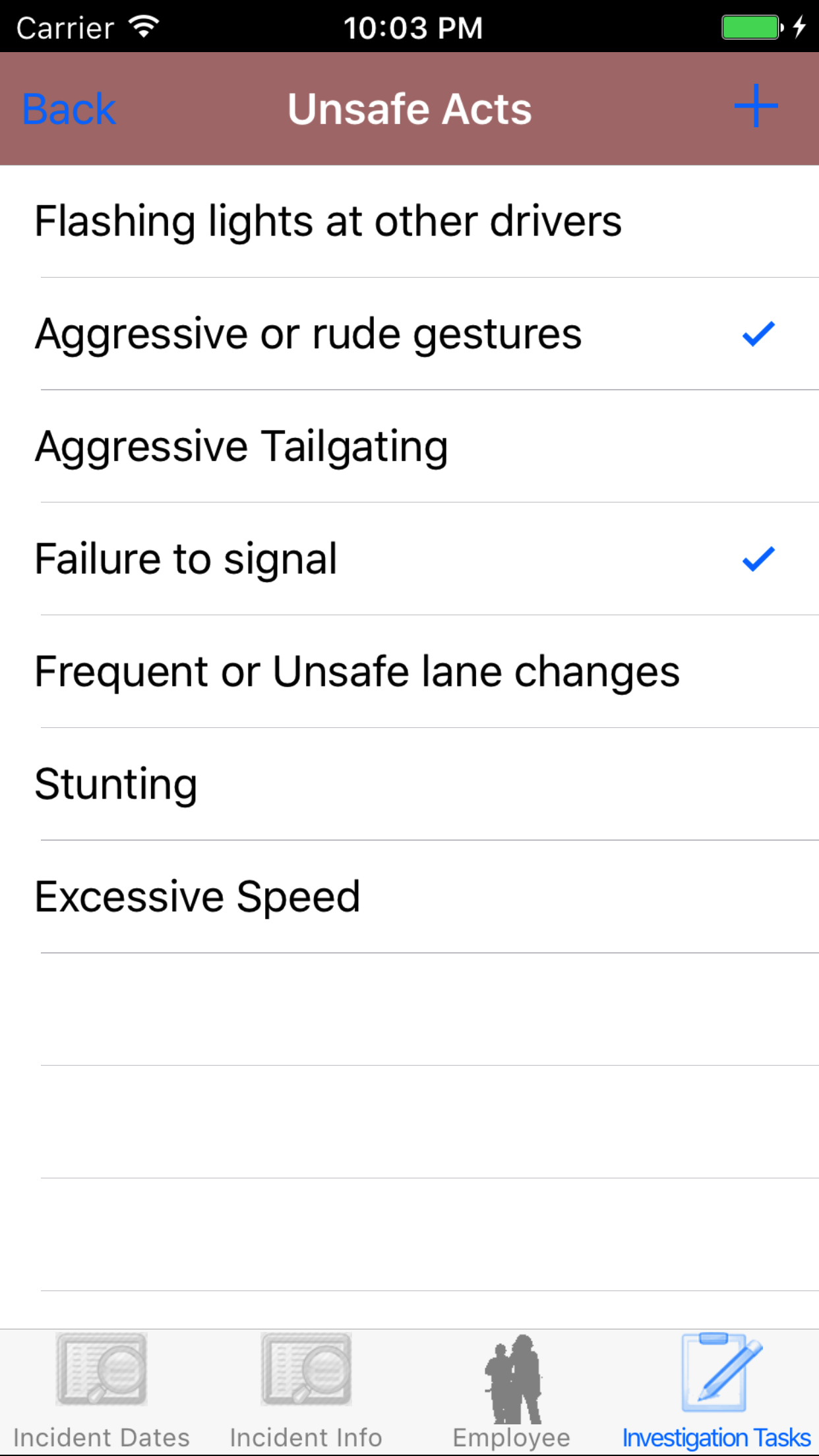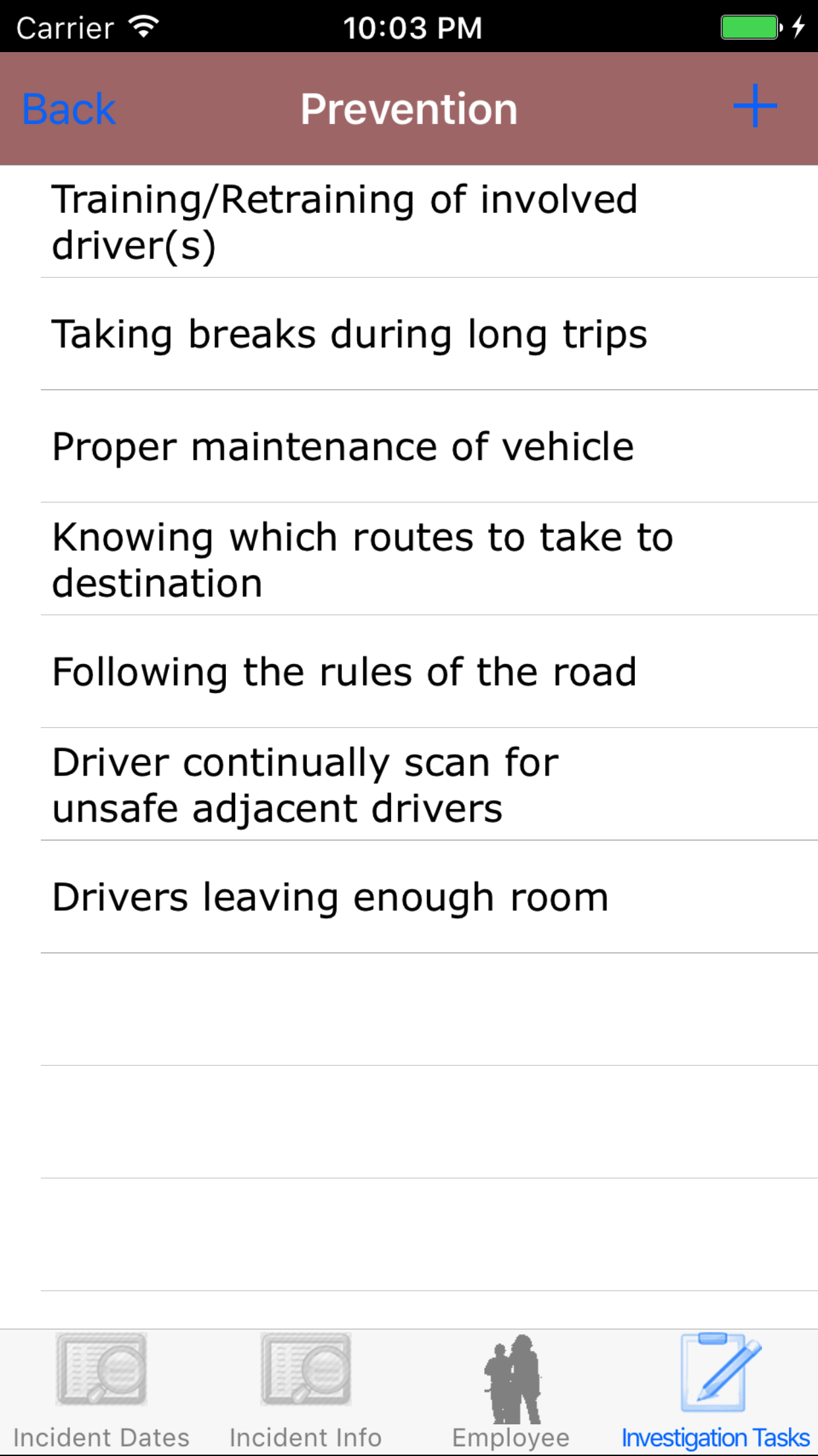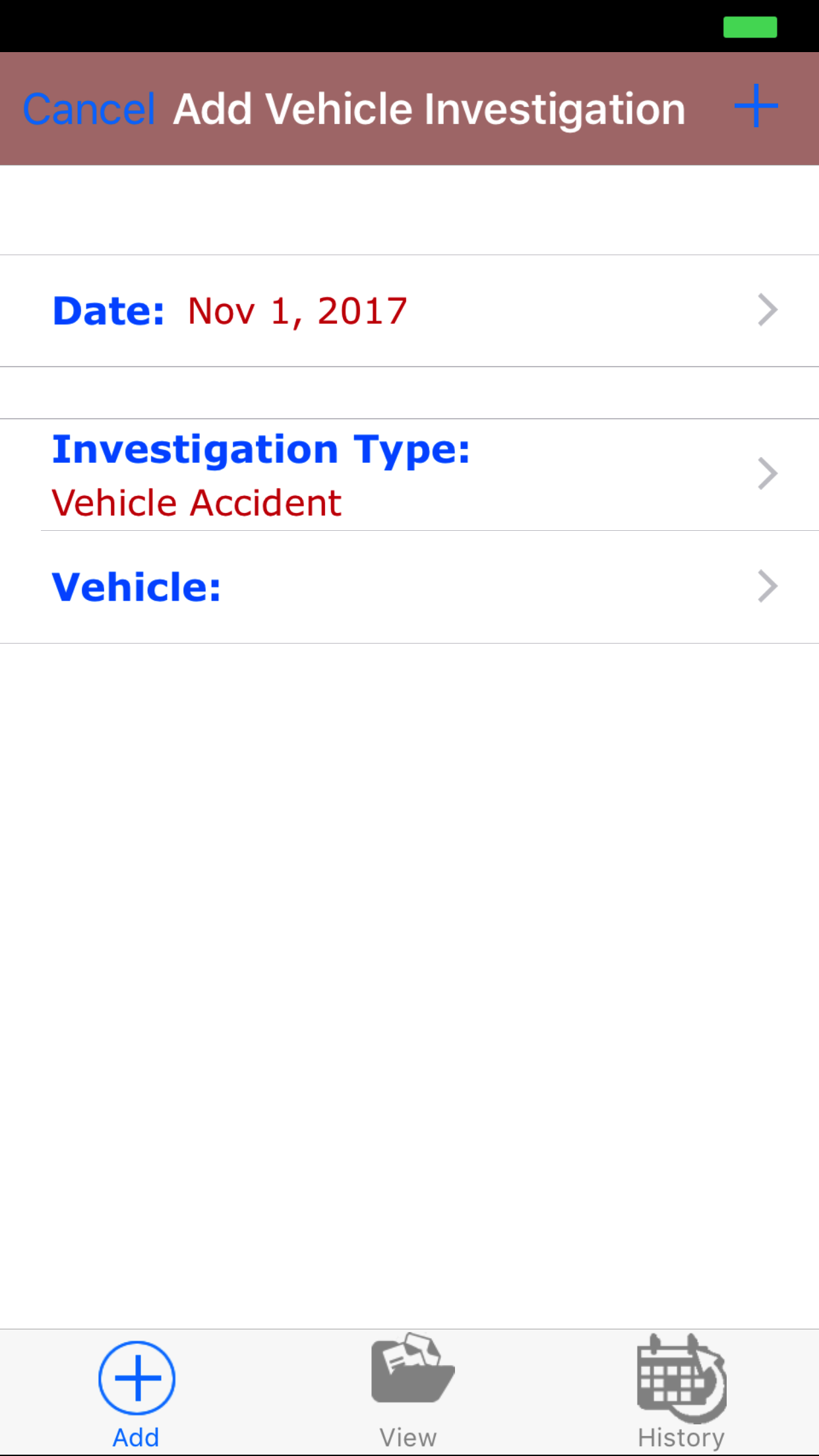- Tap the + icon in the top right corner to add the Vehicle Investigation.