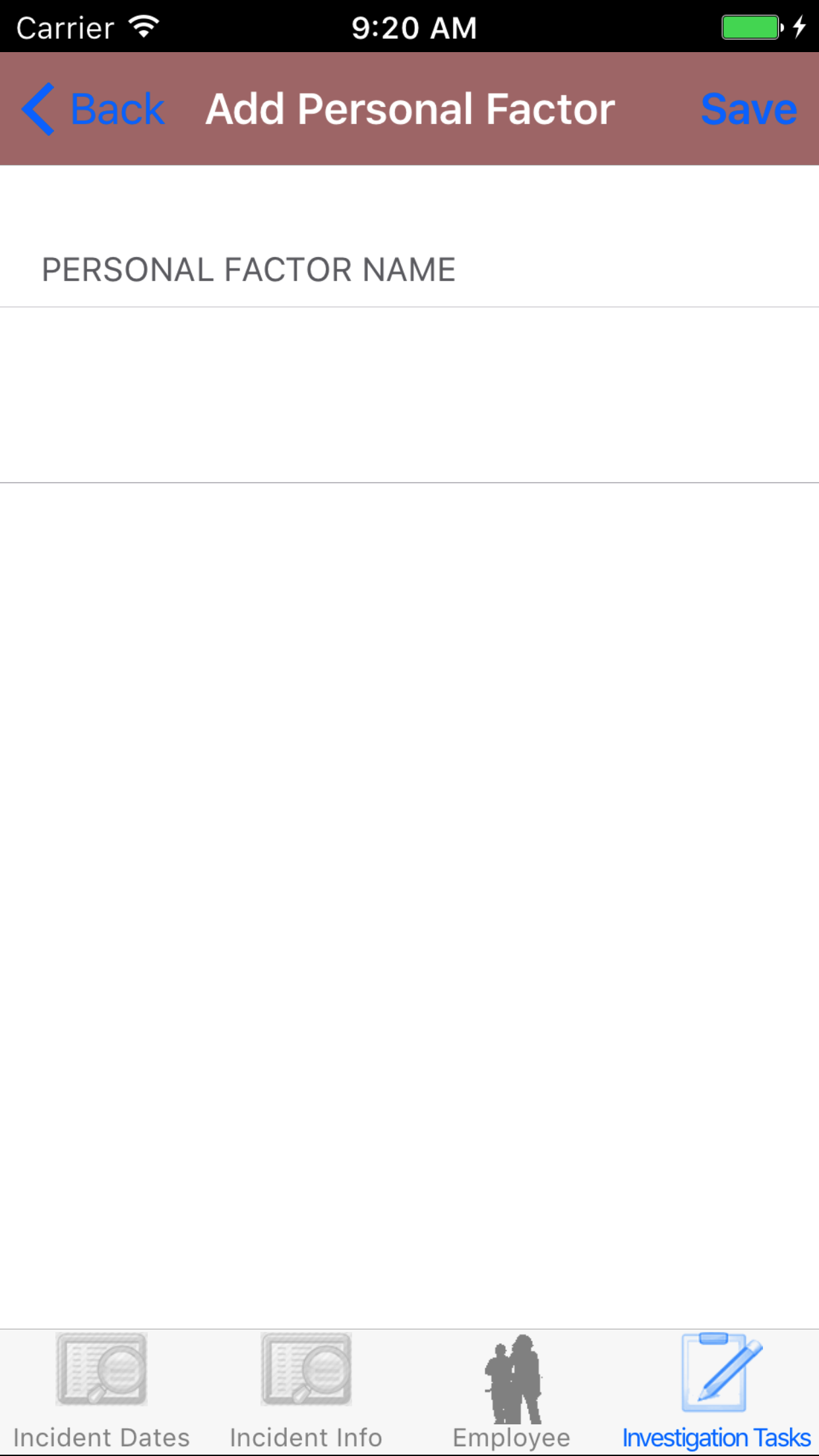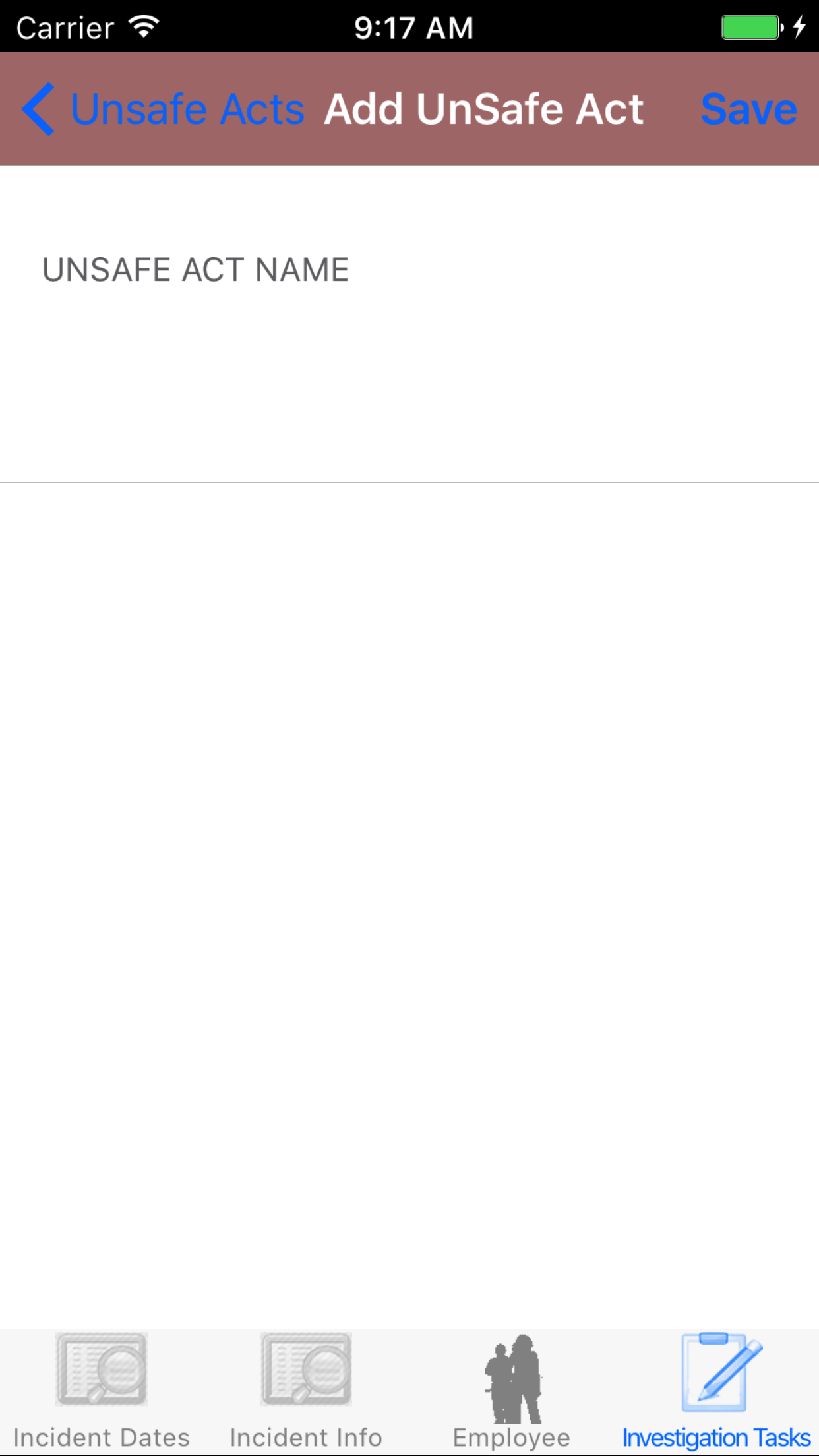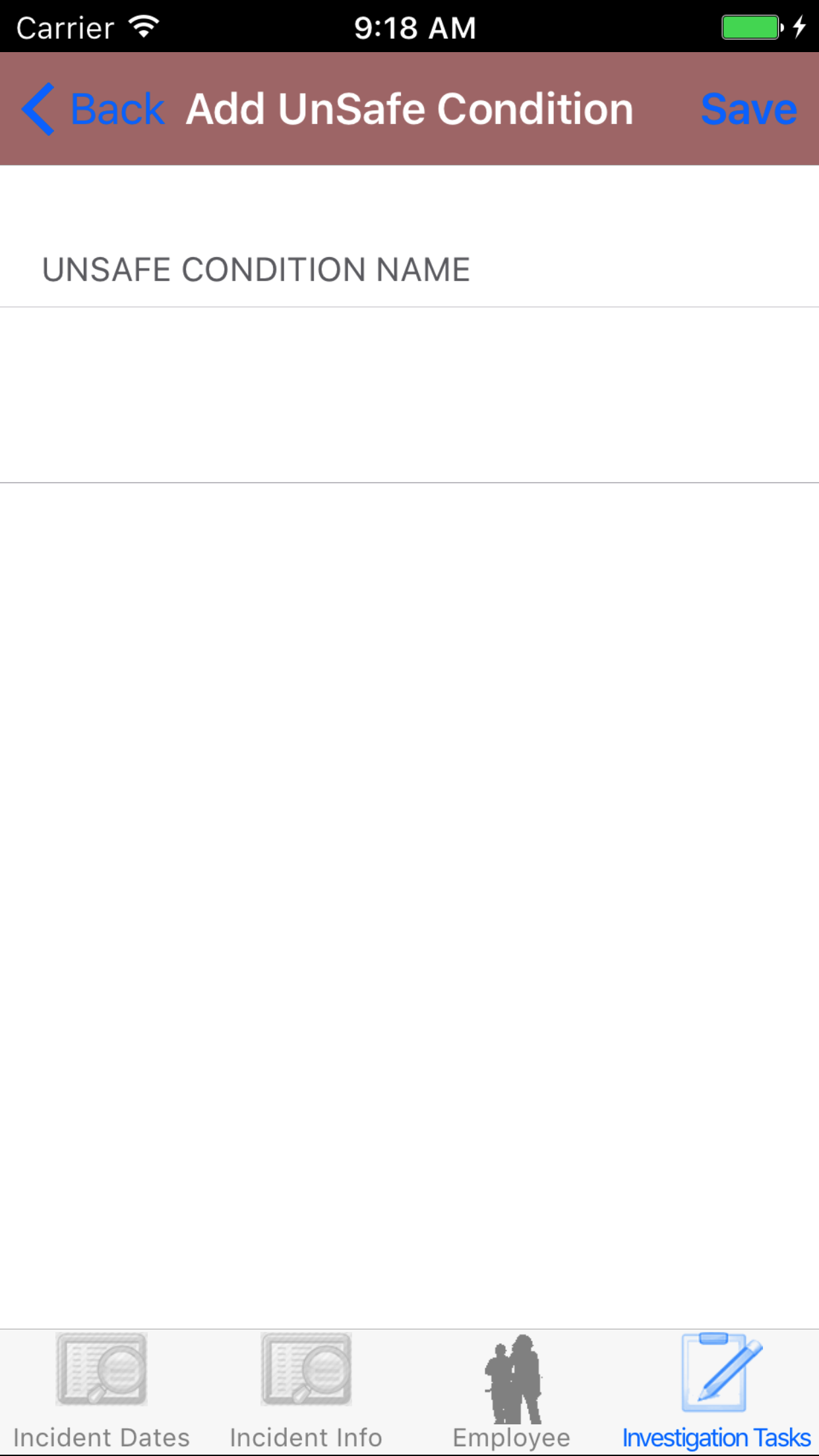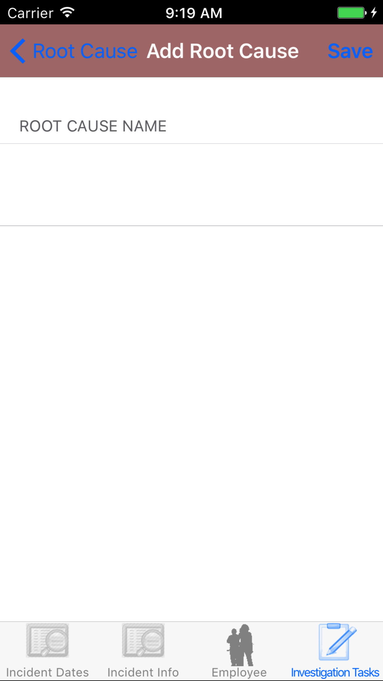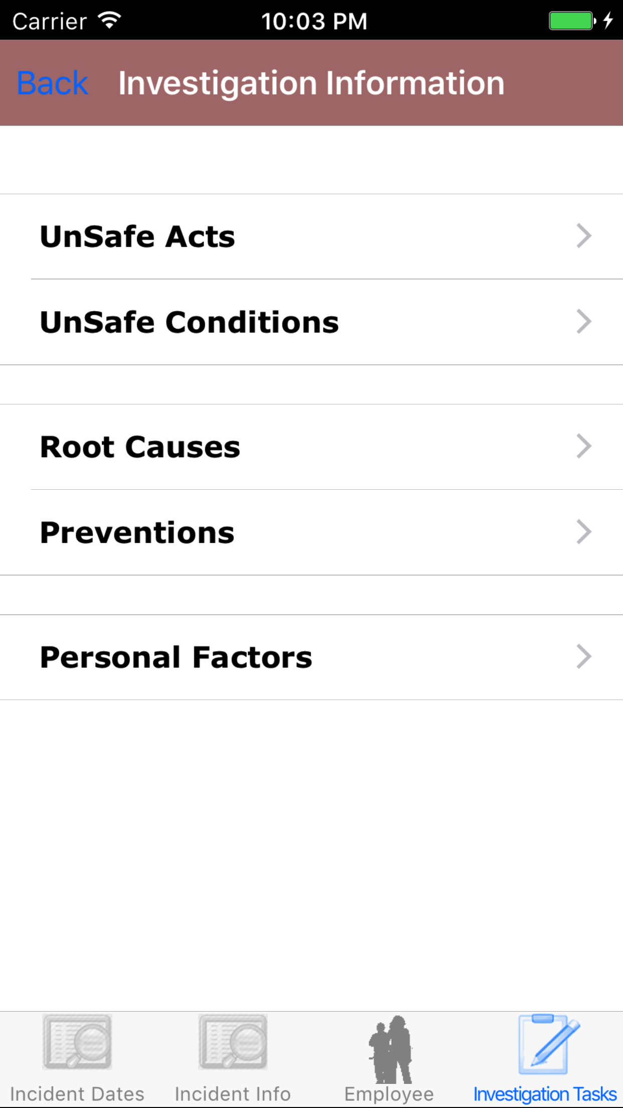- Tap the Investigation Type field to open the Choose Investigation Type screen.