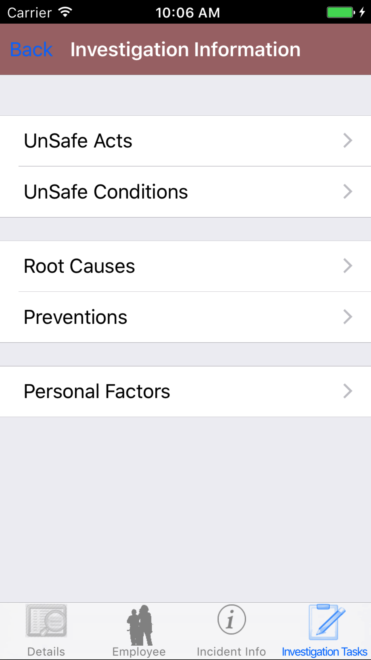 with the list of the 5 checklist categories of the Vehicle investigation. Tap on each category to view the investigation tasks.