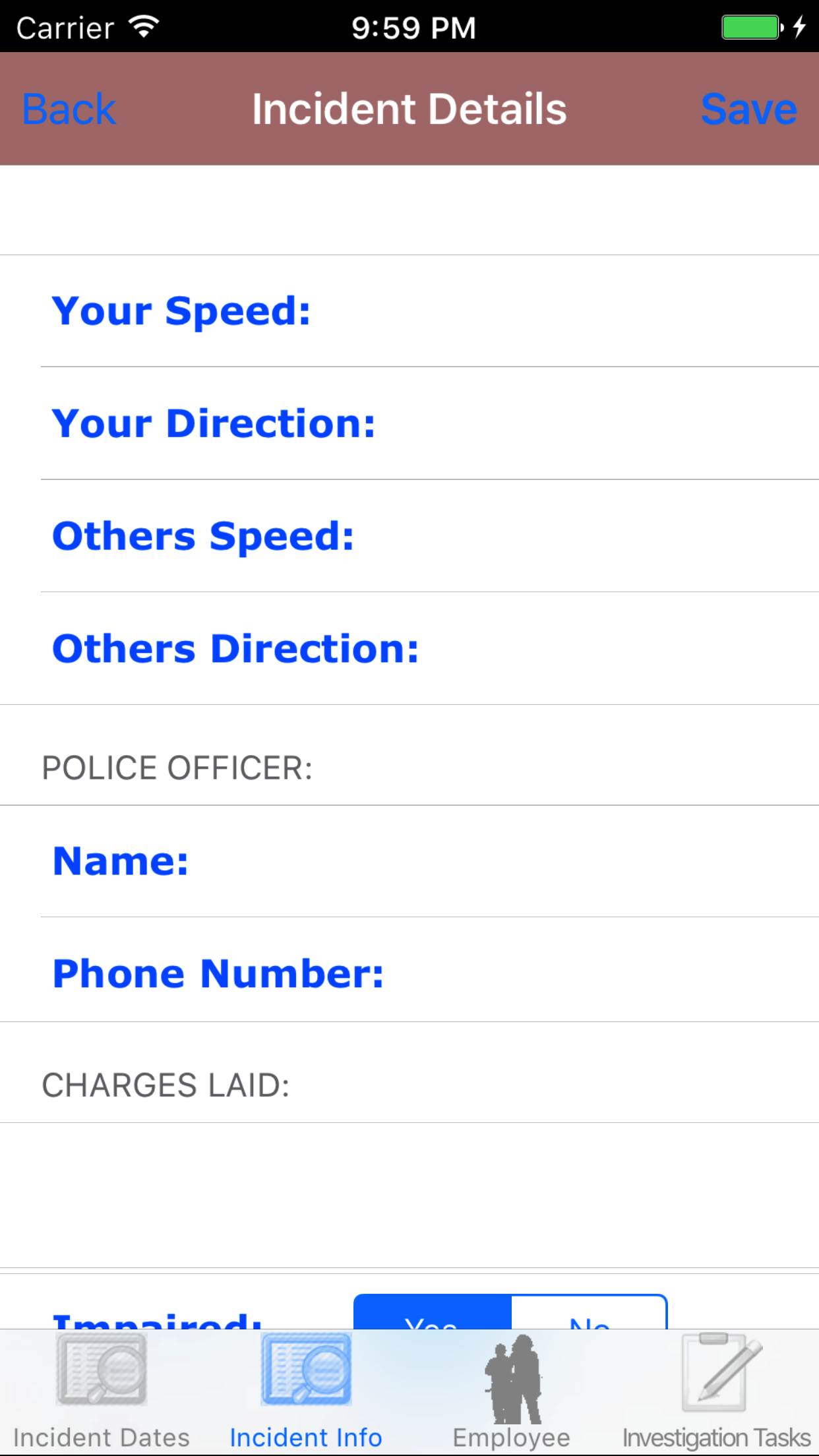 - Impaired: The Impaired field should be set to Yes if driver was impaired at the time of the incident.
