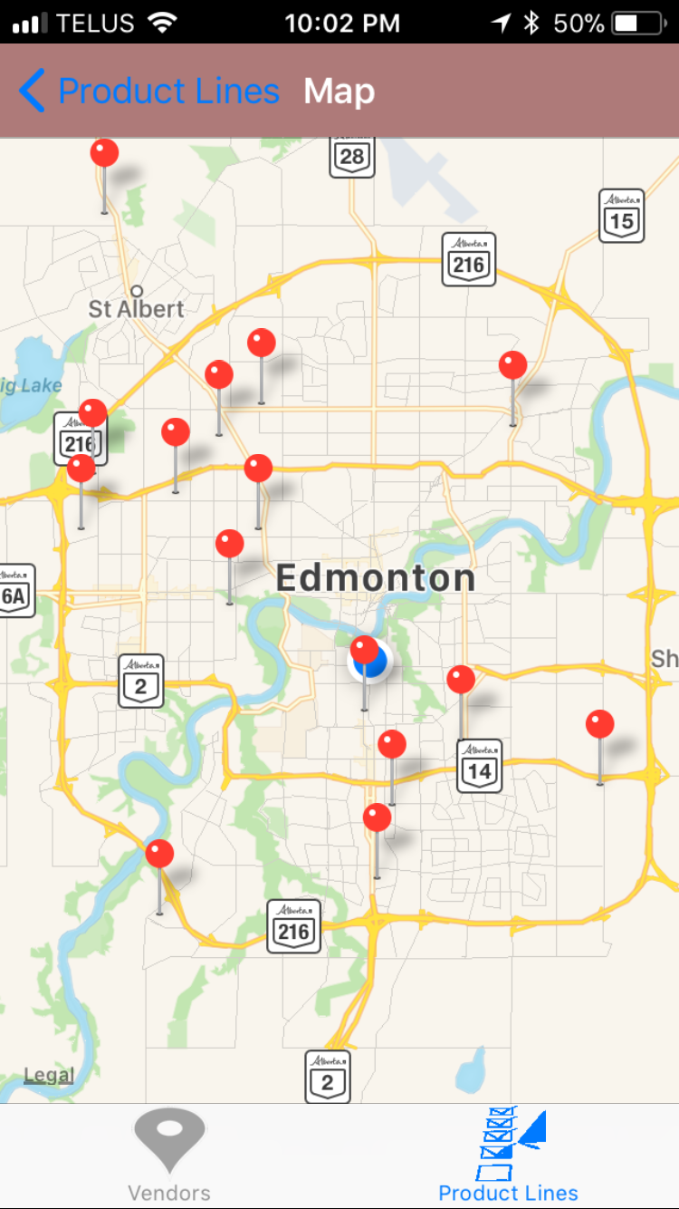 - Tap on the Product Line you would like to view. This opens the map with a pin on the location of the product lines can be purchased.