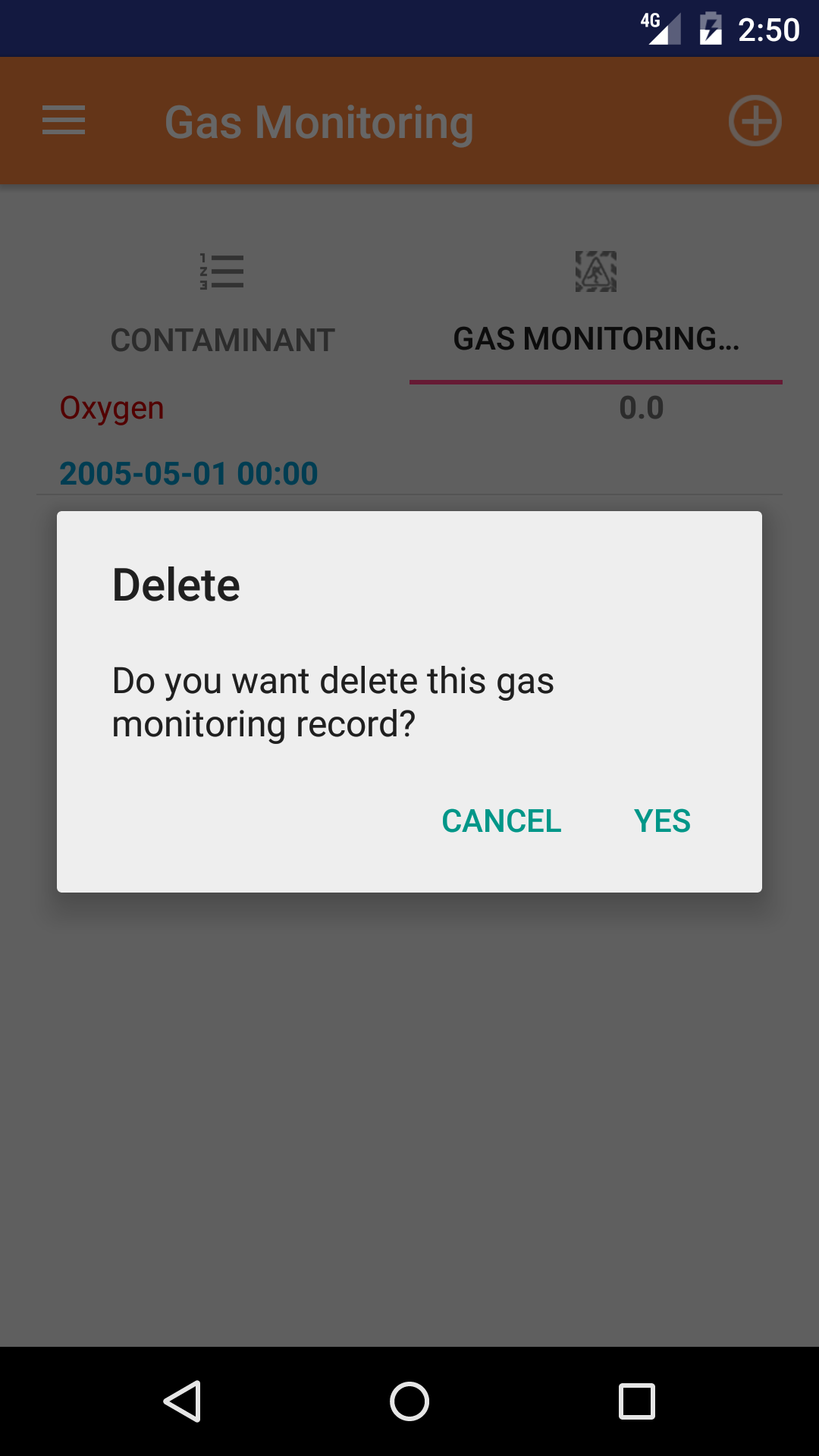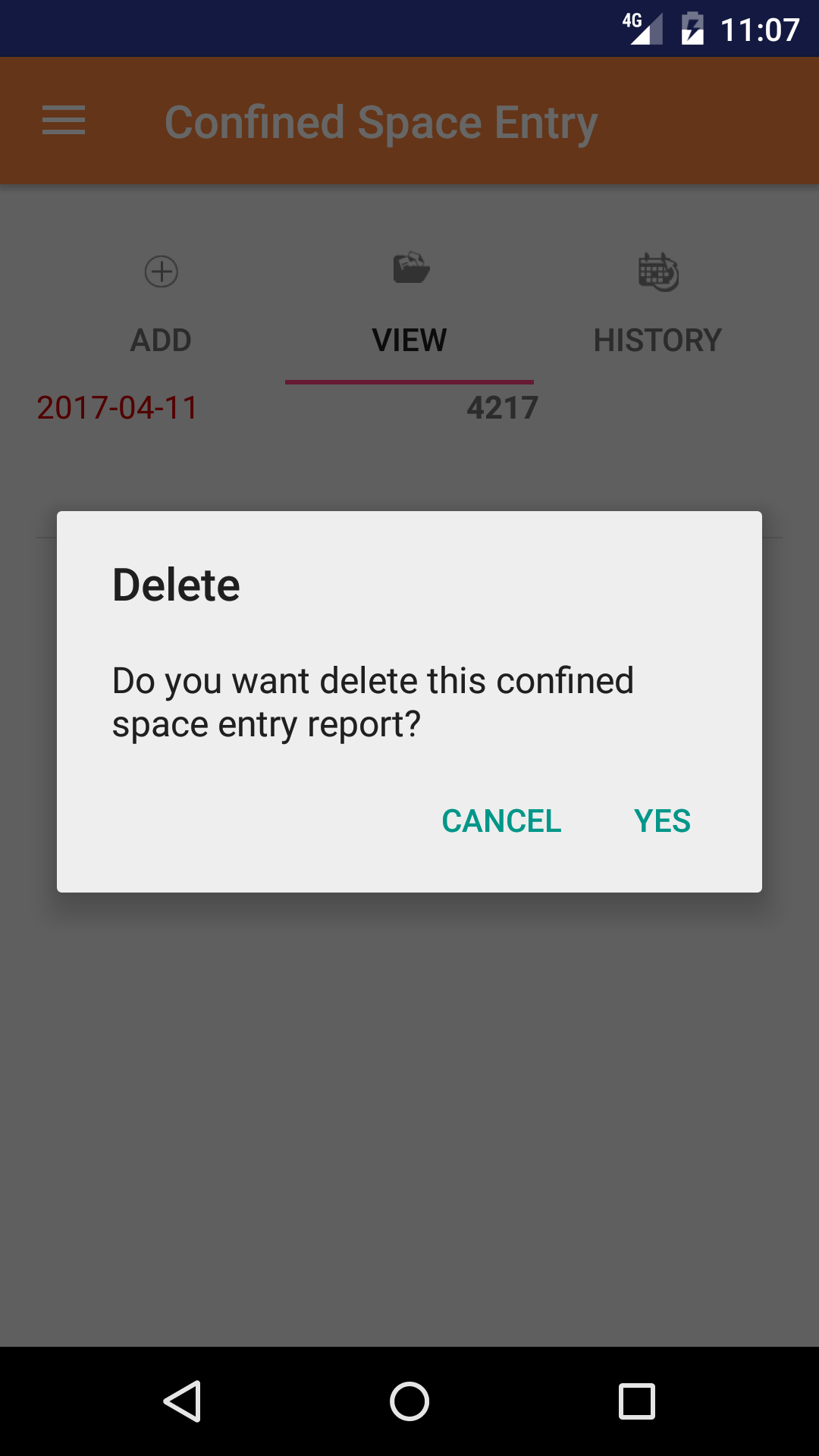 - Long Tap the confined space entry report to bring up the delete screen for the confined space entry report.