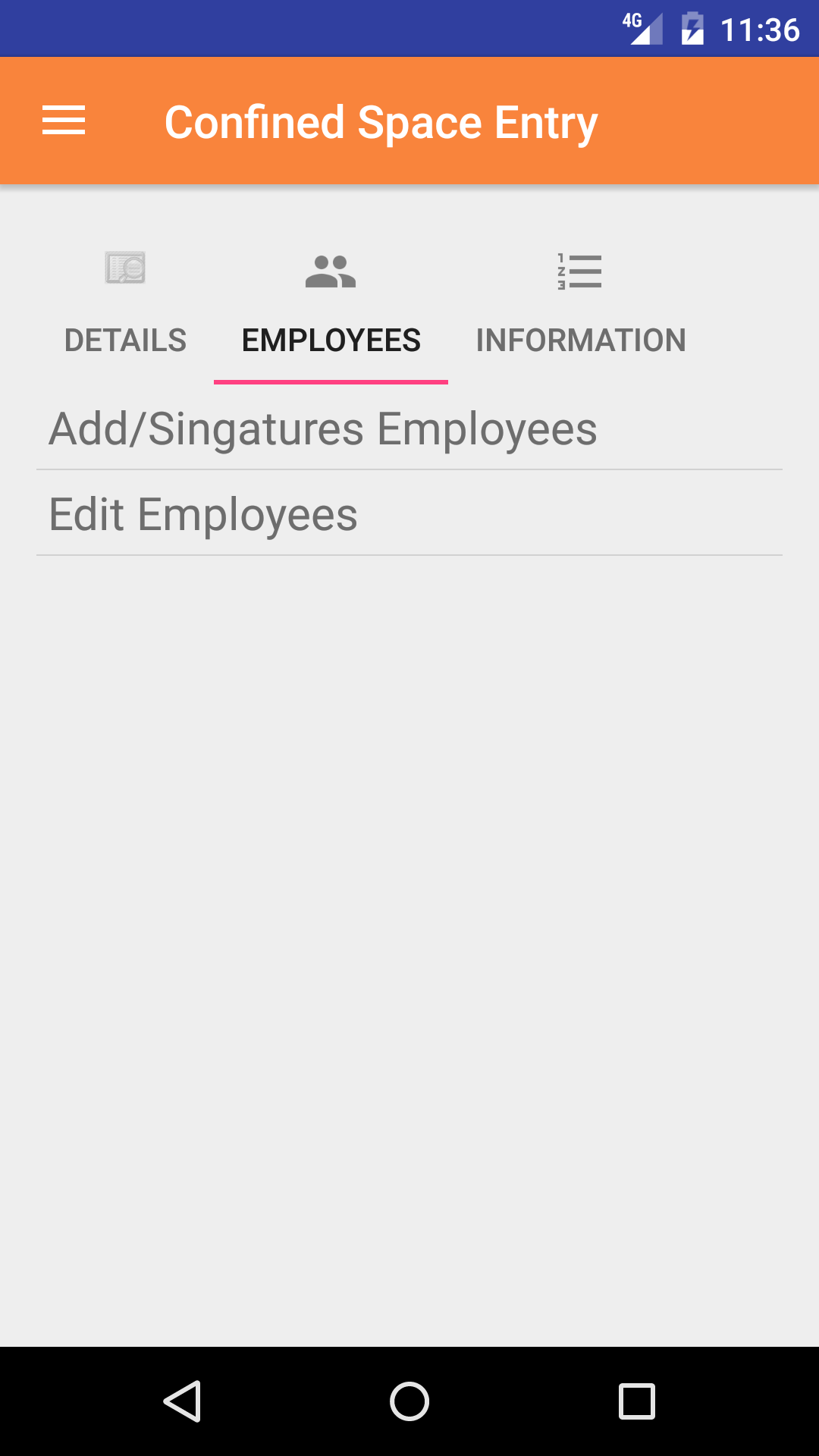 - Tap the add/Signature Employees button to load the list of employee on the confined space entry report.
