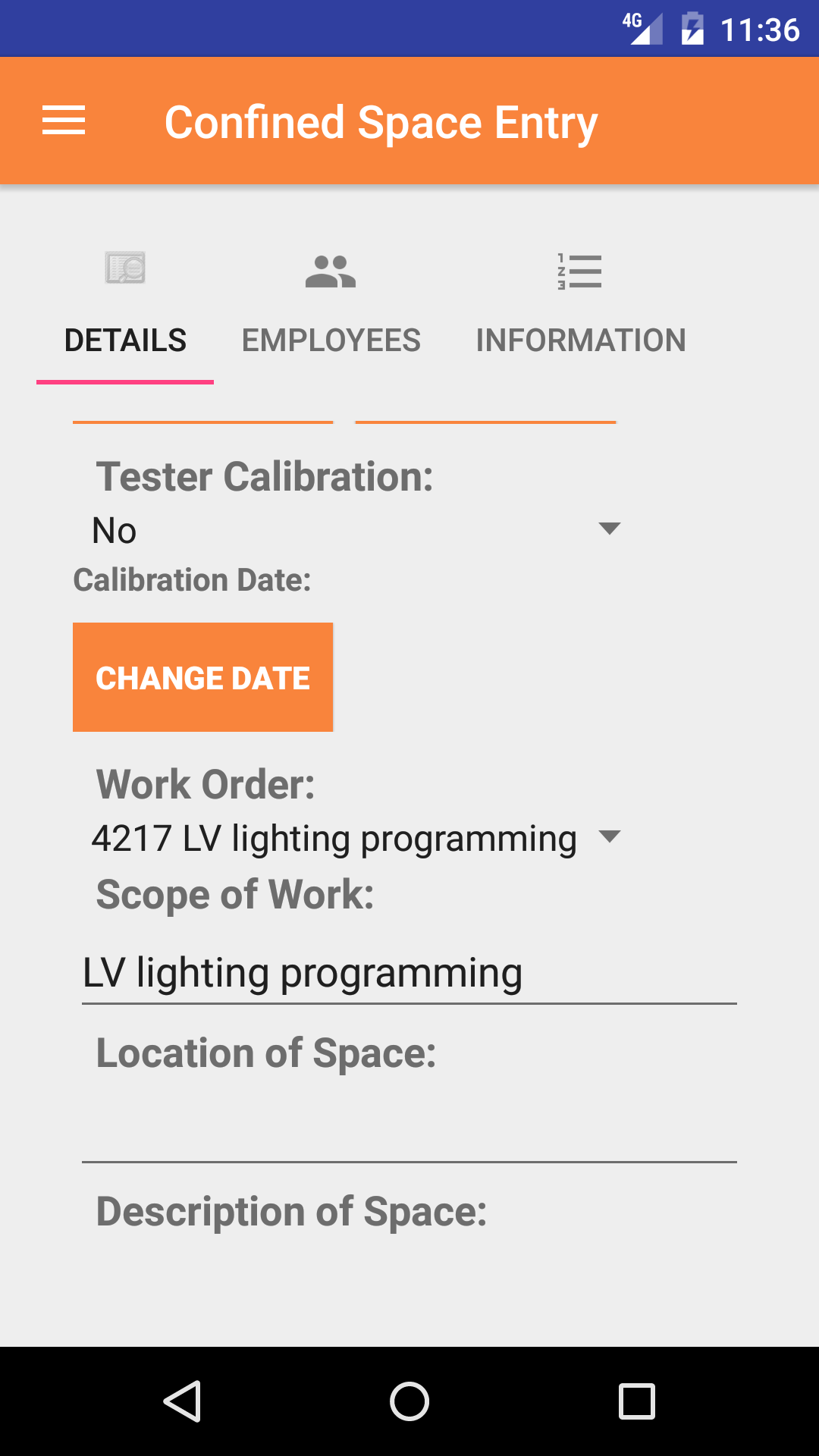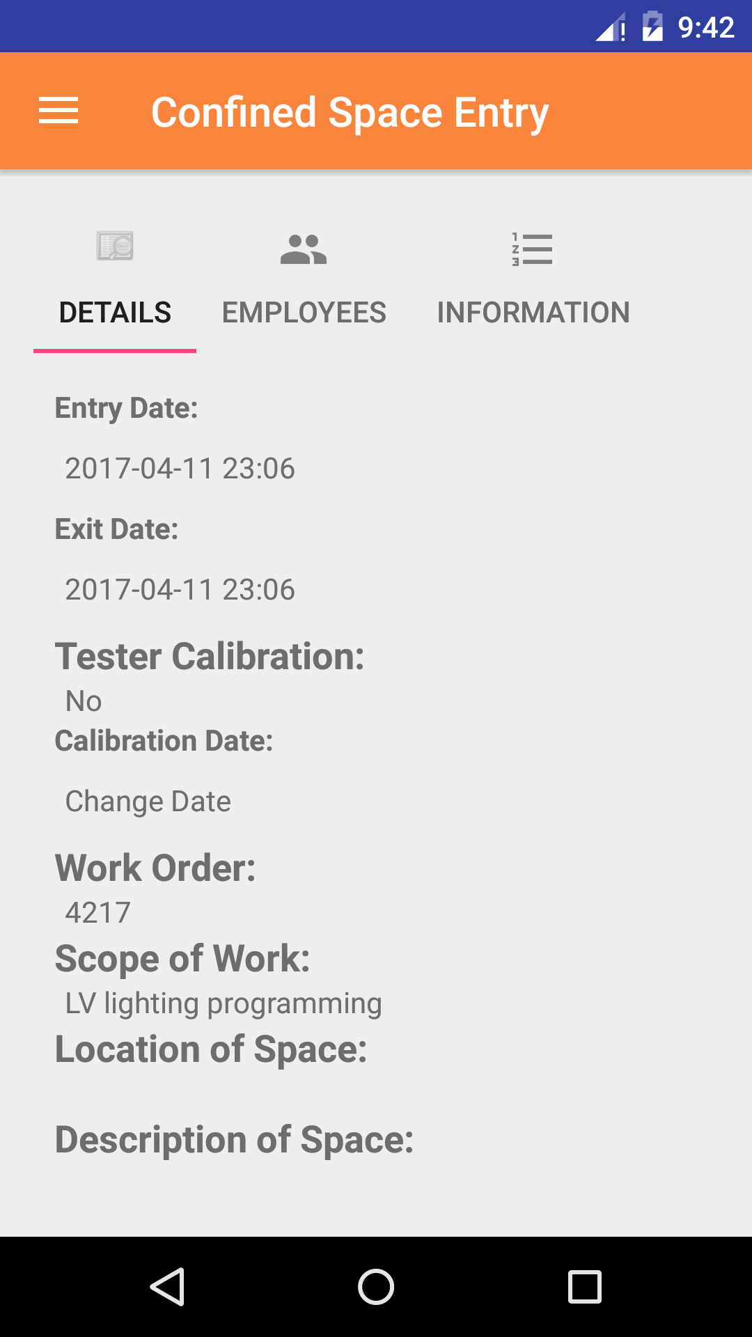 It loads the following details including entry date/time, exit date/time, work order number, scope of work, location of space, description of space, etc.
