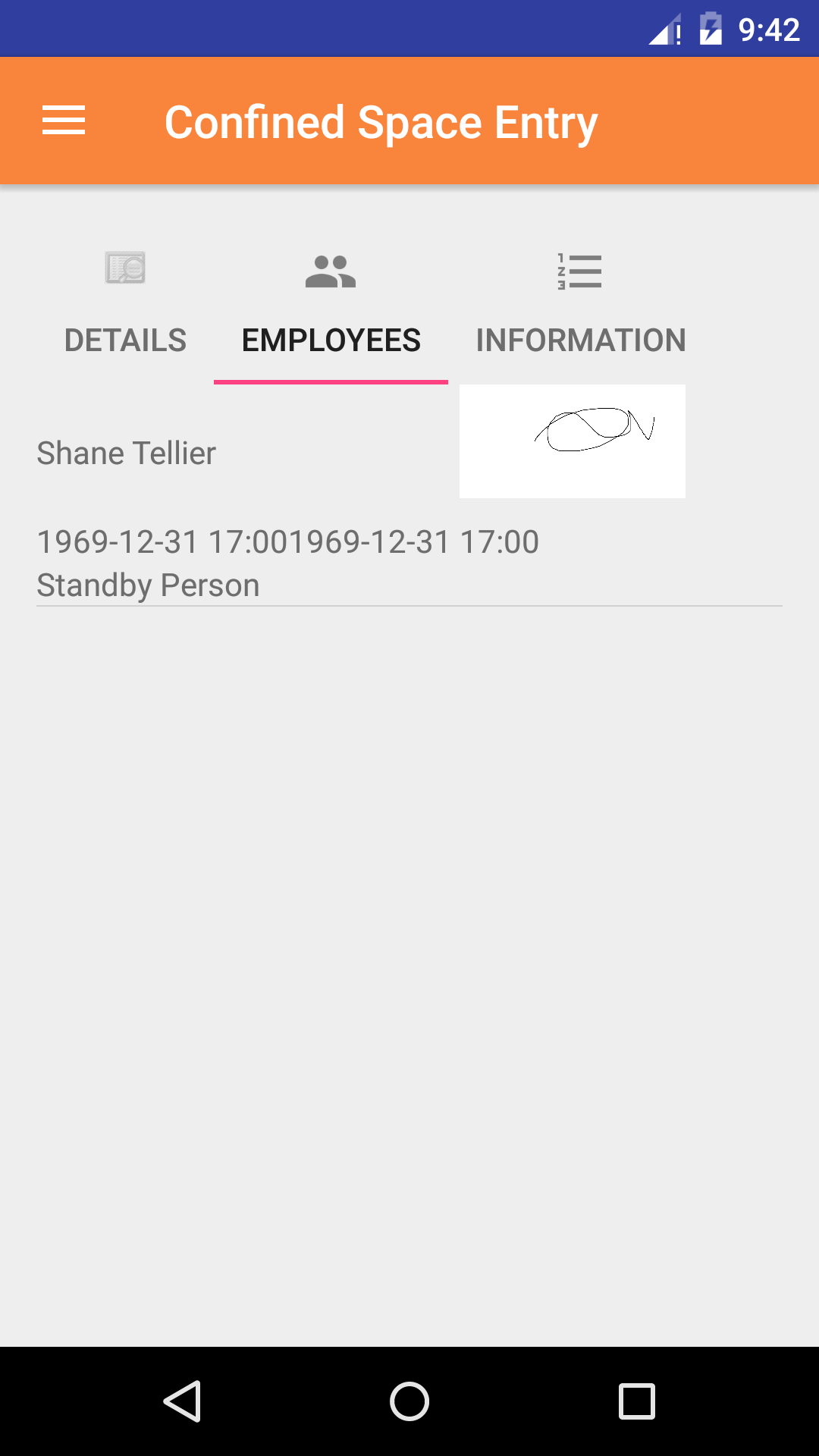- Signature Missing: if the employee has not signed the confined space entry report a error message will appear telling users the confined space entry report could not be closed with out signatures from employees.