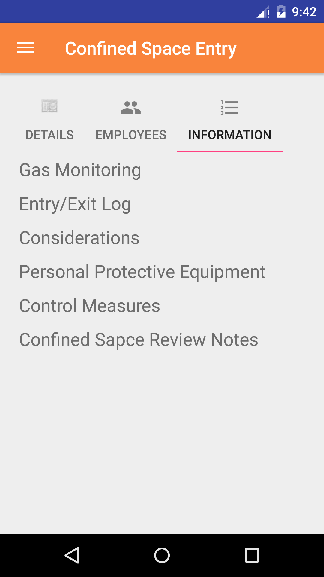 - This opens Confined Space Entry screen, which gives the user a explanation of confined space entry reports. Tap on