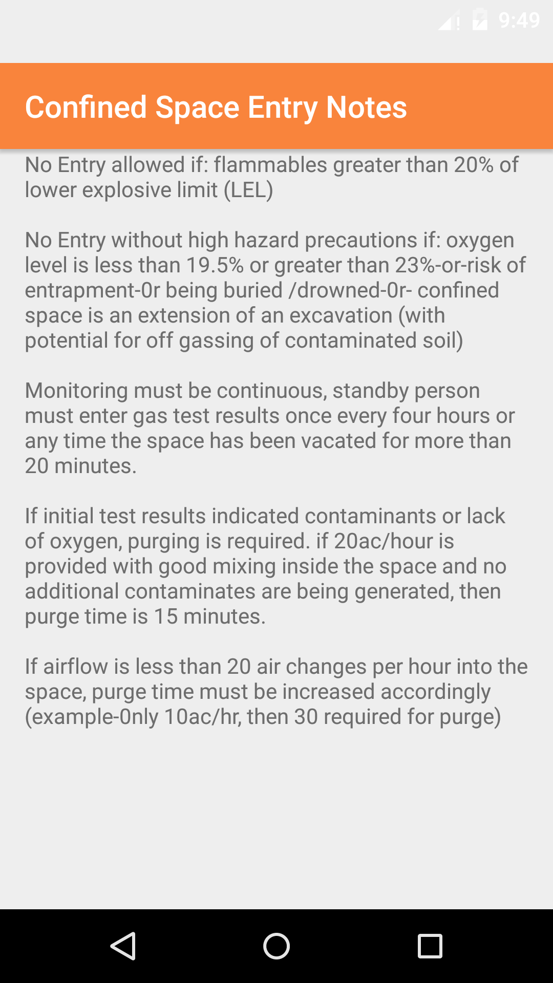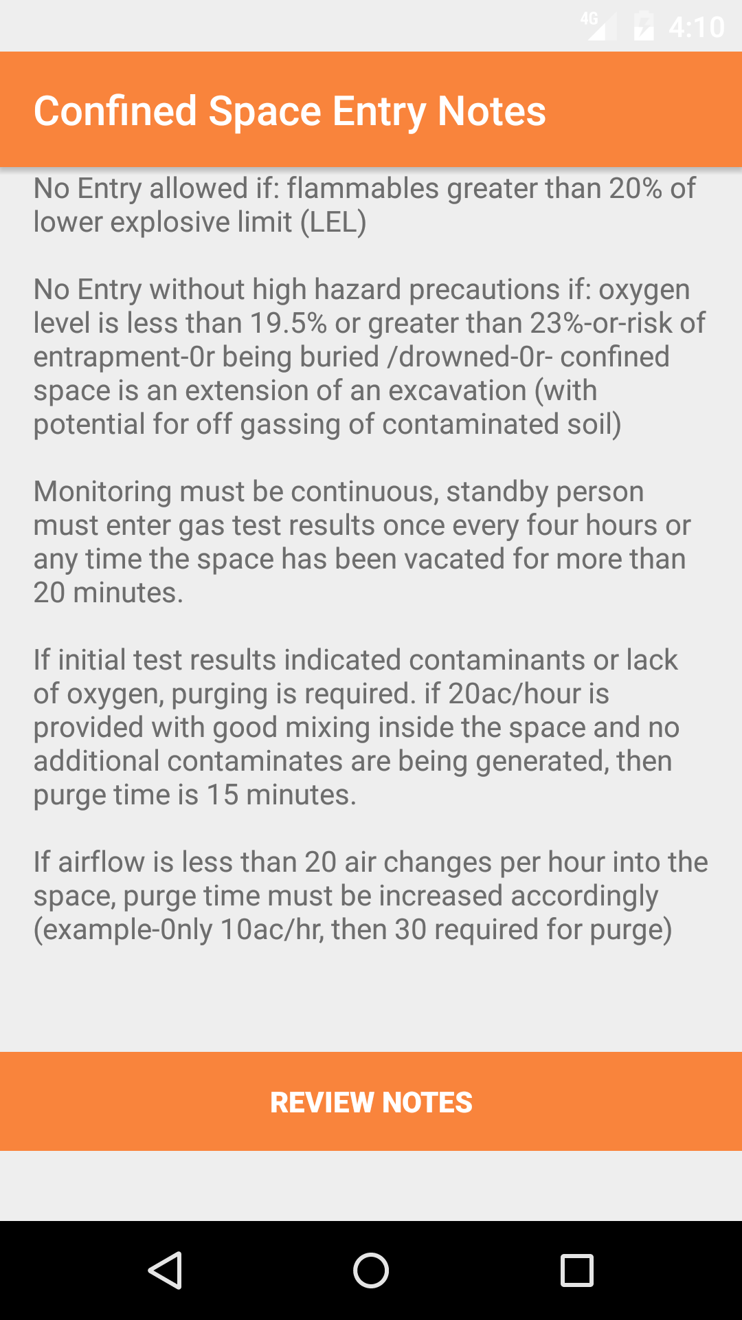 Companies create their own confined space review notes, which staff must review every time they perform a confined space entry. The notes will load on this view