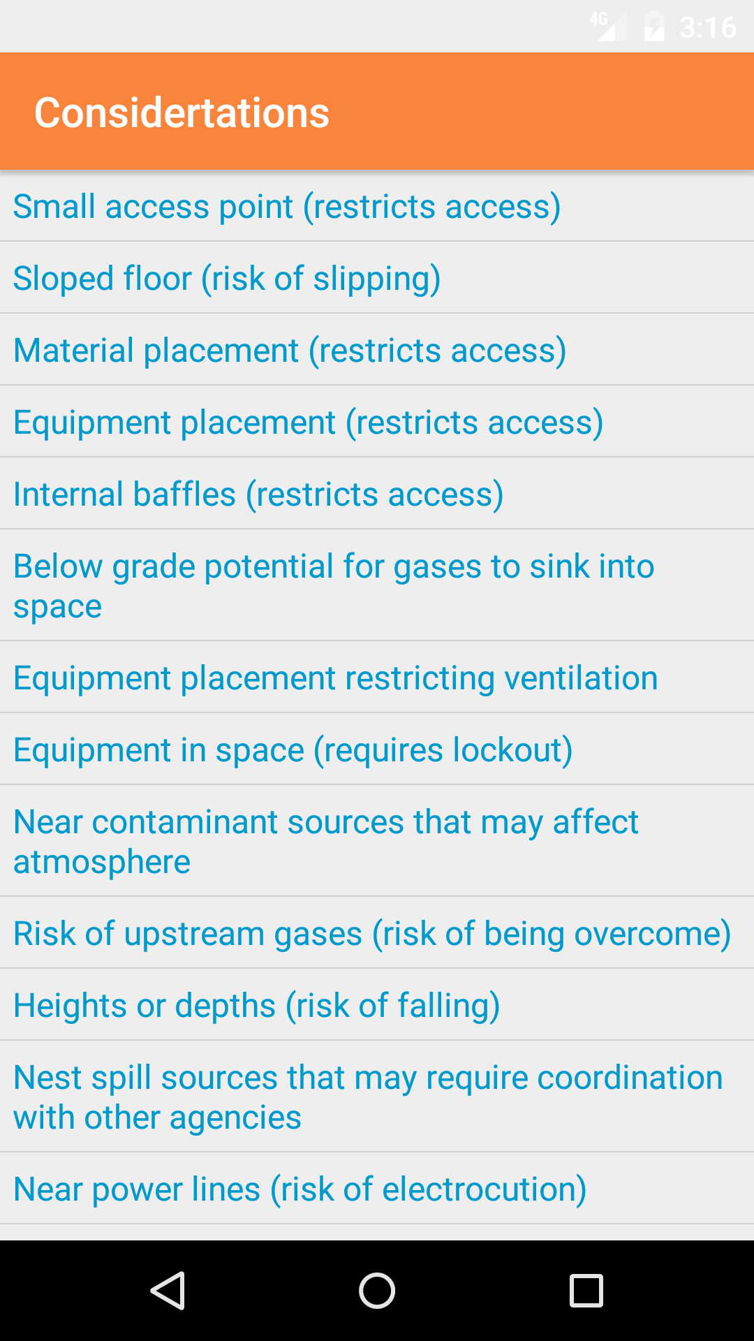 - Tap the Considerations button to load the list of considerations that should be considered during the entry to the confined space.