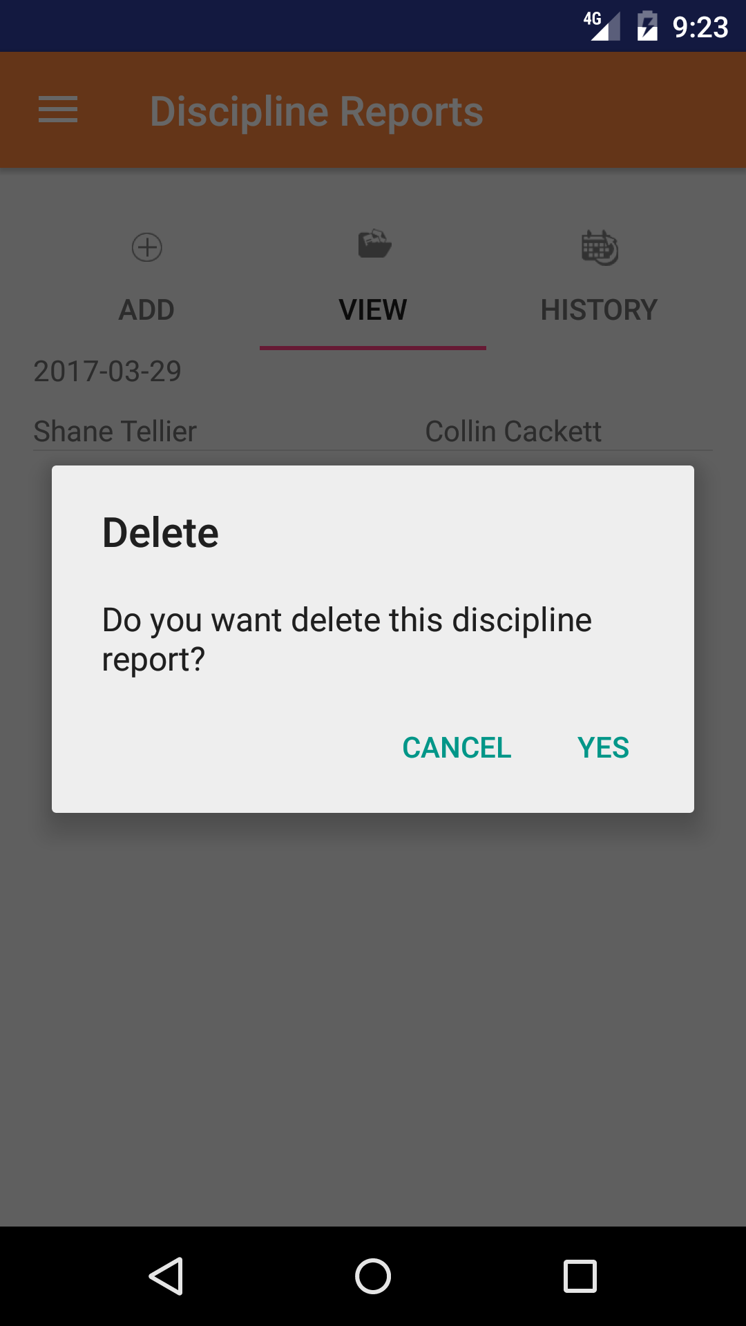 - Long Tap the disciplinary report to bring up the delete screen for the disciplinary report.