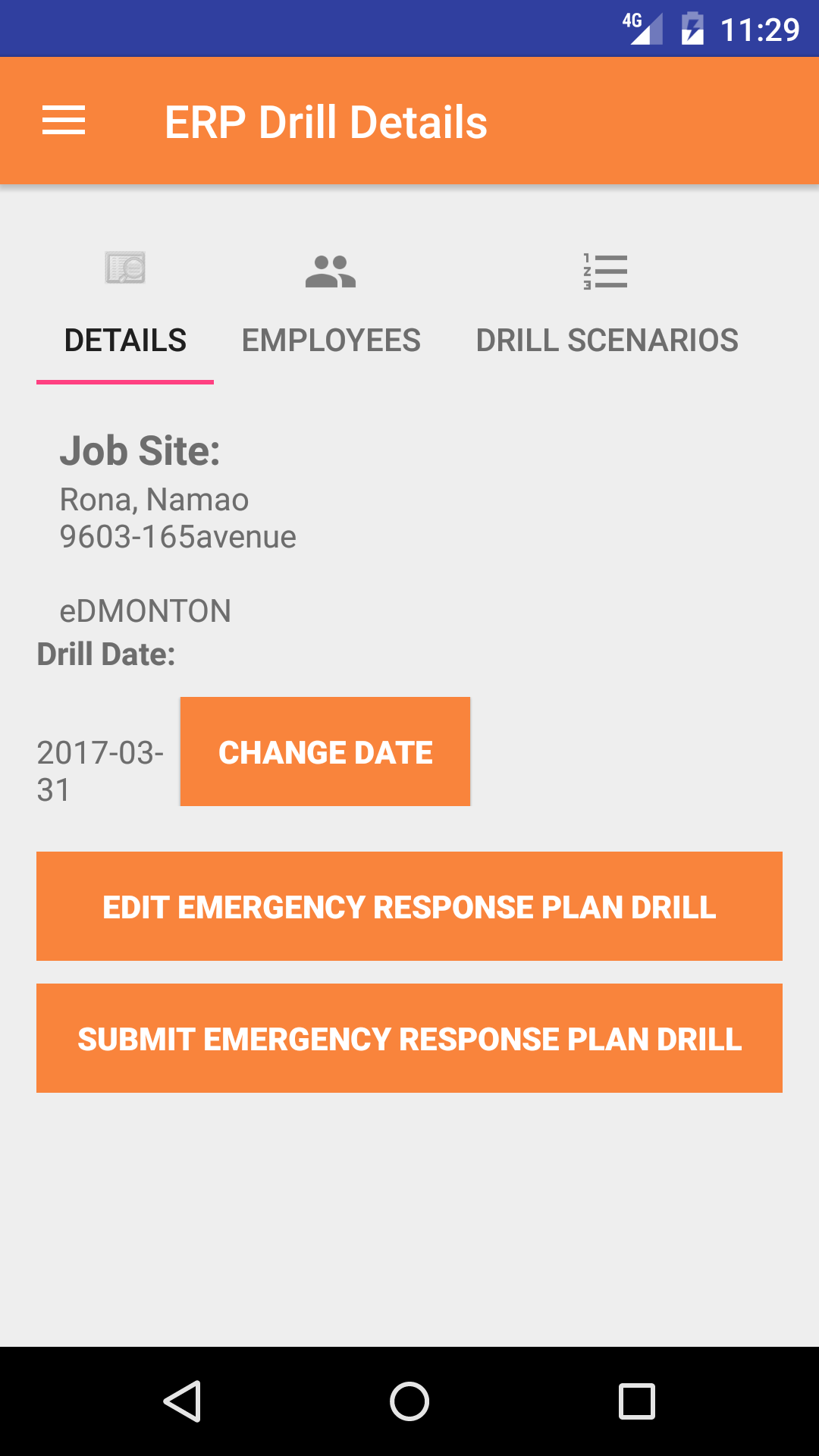 The screen loads with emergency response plan drill date in black text and job site name in black text.