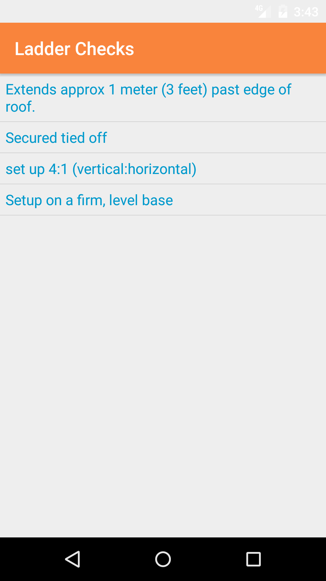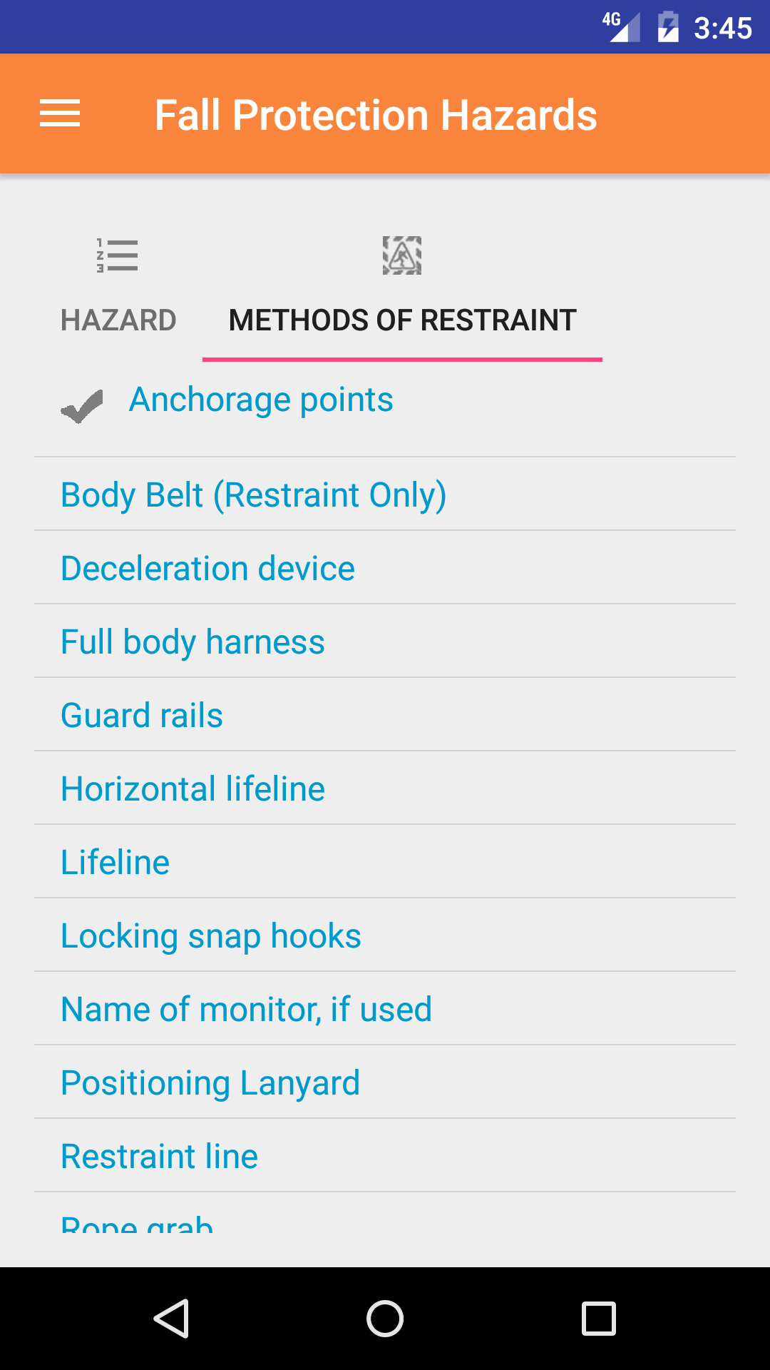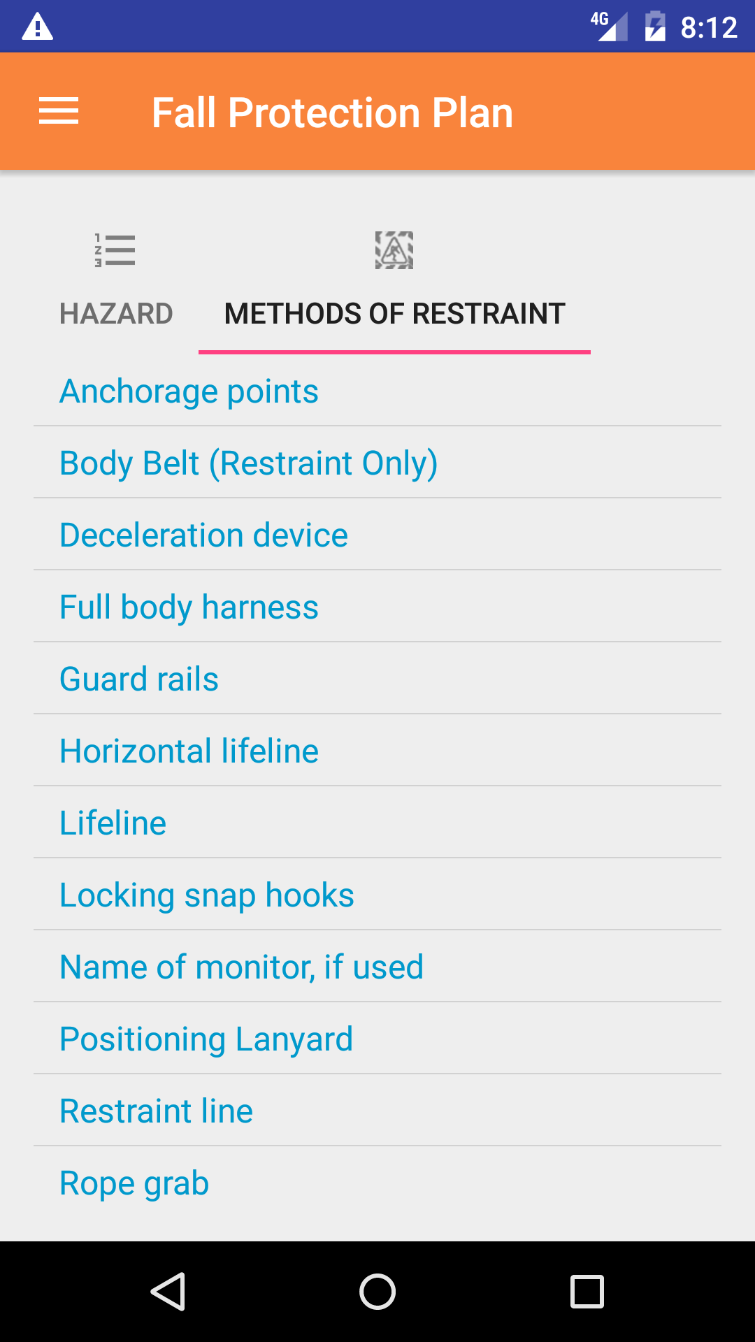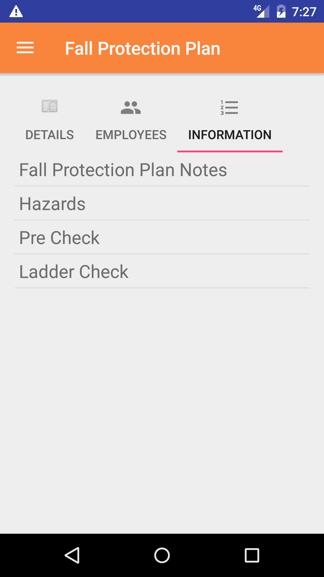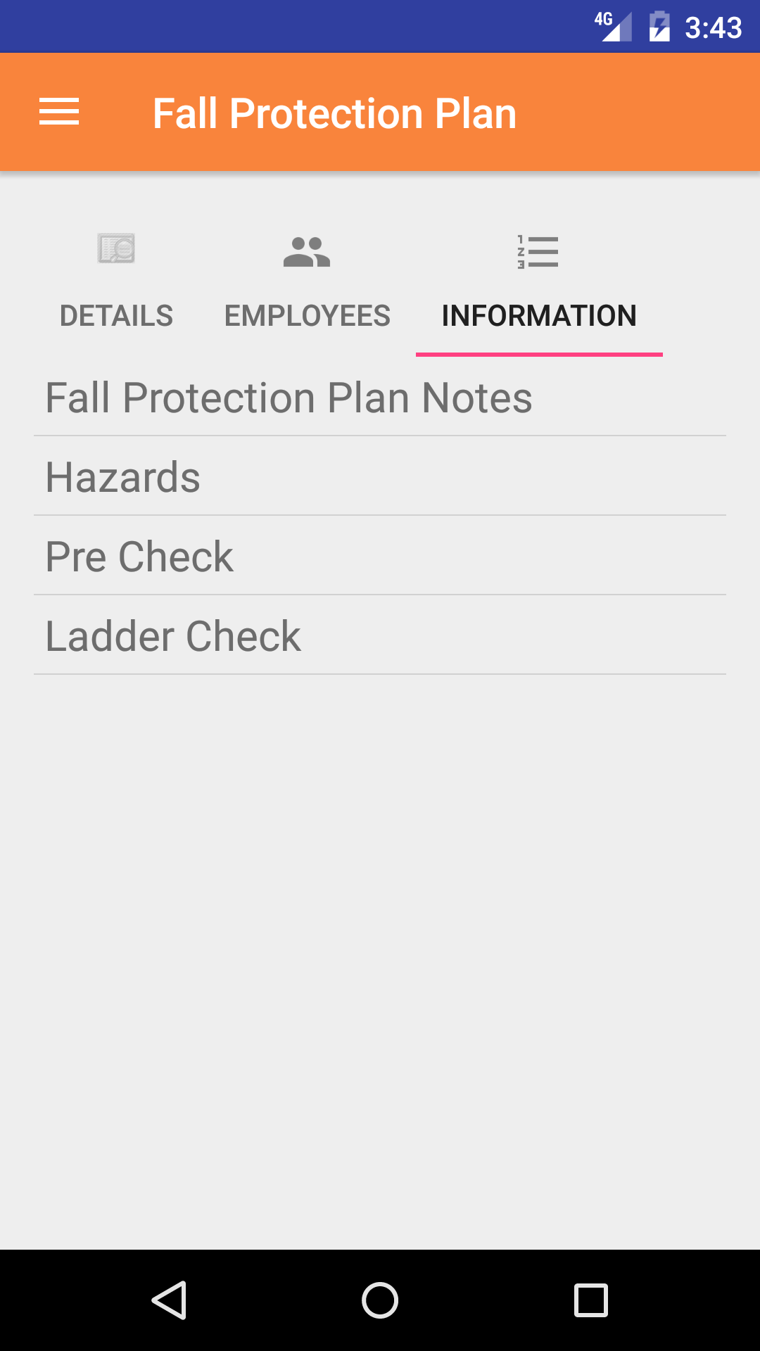 with the list of the 4 categories of the fall protection plan. Tap on each to view details on each section
