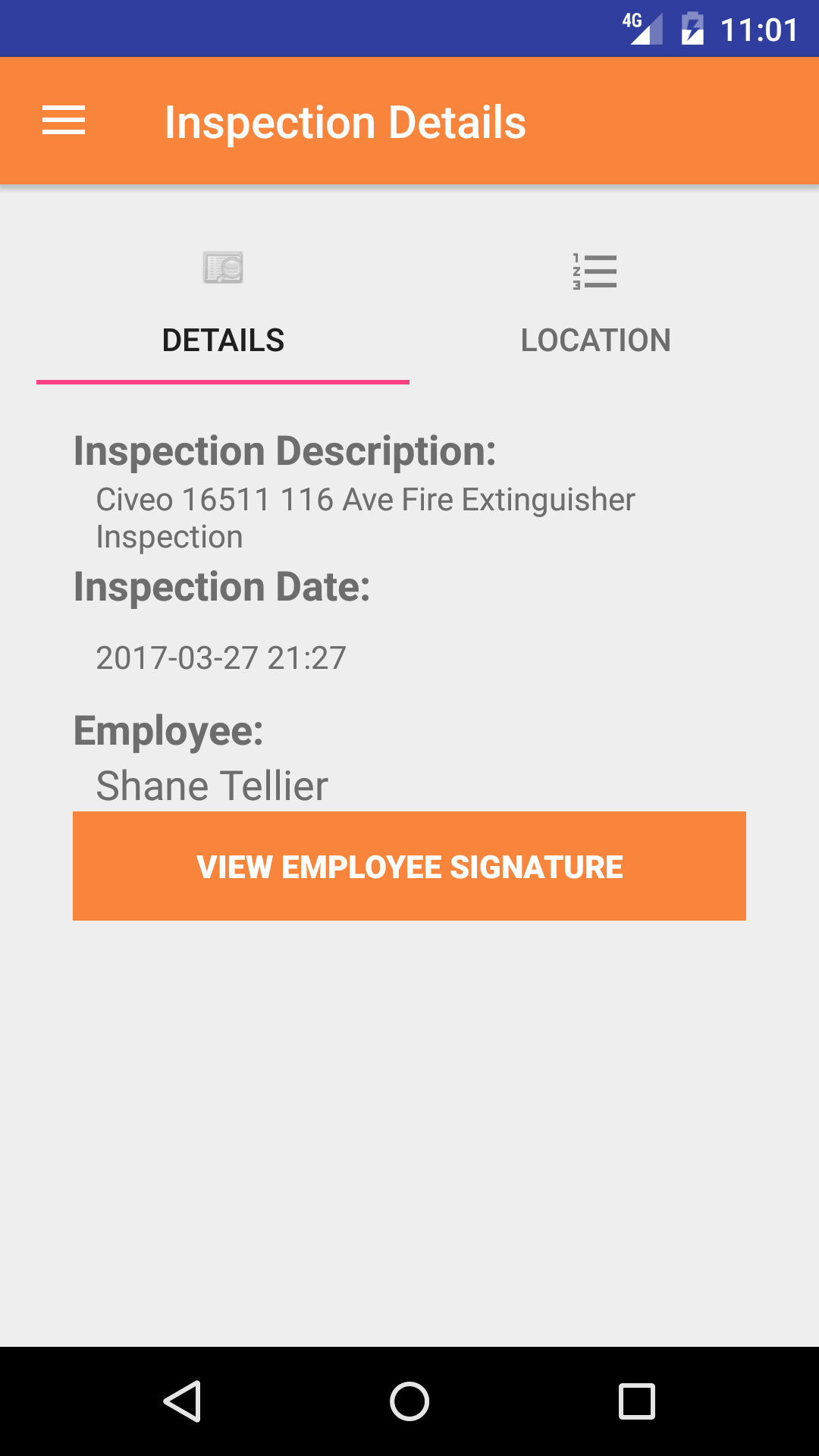 - Tap on the Fire Extinguisher Inspection you would like to view. This loads the first tab, the fire extinguisher inspection details, which loads with the fire extinguisher
