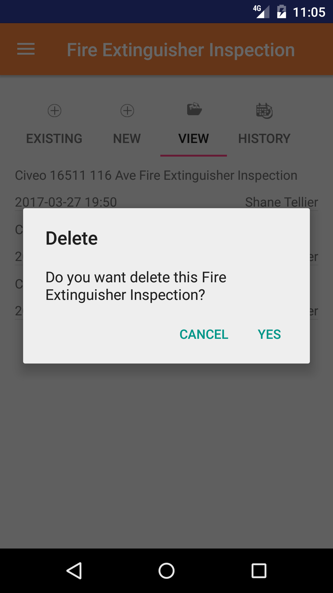 - Long Tap the fire extinguisher inspection to bring up the delete screen for the fire extinguisher inspection.
