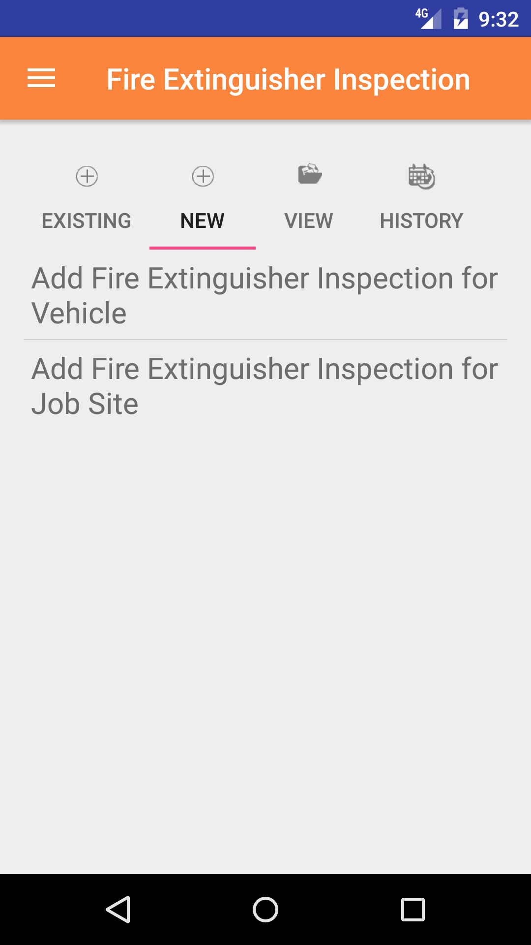 - Then tap the new tab on the top of the screen, this opens the Add Fire Extinguisher Inspection From Job site or Vehicle choose screen.