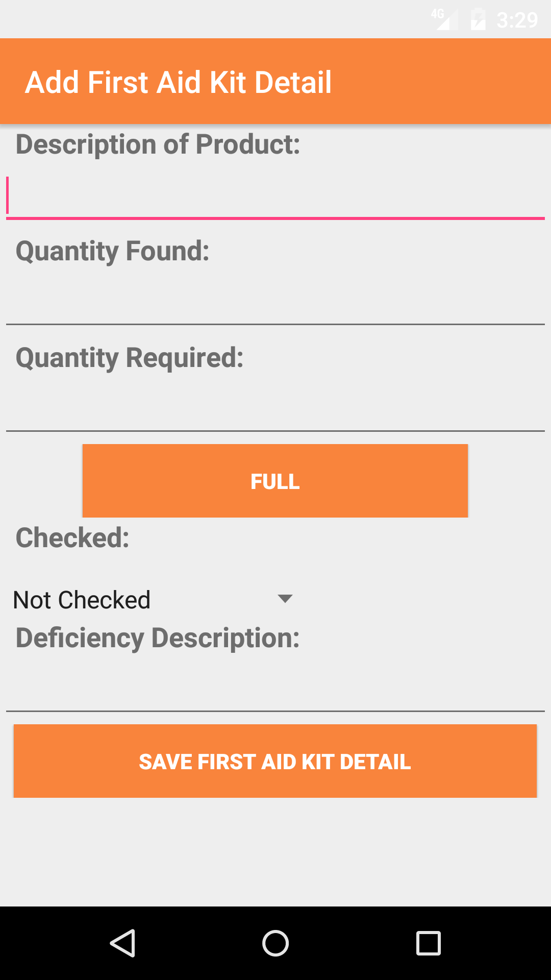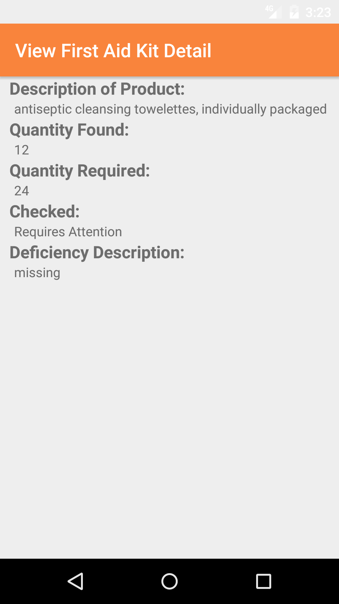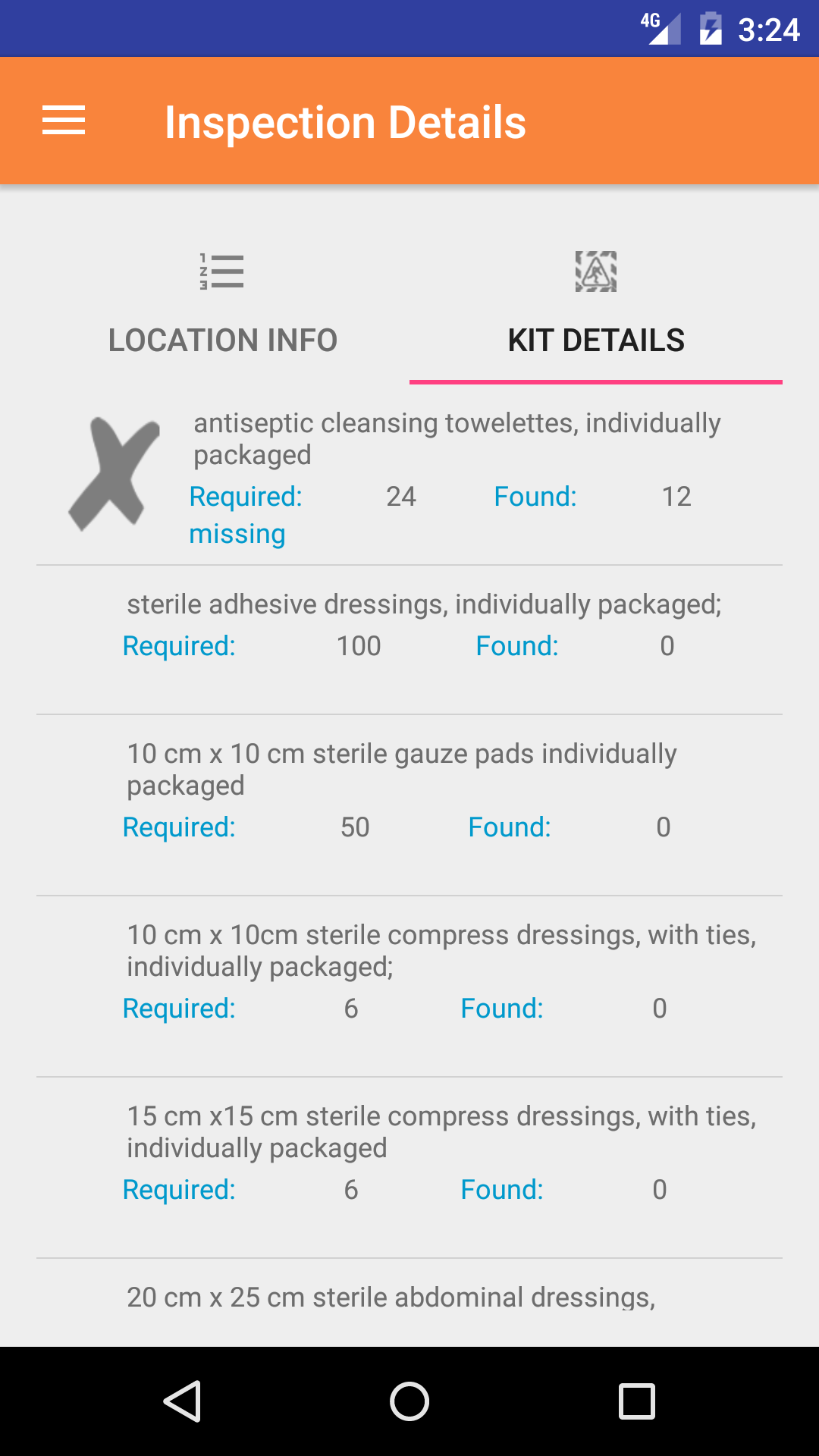 opens with a list of first aid kit details with the product description and quantity required and quantity found in