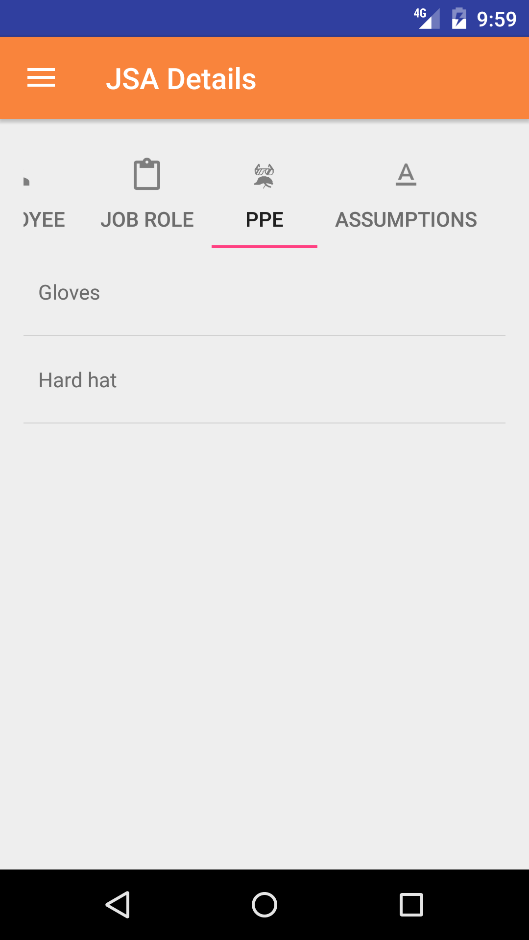 - Tap the fourth tab, the PPE tab of the History view. This loads the list of the personal protective equipment that were added for the Job Safety Analysis.