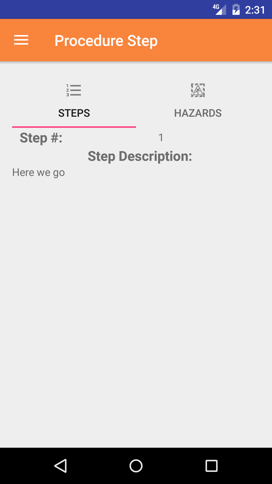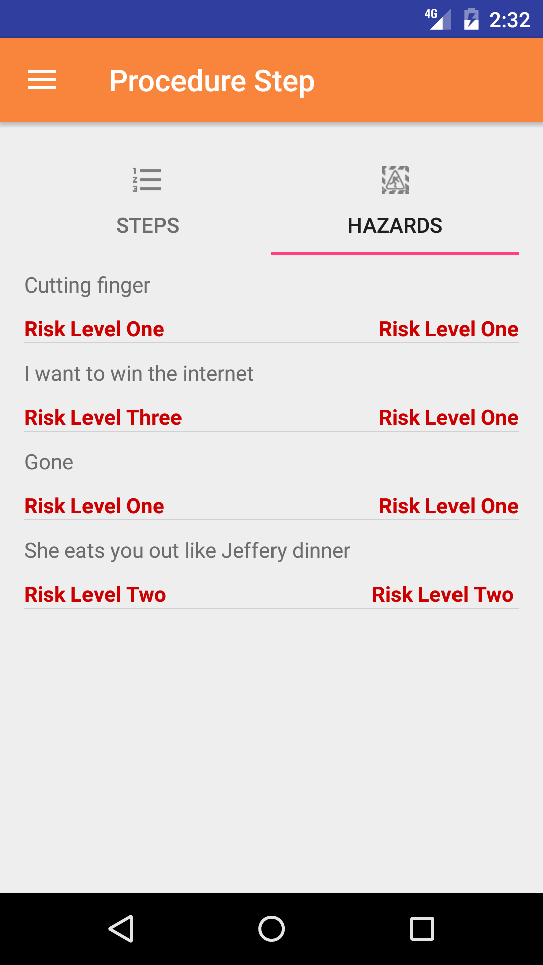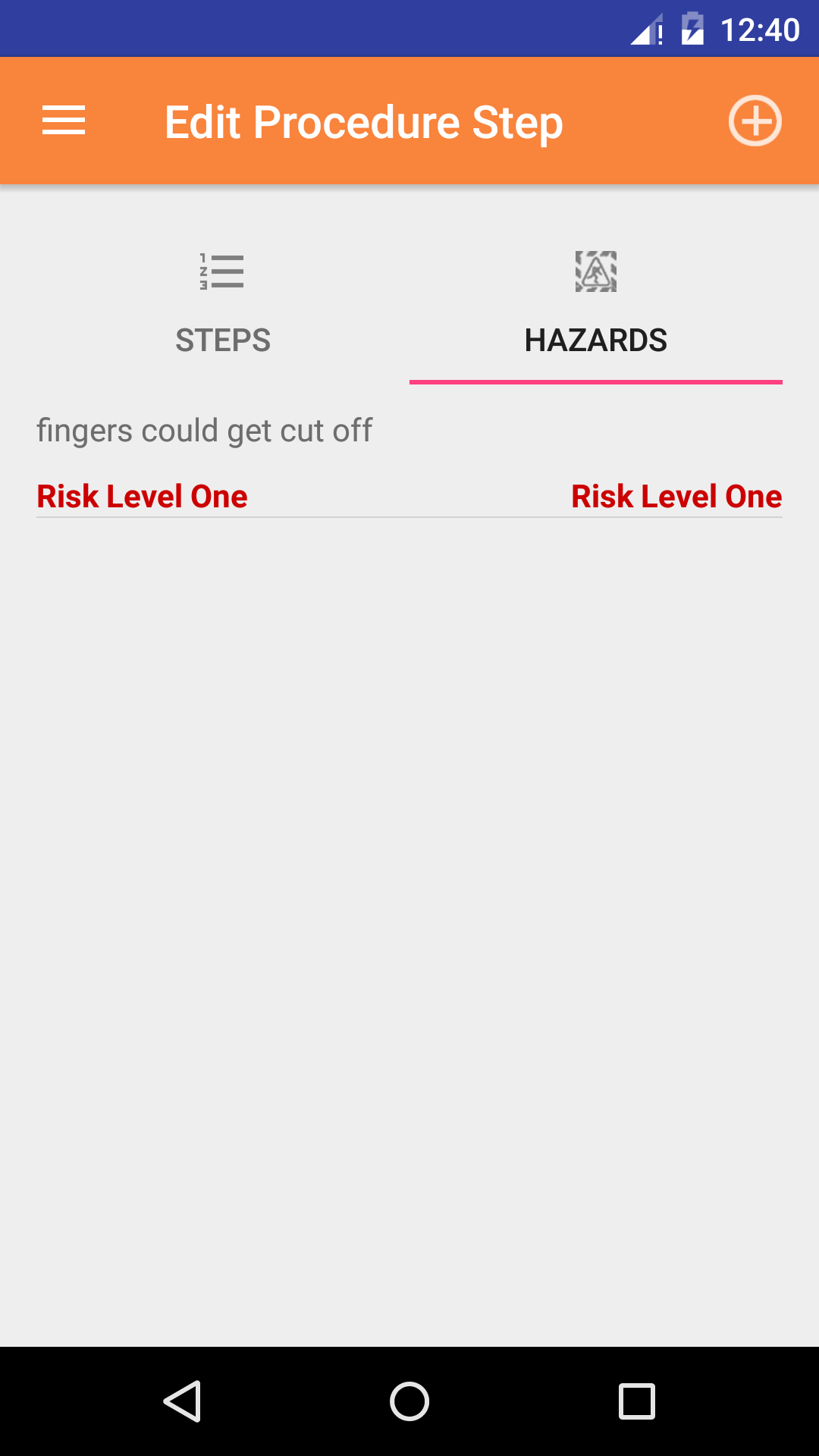 - Tap on a Steps, to load the Steps Hazard view. This loads the list of Step Hazards of a Step, displaying the hazard description, and the risk level of each task hazard.