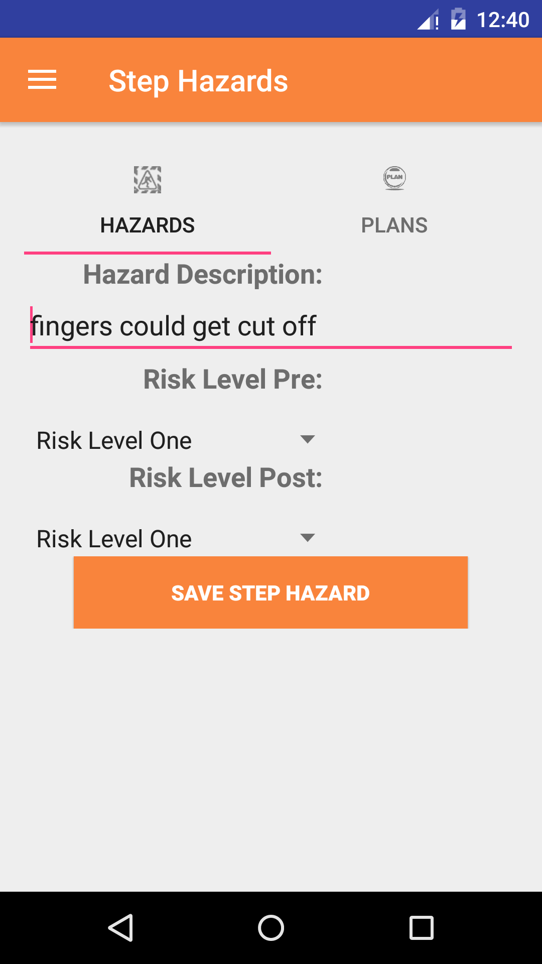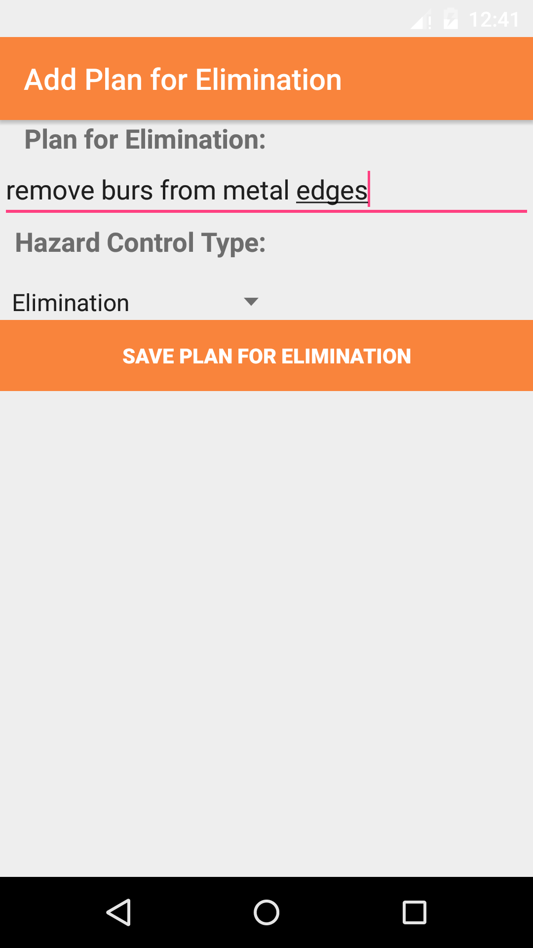 - Tap on the second tab, the plans for elimination tab of the edit task hazard view.