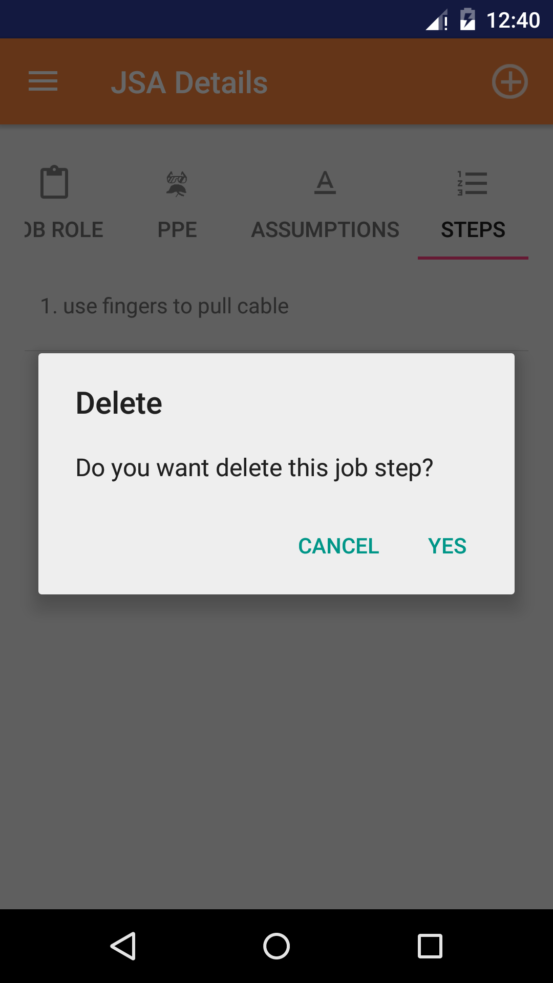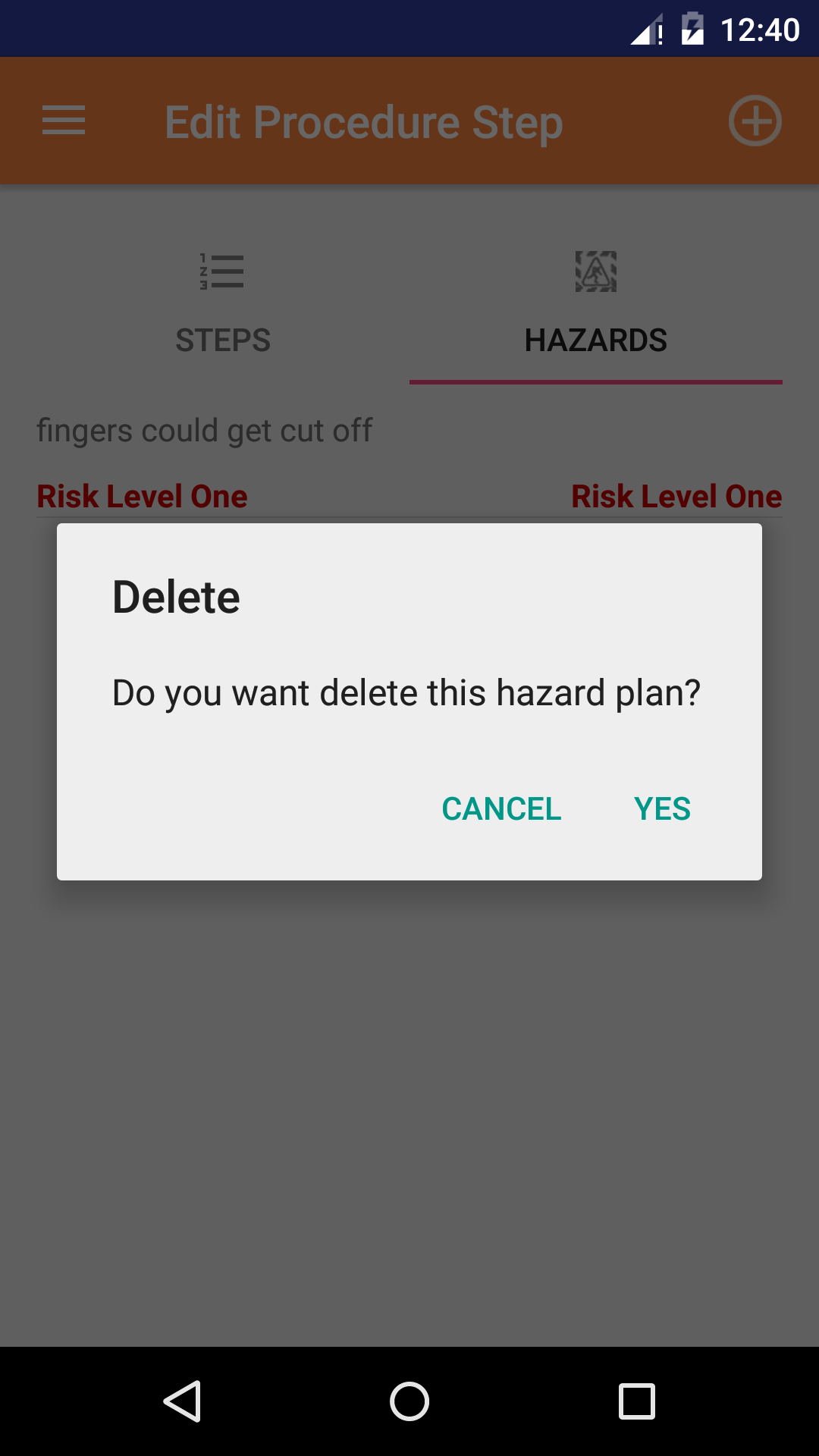 - Tap the Delete button. The step hazard will be deleted from the job safety analysis.