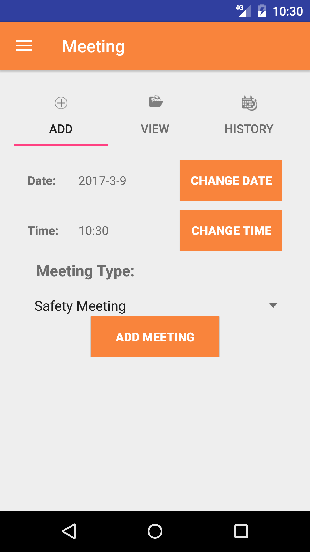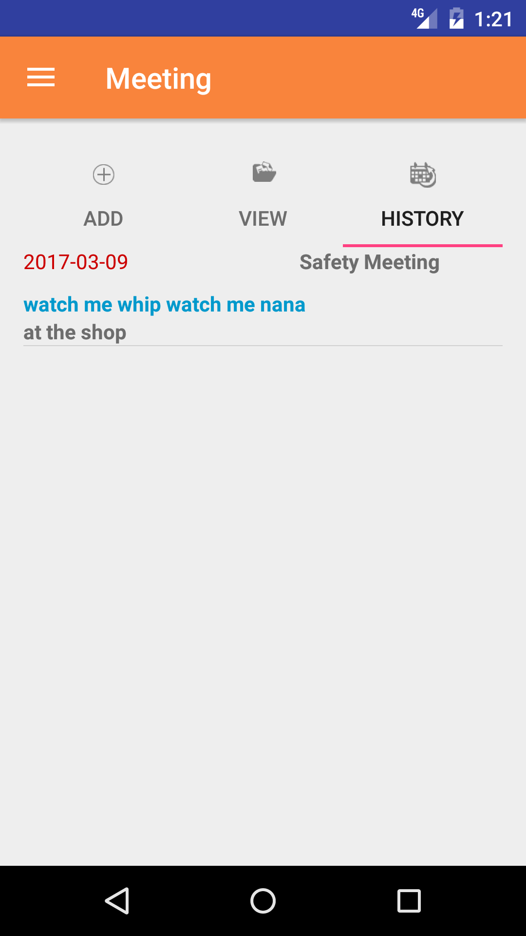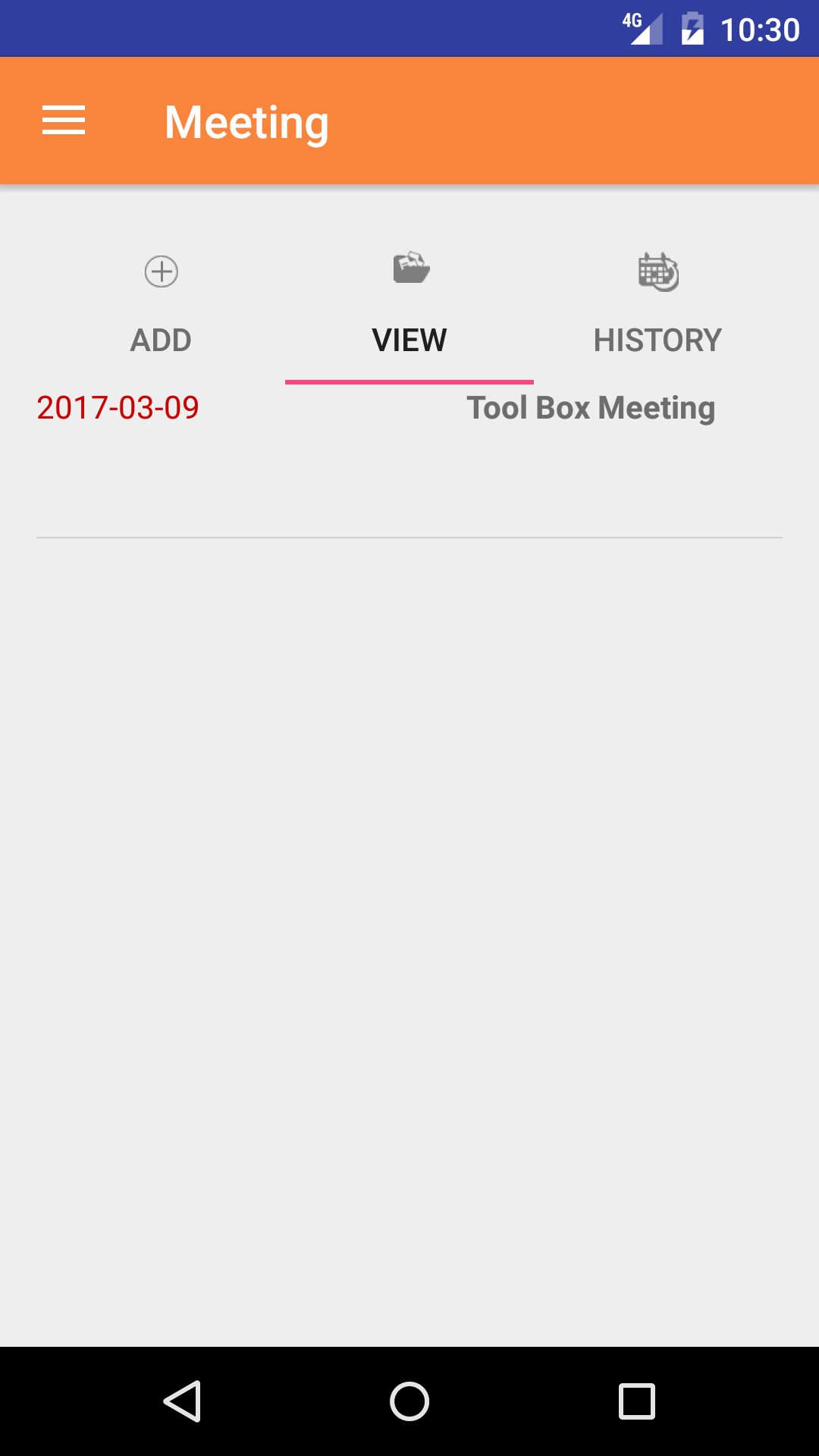 - Tap the third tab on the menu, the History tab of the main menu view. This loads with a list of the closed out Meetings