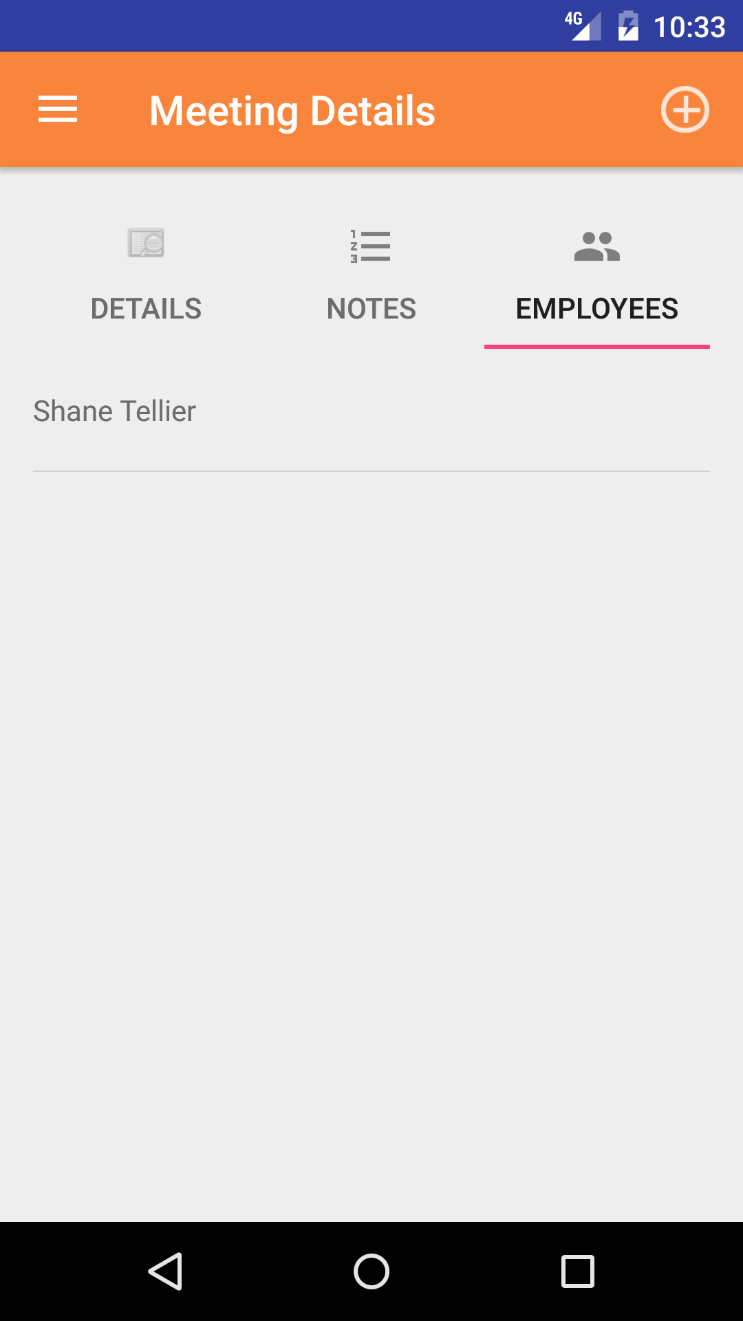 - Tap the Attendees icon the third tab from the left on the bottom of the screen to open the Attendees screen. This screen loads with the employees currently included in the meeting.