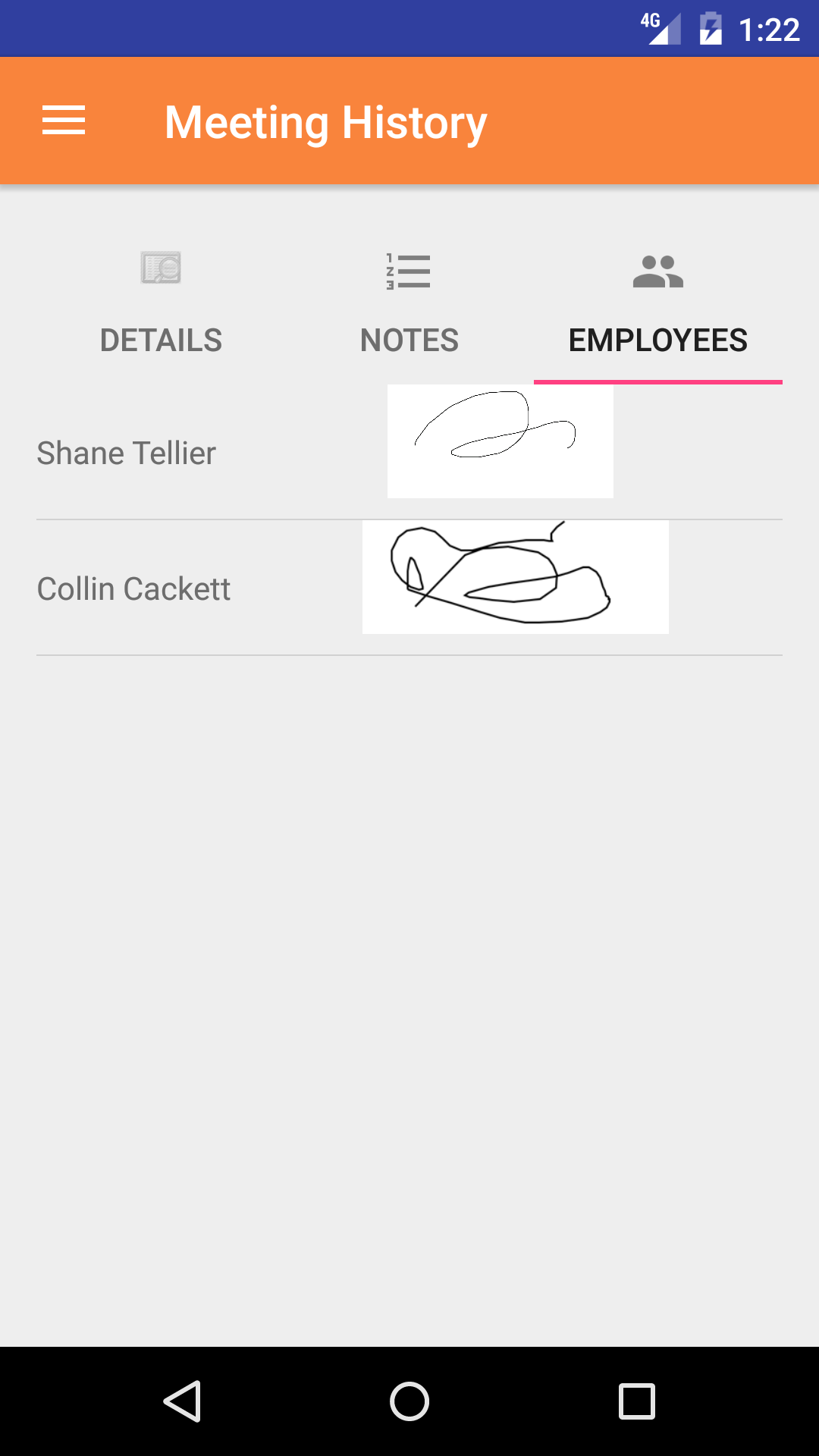 - Tap the fourth tab, the Meeting Attendee's tab of the History view. This loads with the employee's names and their signatures