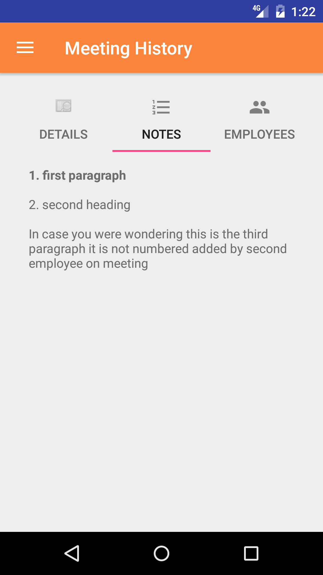 - Tap the Edit button on the top right hand corner of the screen to open the meeting notes detail screen. This lists headings in blue and paragraphs in black. If a paragraph is to be numbered the number will appear