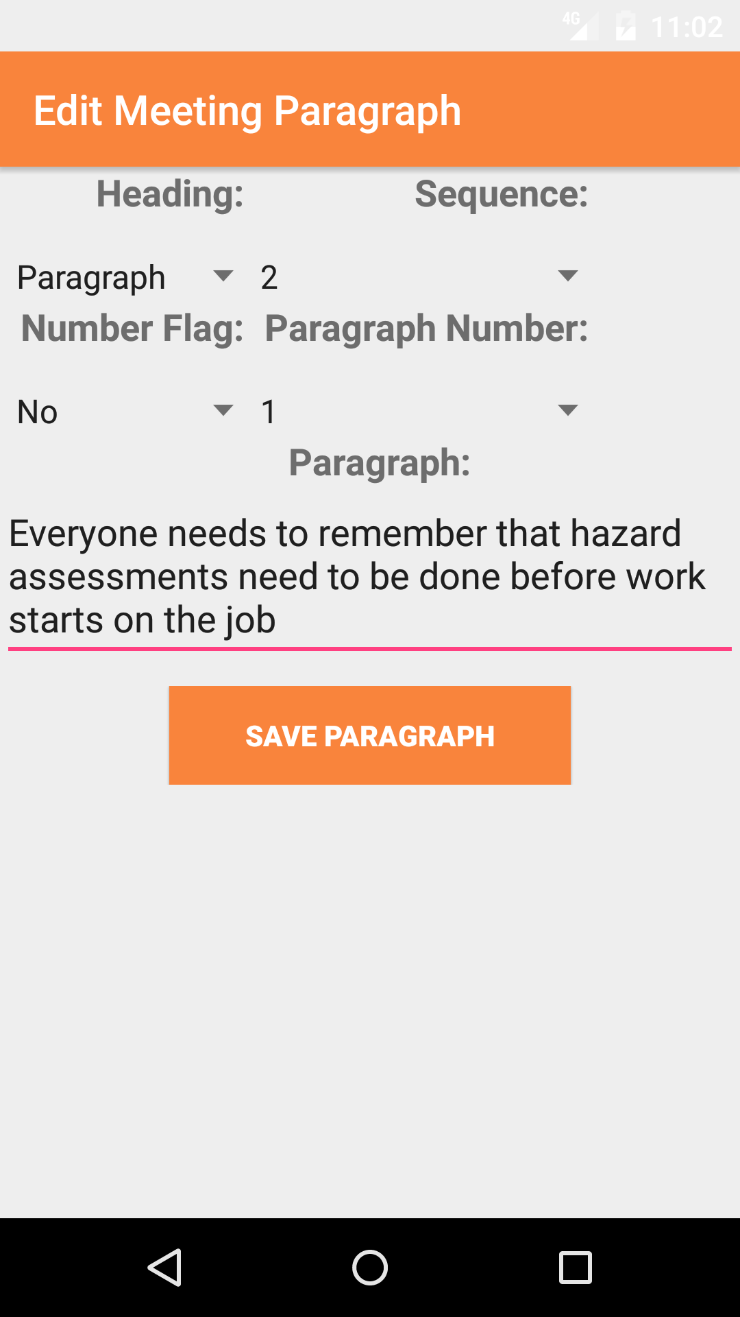 - Sequence #: The Sequence # field allows field staff to order the paragraphs of a safety meeting in any order they see fit, select from the select box the number you want the paragraph to be ordered as.