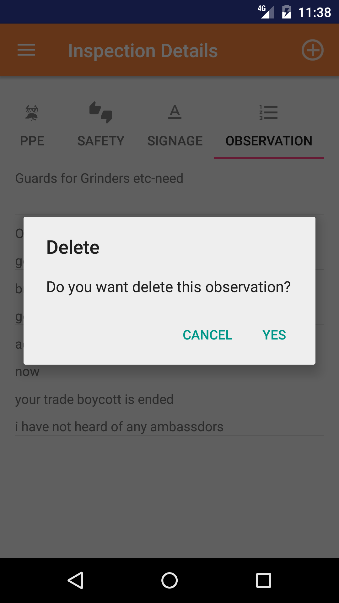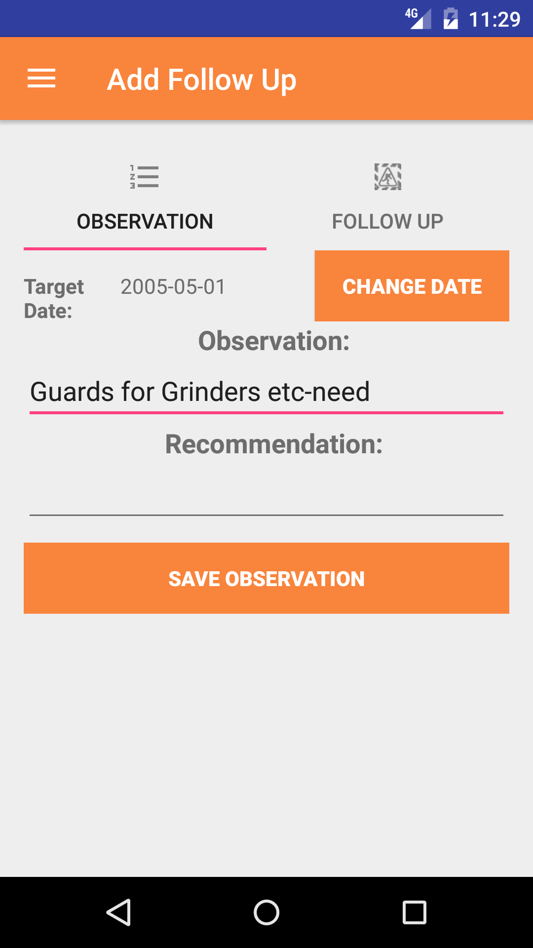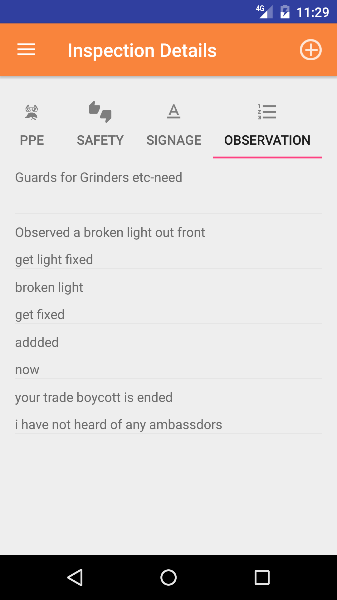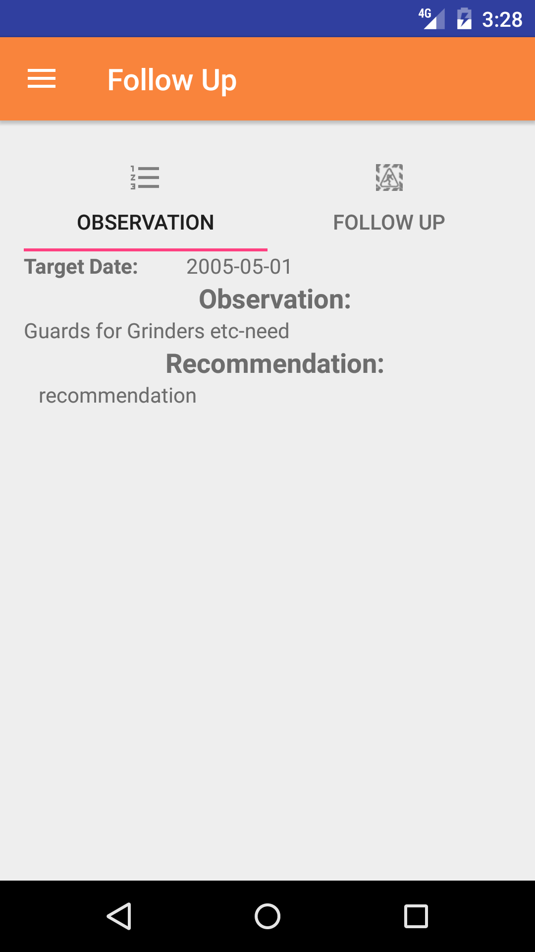 - Tap the Observation icon, the third tab. This opens the list of observations, observation/deficiency and recommendation in black text.