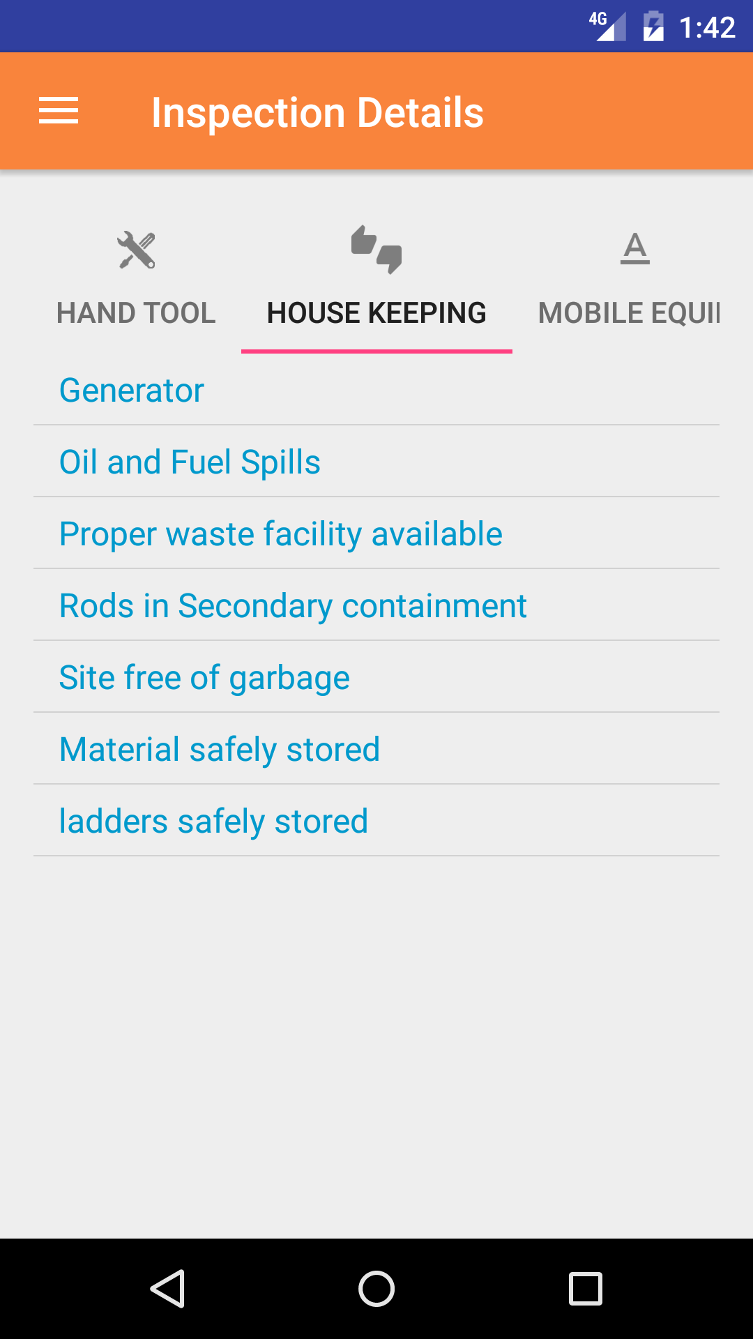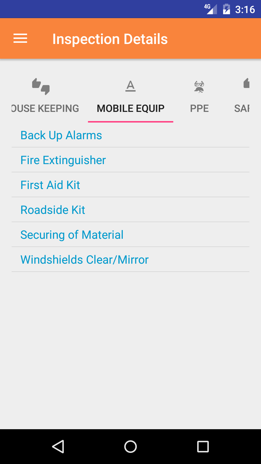 with the list of the 6 checklist categories of the safety inspection. Tap on each category to view the inspection tasks.