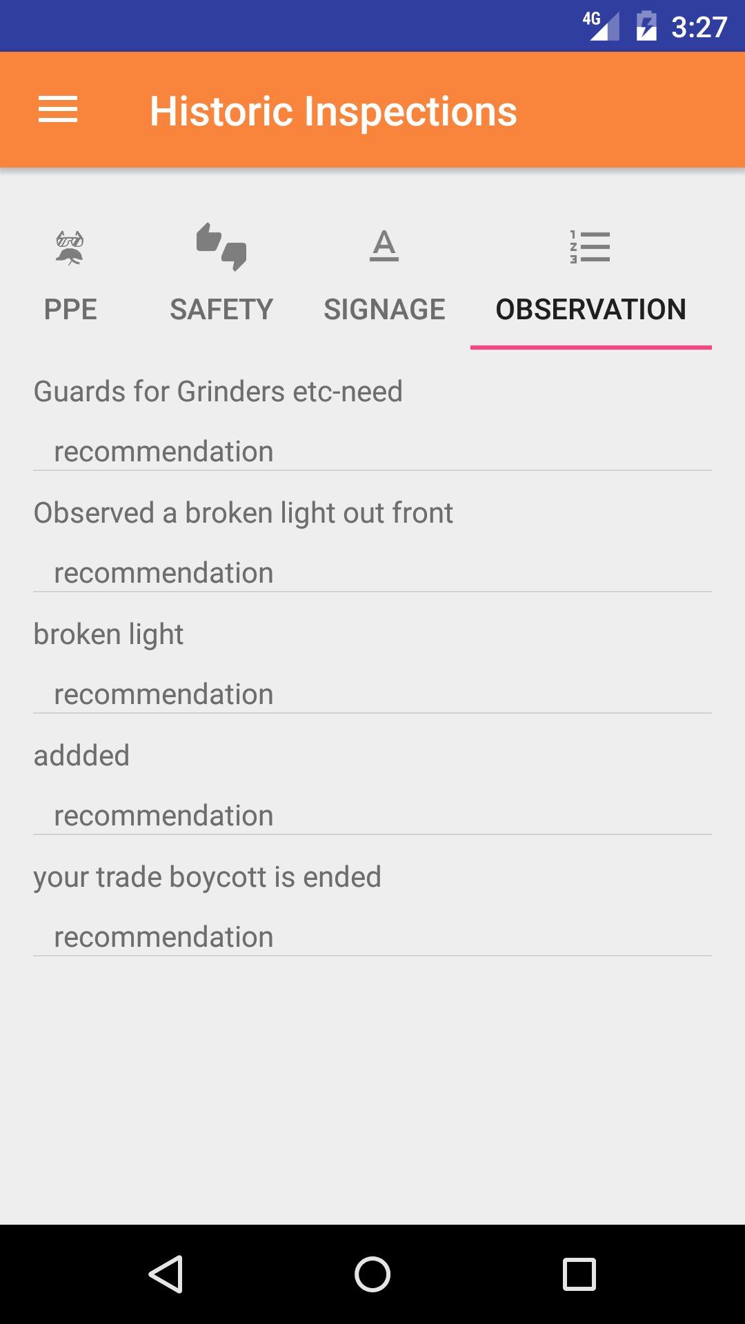 - Tap the Observation icon, the third tab. This opens the list of observations, observation/deficiency in red text and recommendation in blue text.