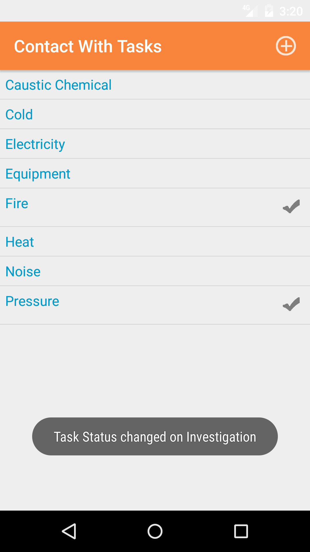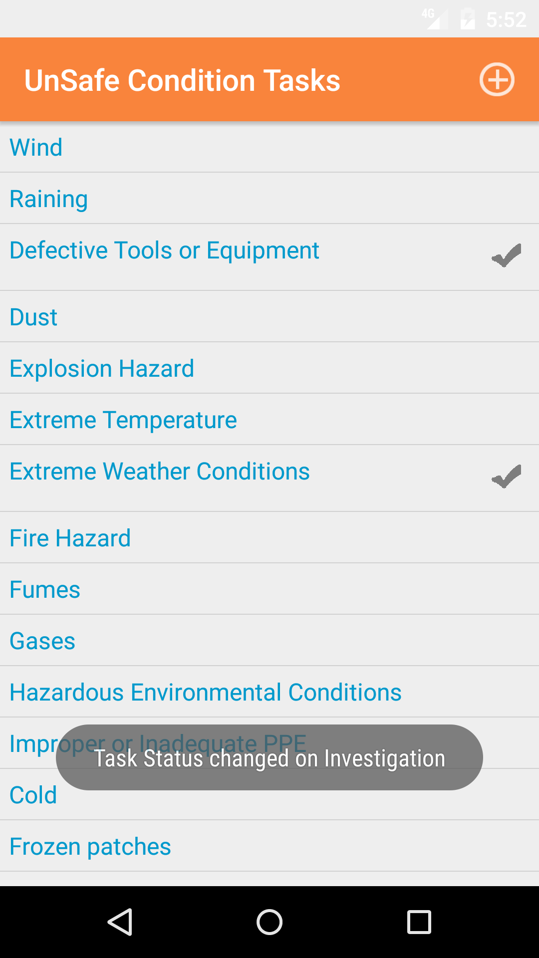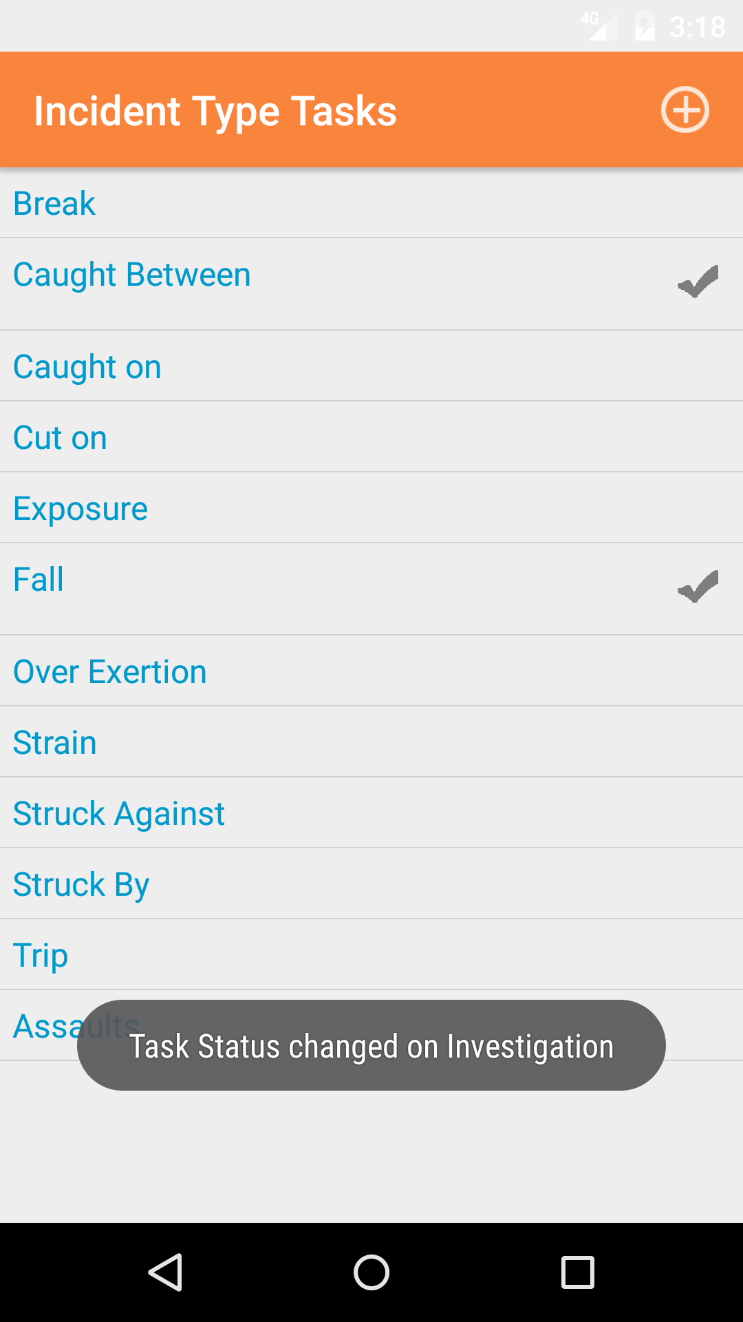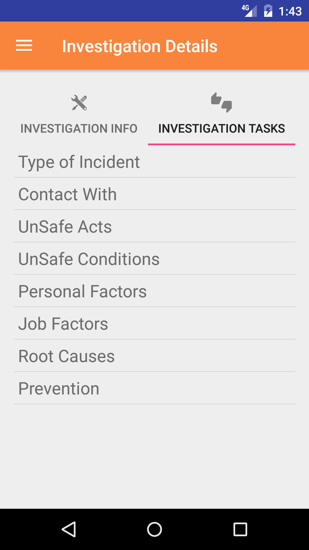 with the list of the 8 checklist categories of the safety investigation. Tap on each category to view the investigation tasks.