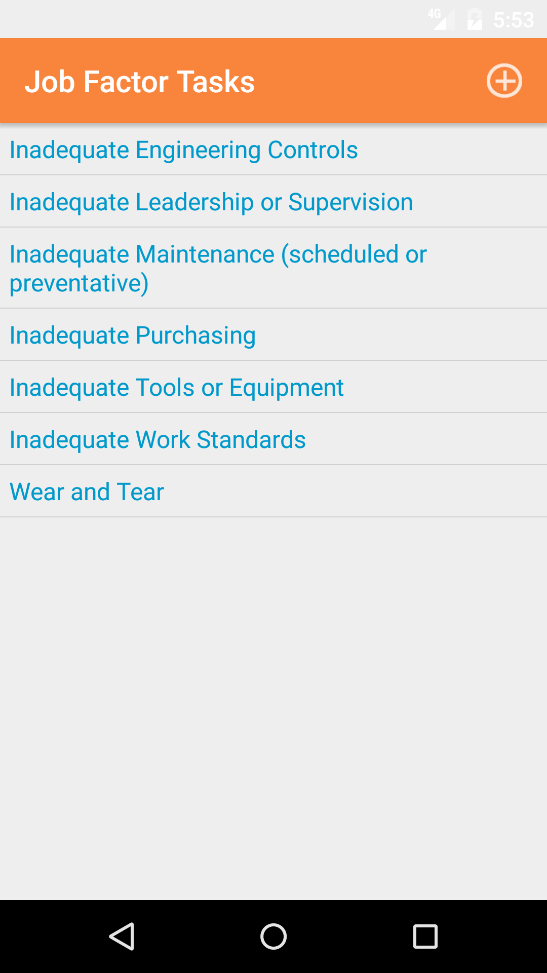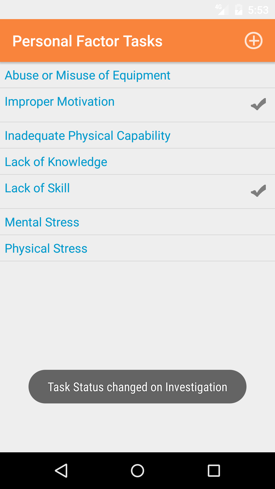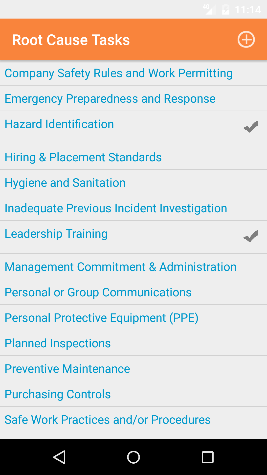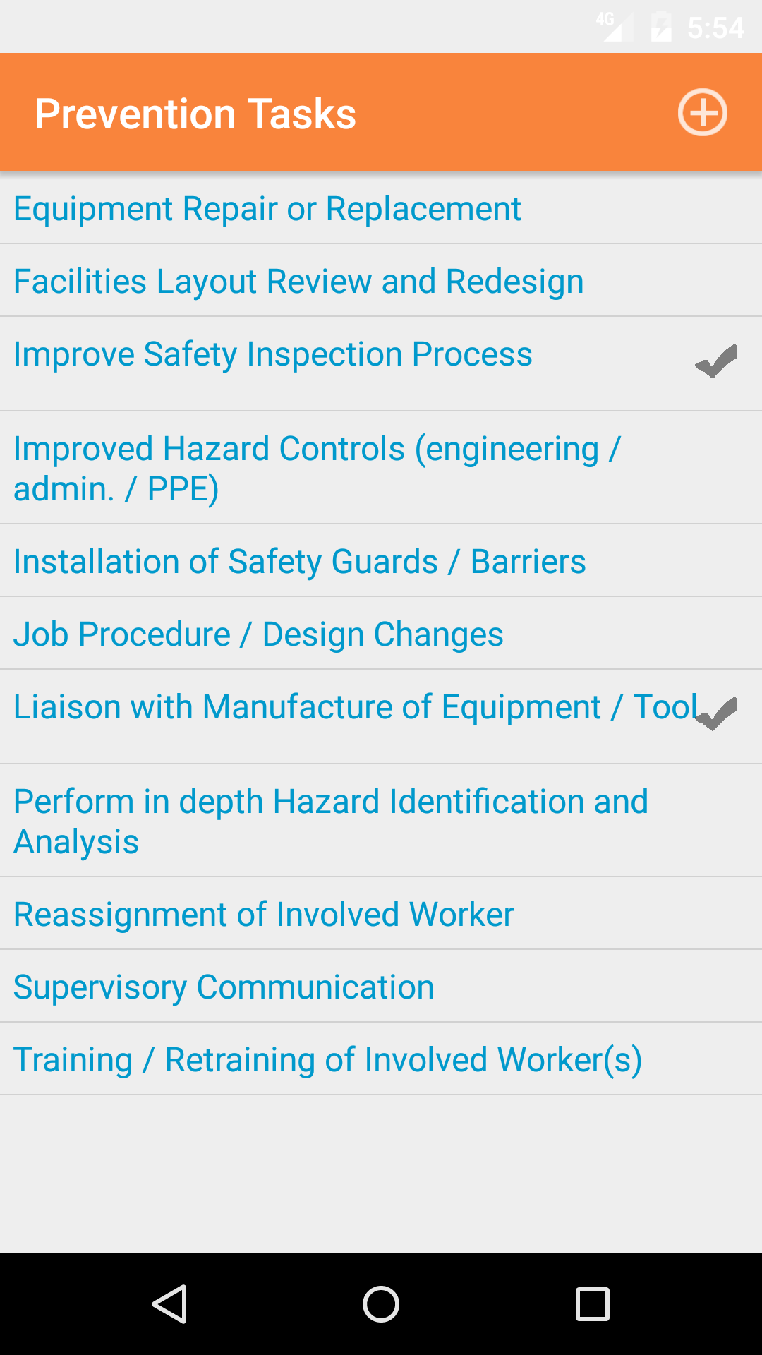 Personal Factors check list, Job Factors check list, Root Cause check list, and Prevention check list. Companies can build their safety investigation task lists from