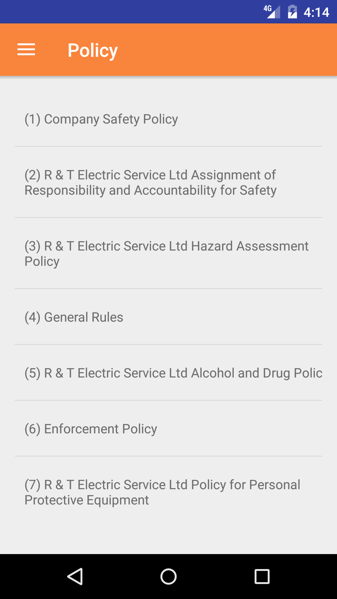 The safety policy section in the Android application allows companies to give field staff access to the safety policies of their safety program.